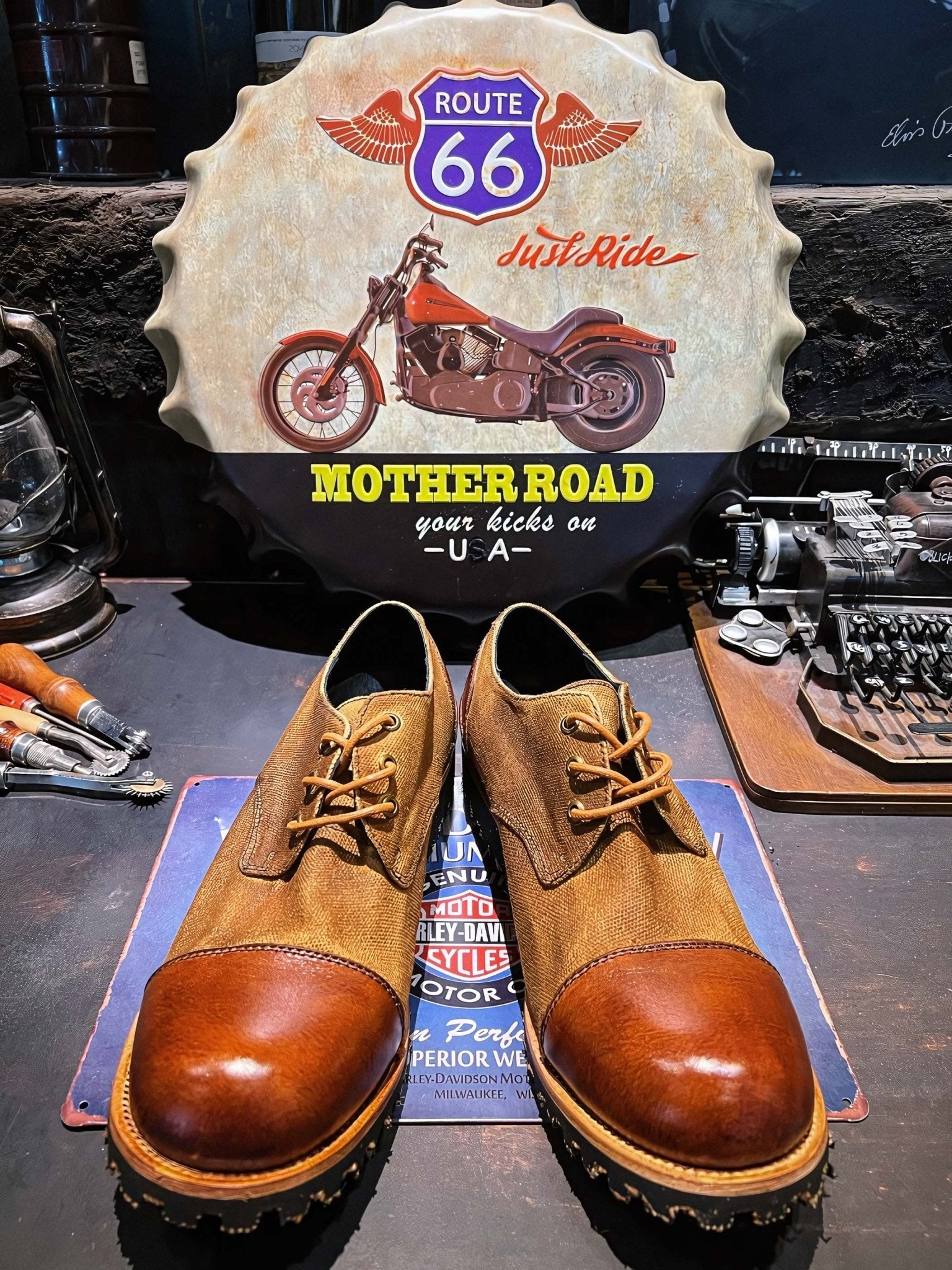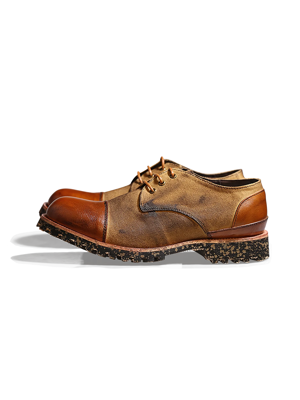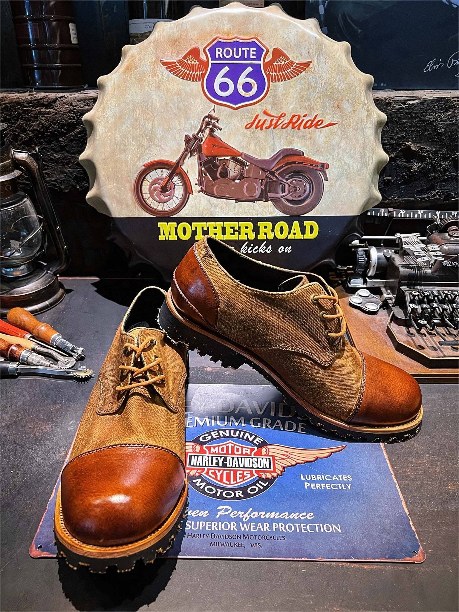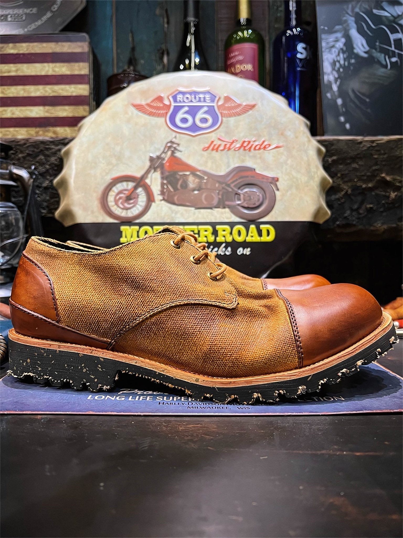 本革とキャンバスのコンビデザインは洗練されており、さりげなく個性を演出します。絶妙な配色のカラーリングがビンテージ感を満載させ、特に牛革の部分は光沢感があり、存在感が際立っています。日常のワークスタイルから旅行まで幅広く活躍するこちらの一足は、職人手作りの真のマーティンシューズであり、数少ない存在の一つです。ハンドメイドの製法によって生み出された特別なシューズを是非お楽しみください。