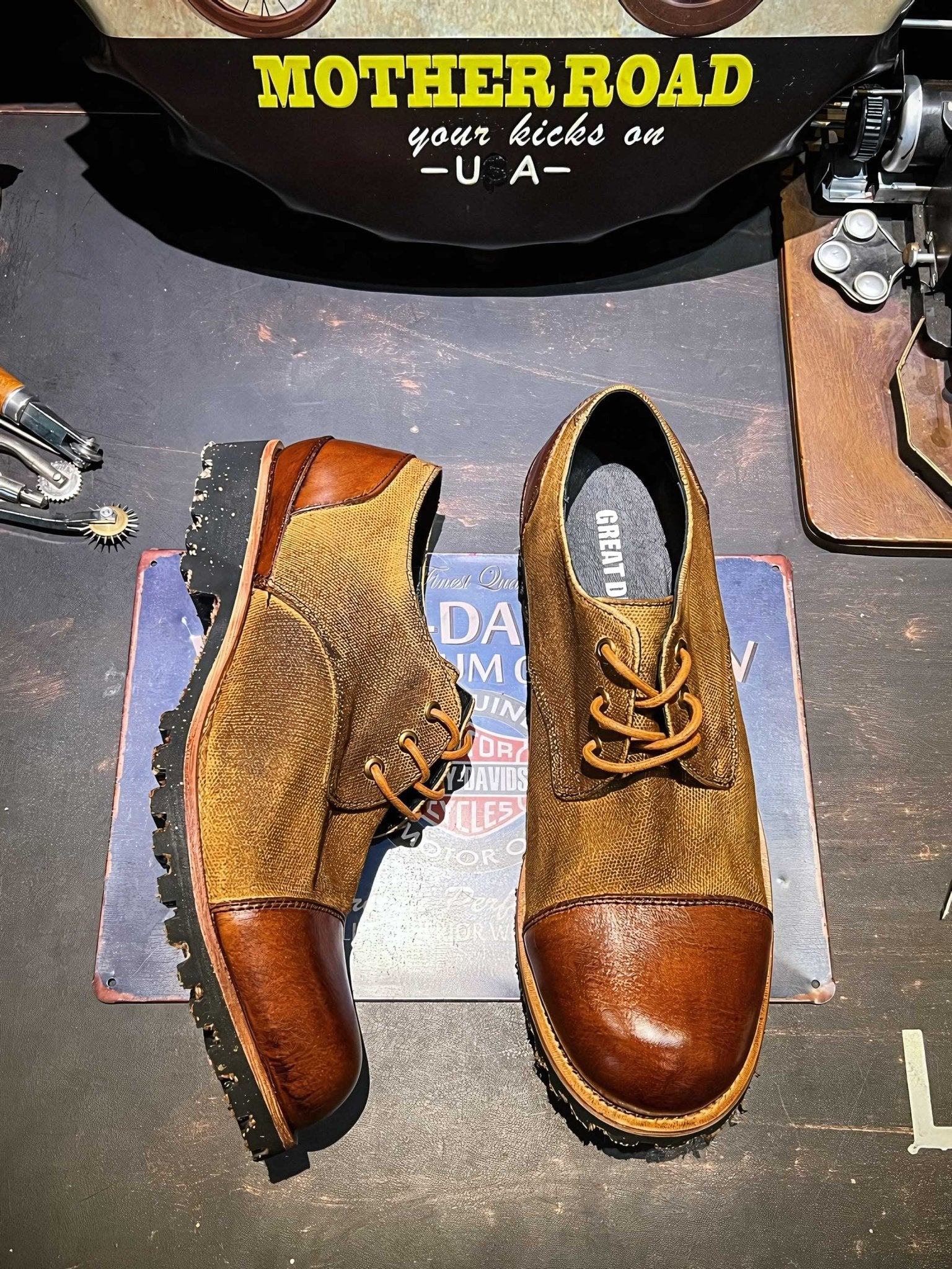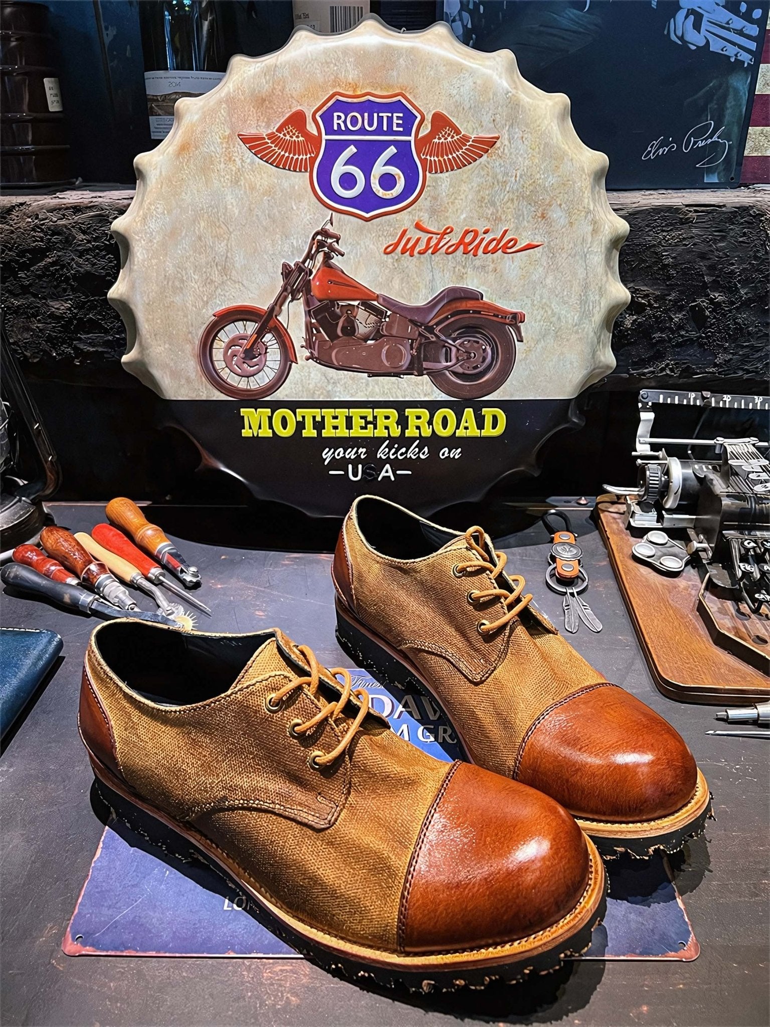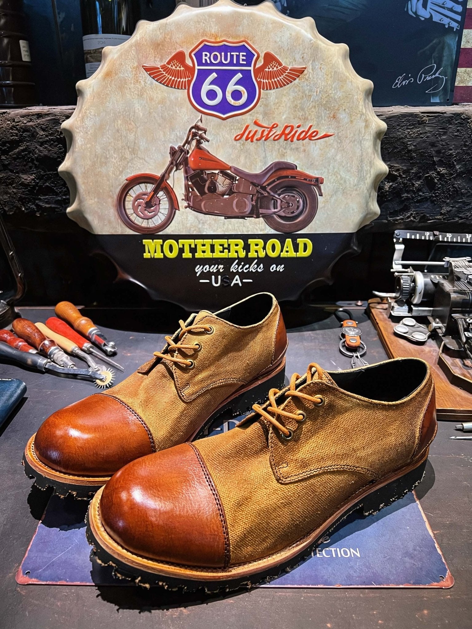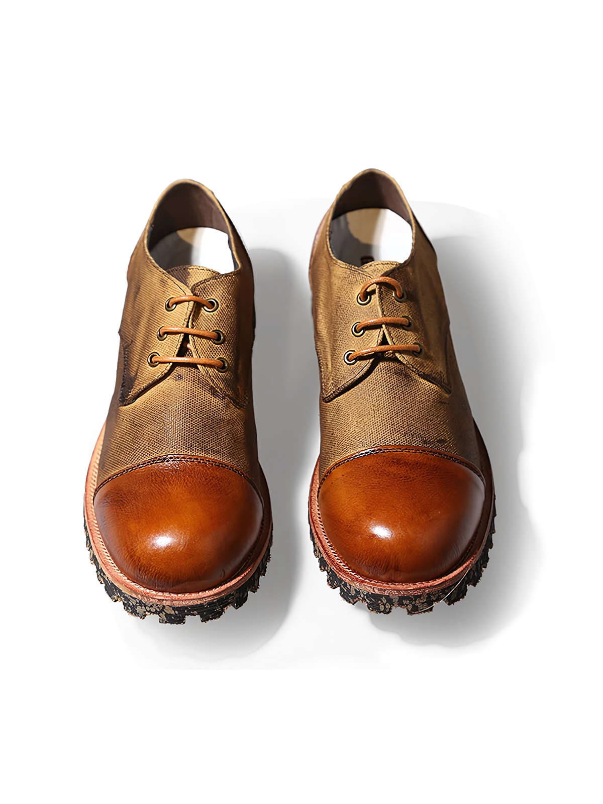 本革とキャンバスのコンビデザインは洗練されており、さりげなく個性を演出します。絶妙な配色のカラーリングがビンテージ感を満載させ、特に牛革の部分は光沢感があり、存在感が際立っています。日常のワークスタイルから旅行まで幅広く活躍するこちらの一足は、職人手作りの真のマーティンシューズであり、数少ない存在の一つです。ハンドメイドの製法によって生み出された特別なシューズを是非お楽しみください。