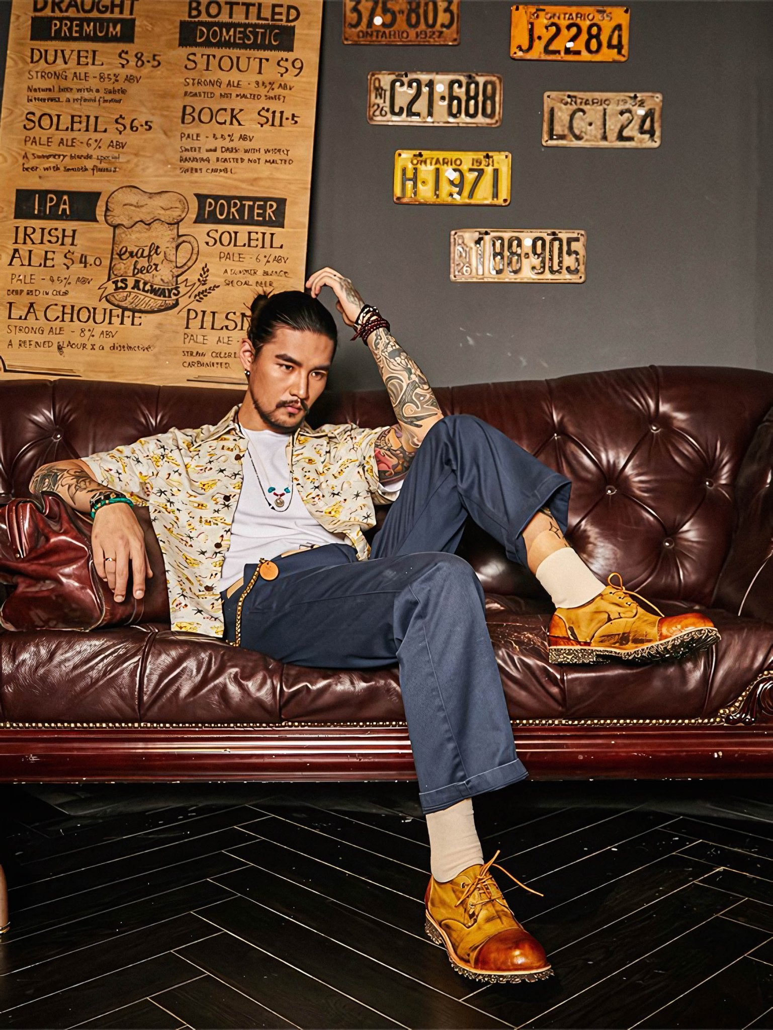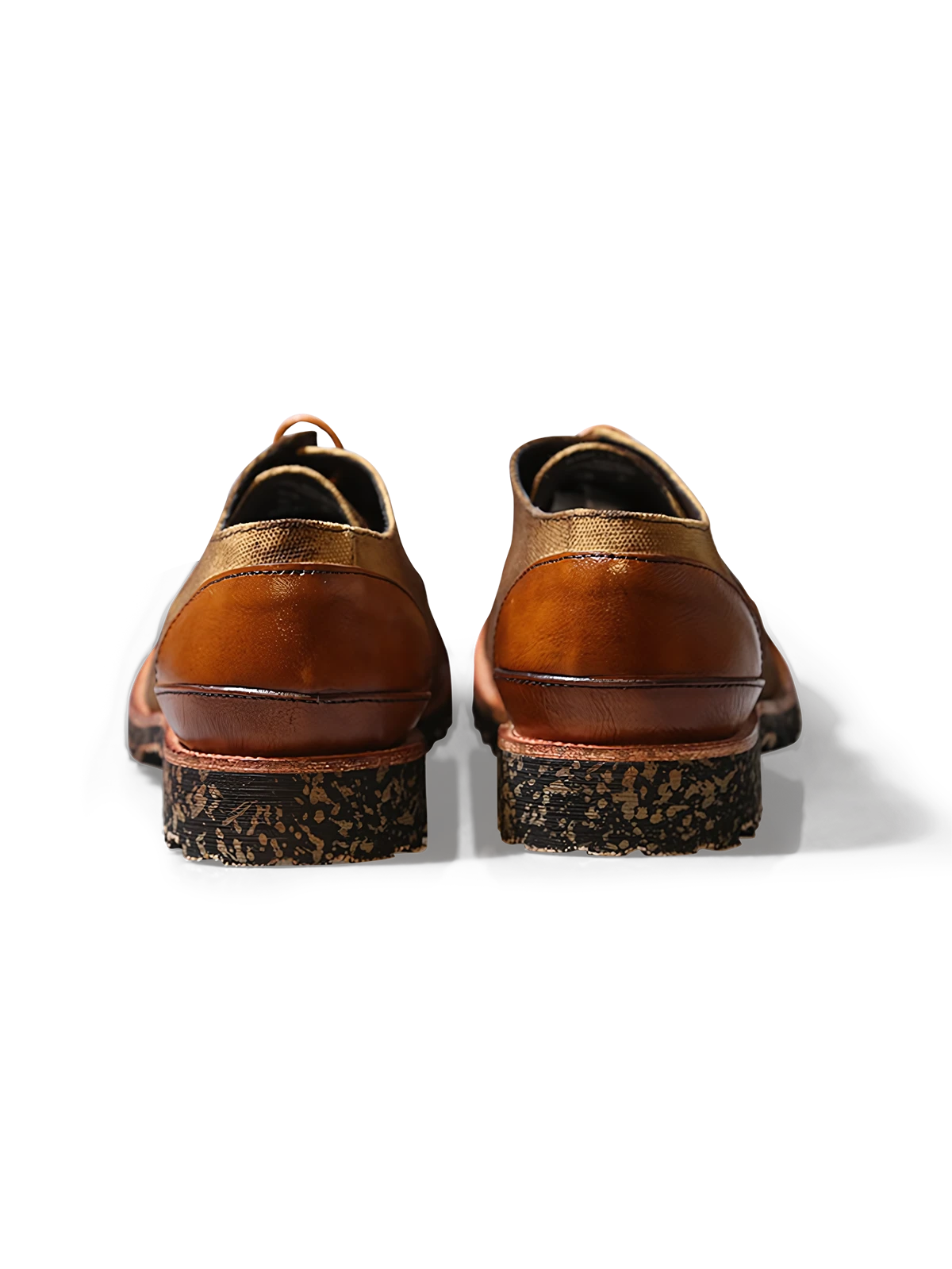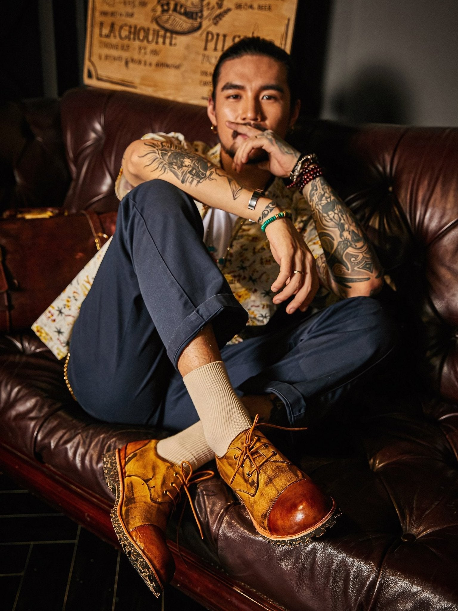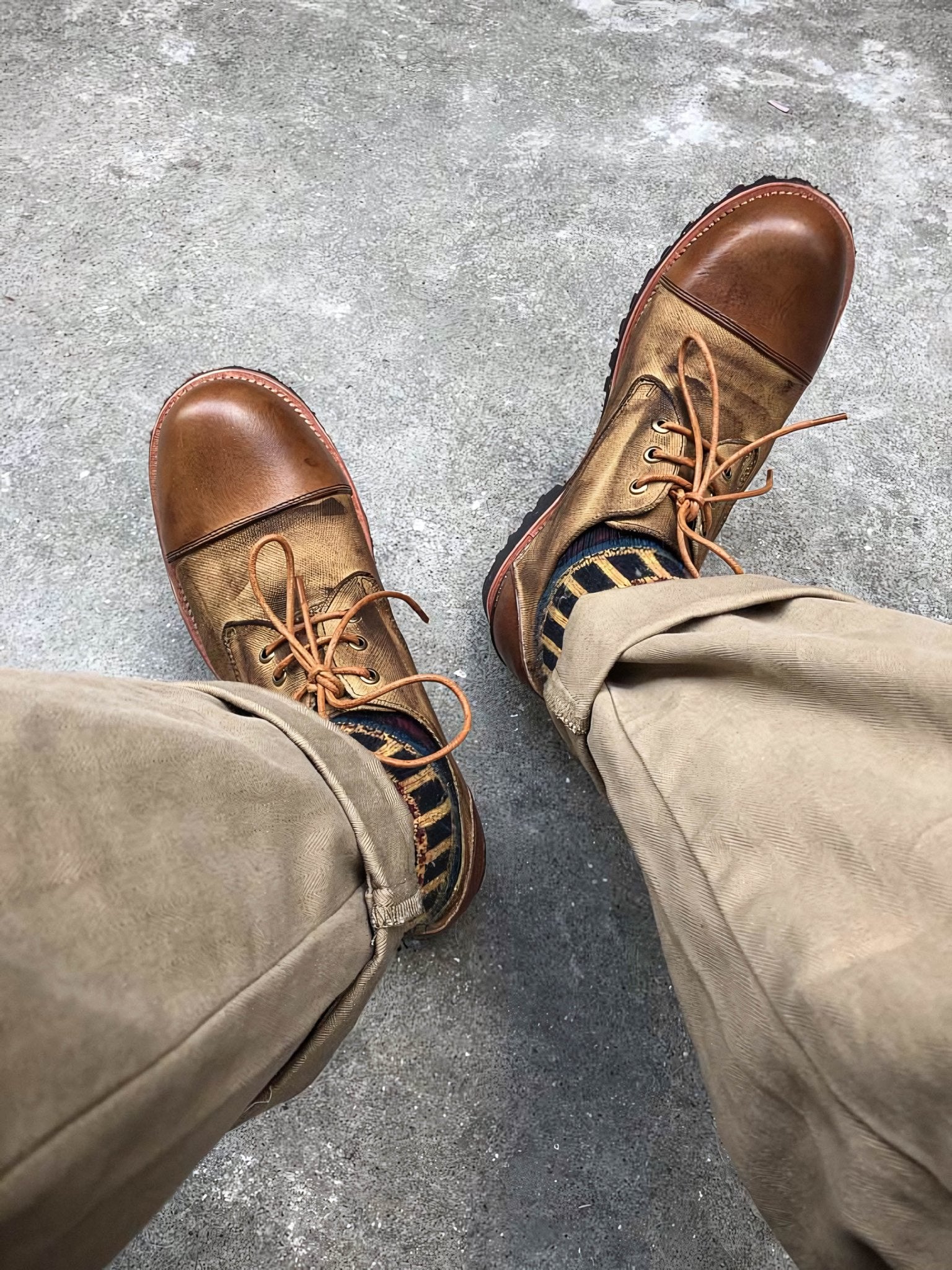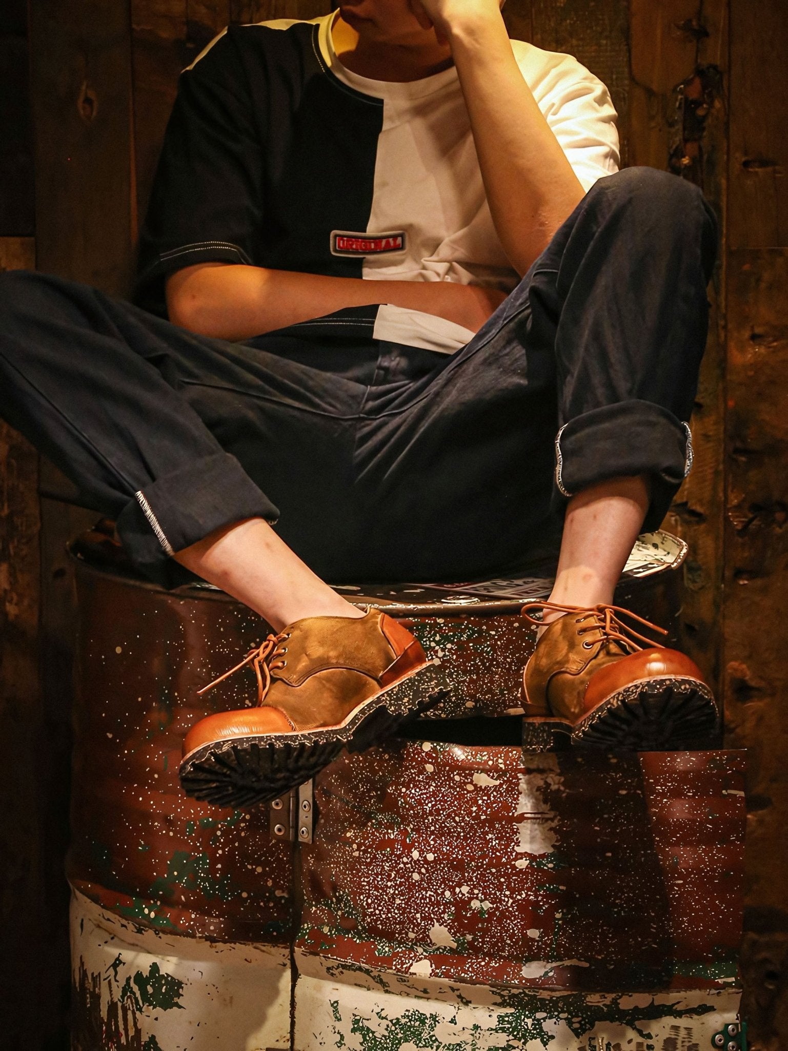 本革とキャンバスのコンビデザインは洗練されており、さりげなく個性を演出します。絶妙な配色のカラーリングがビンテージ感を満載させ、特に牛革の部分は光沢感があり、存在感が際立っています。日常のワークスタイルから旅行まで幅広く活躍するこちらの一足は、職人手作りの真のマーティンシューズであり、数少ない存在の一つです。ハンドメイドの製法によって生み出された特別なシューズを是非お楽しみください。