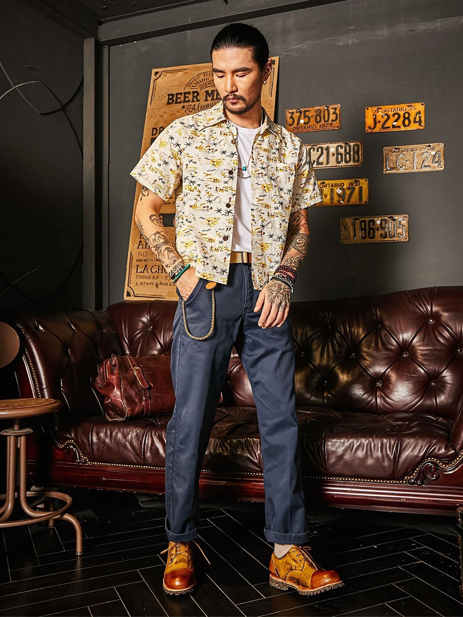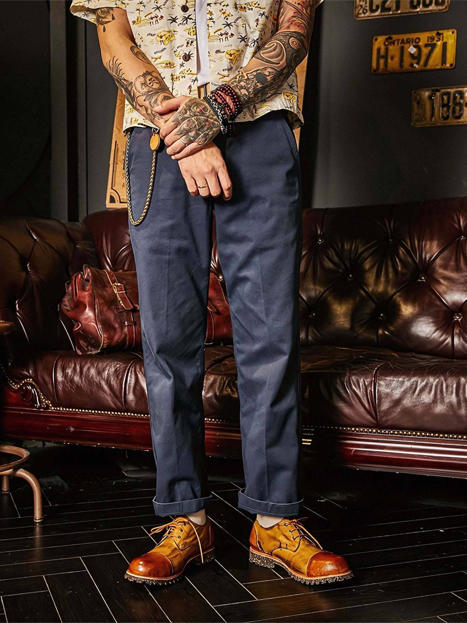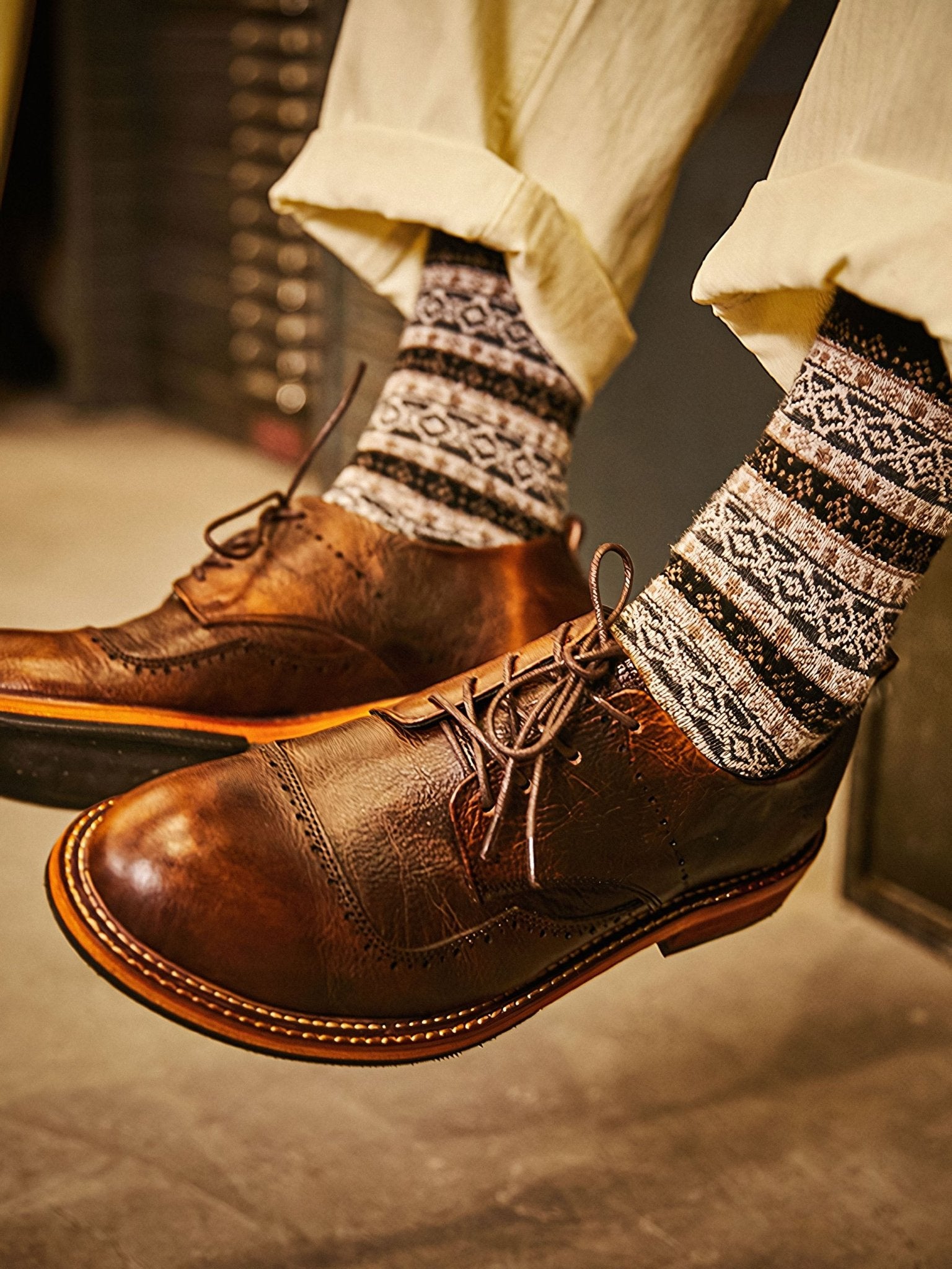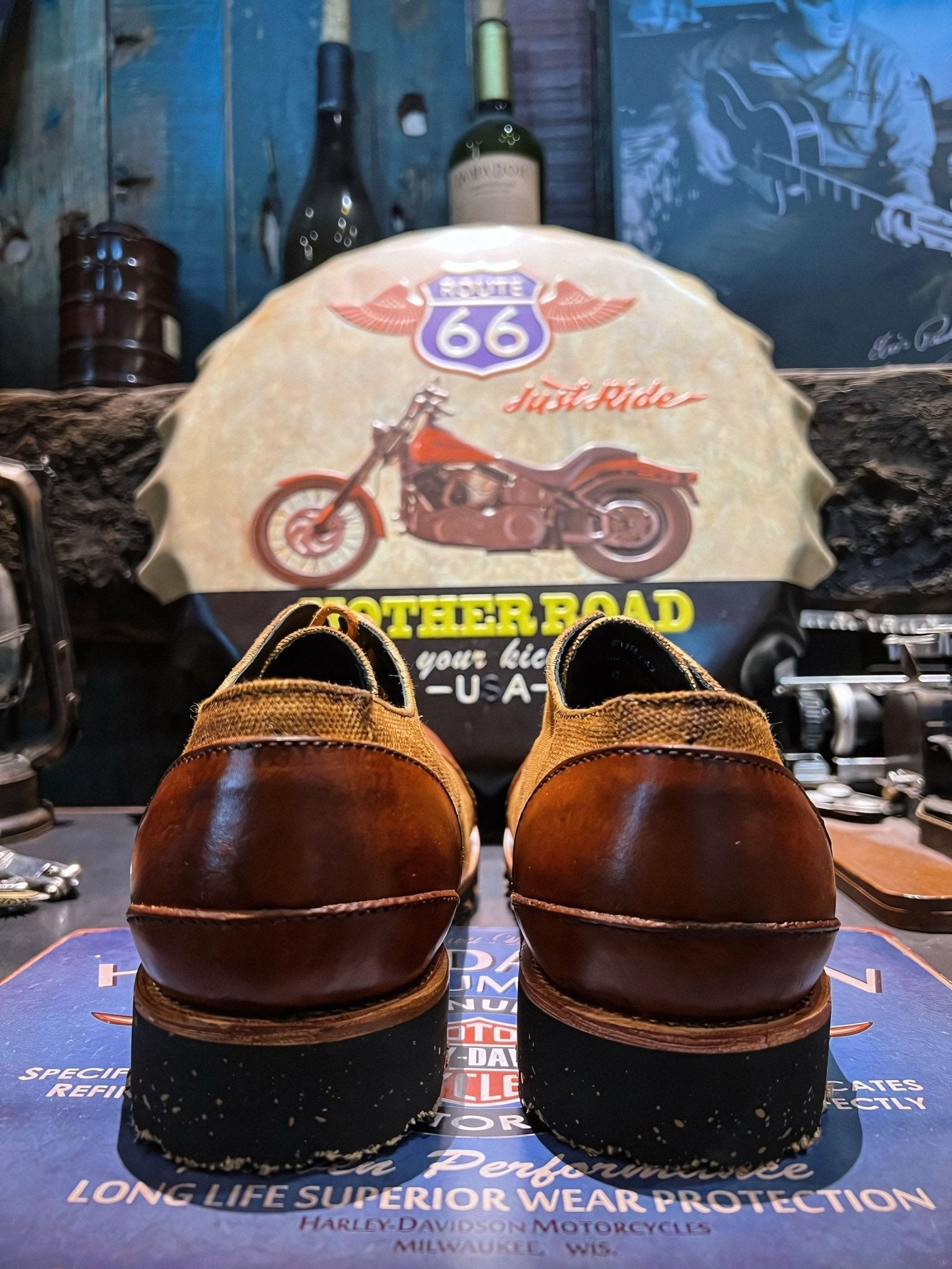 本革とキャンバスのコンビデザインは洗練されており、さりげなく個性を演出します。絶妙な配色のカラーリングがビンテージ感を満載させ、特に牛革の部分は光沢感があり、存在感が際立っています。日常のワークスタイルから旅行まで幅広く活躍するこちらの一足は、職人手作りの真のマーティンシューズであり、数少ない存在の一つです。ハンドメイドの製法によって生み出された特別なシューズを是非お楽しみください。
