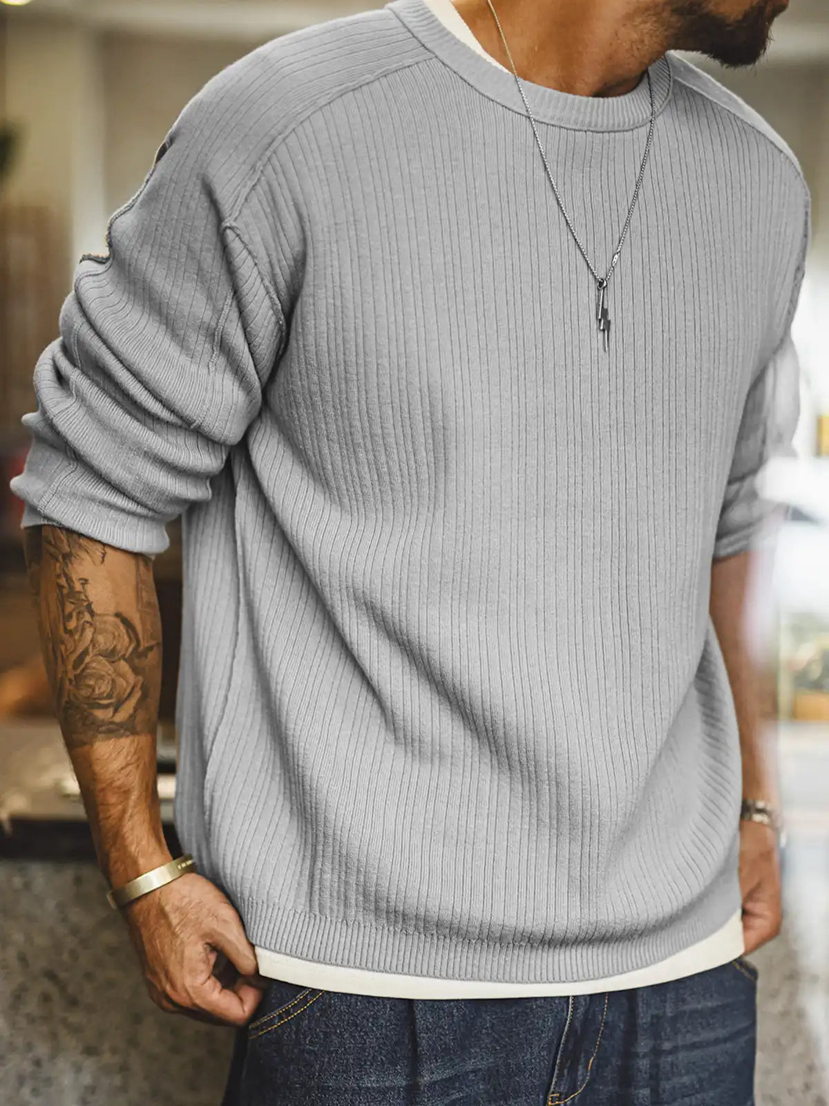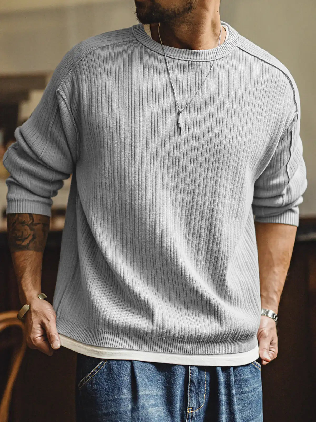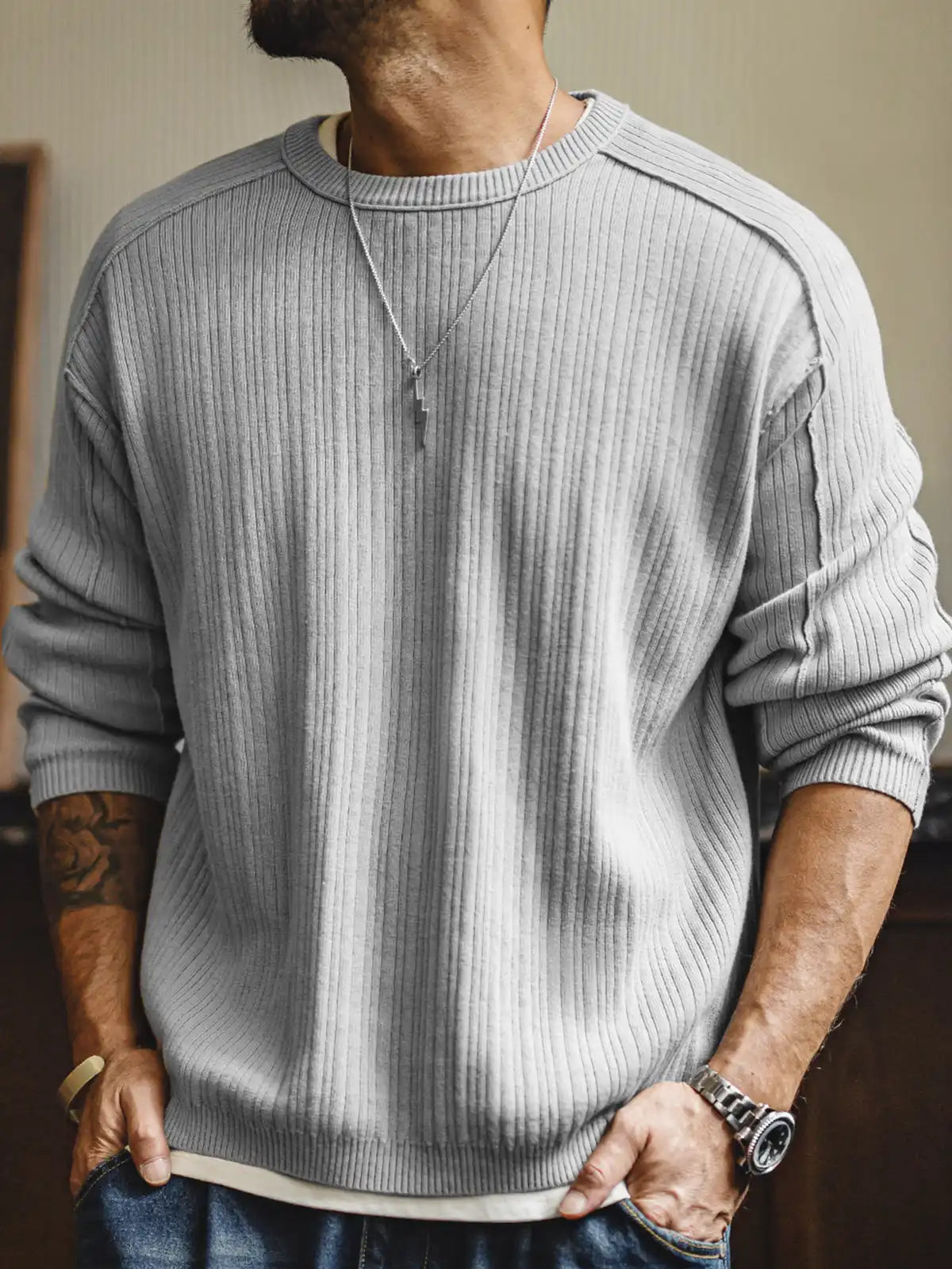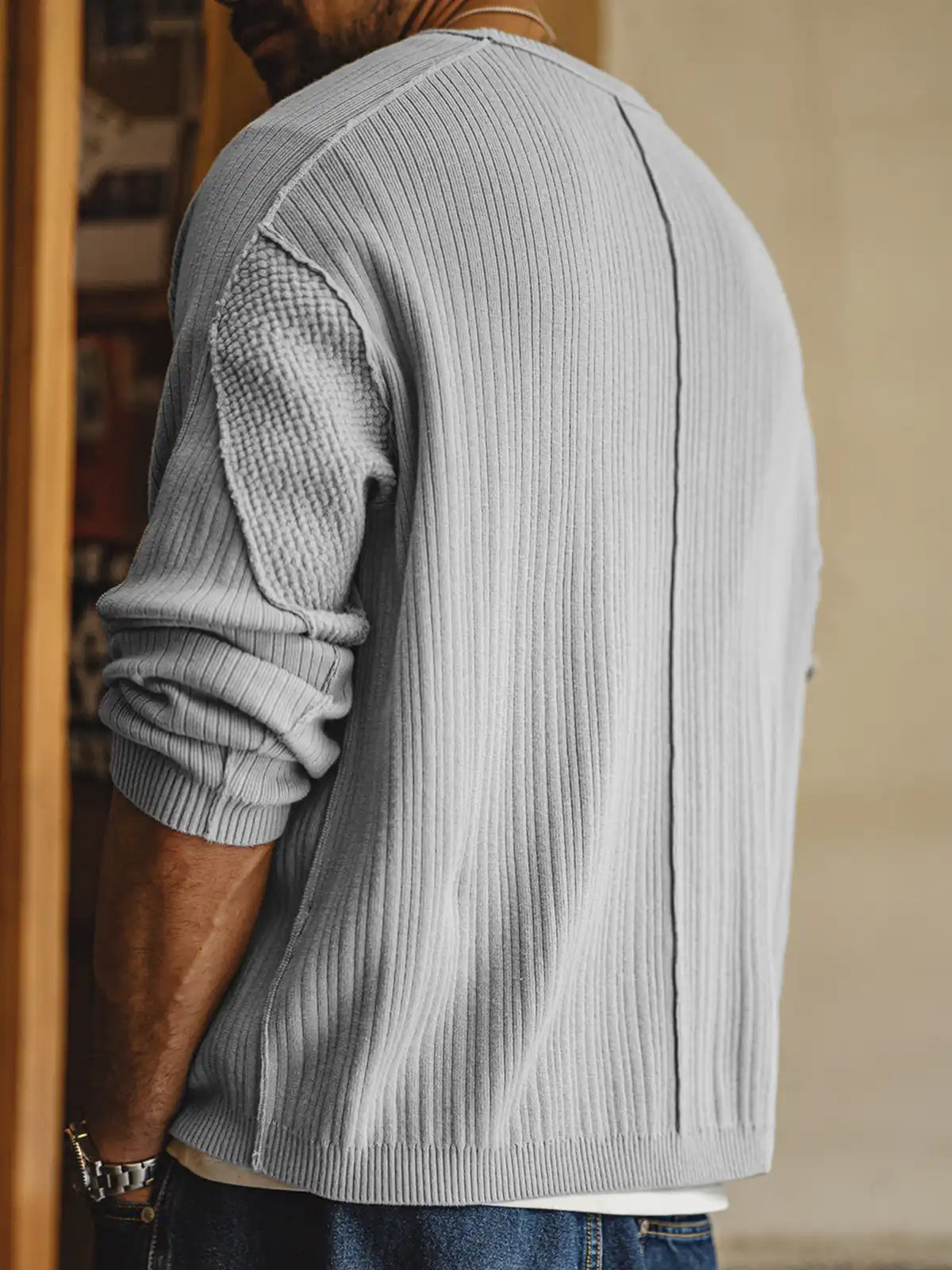 立体リブと切替の“外に見せる縫い”で、グレーのニットを基本から一段引き上げた一枚です。