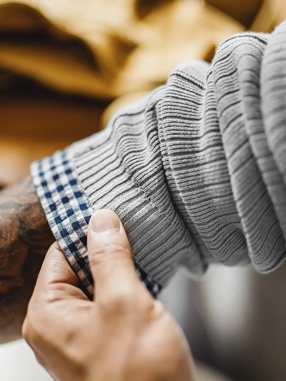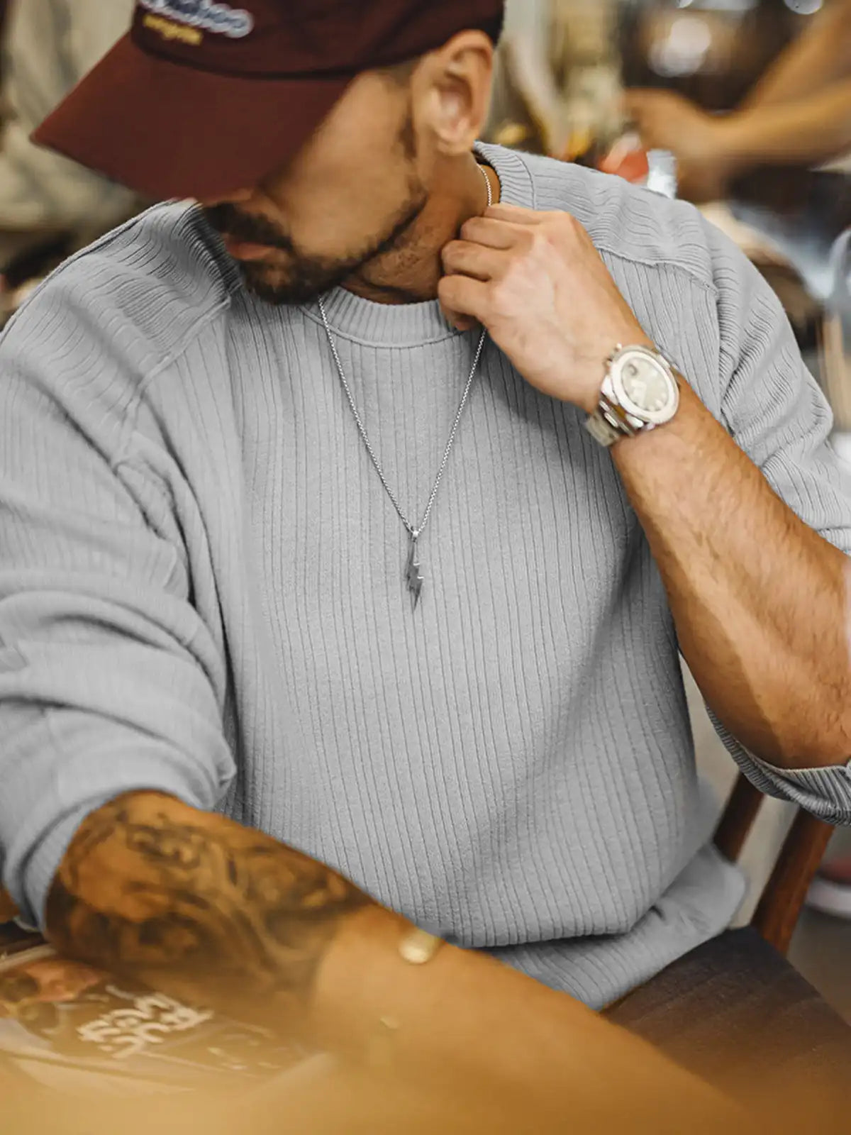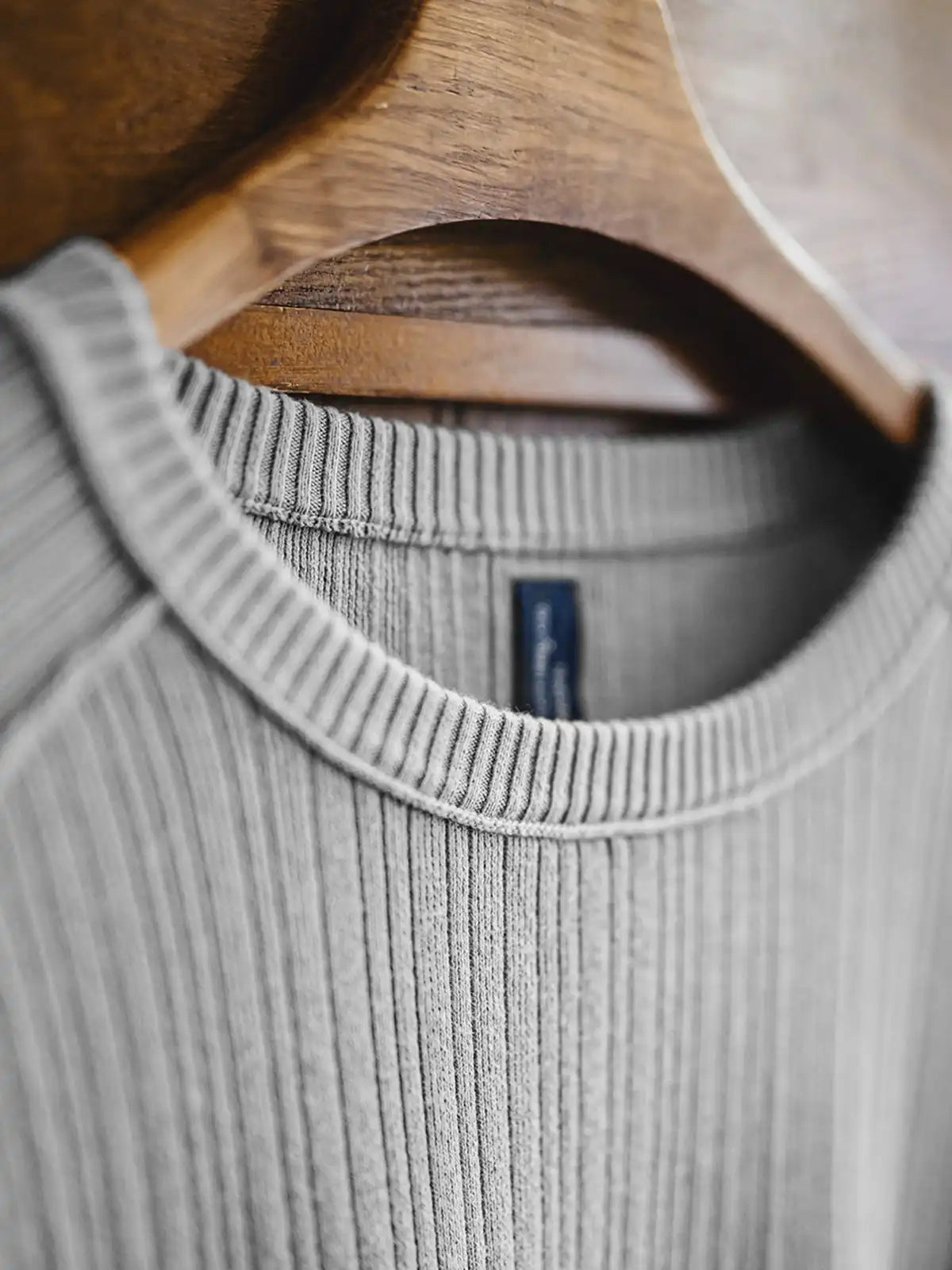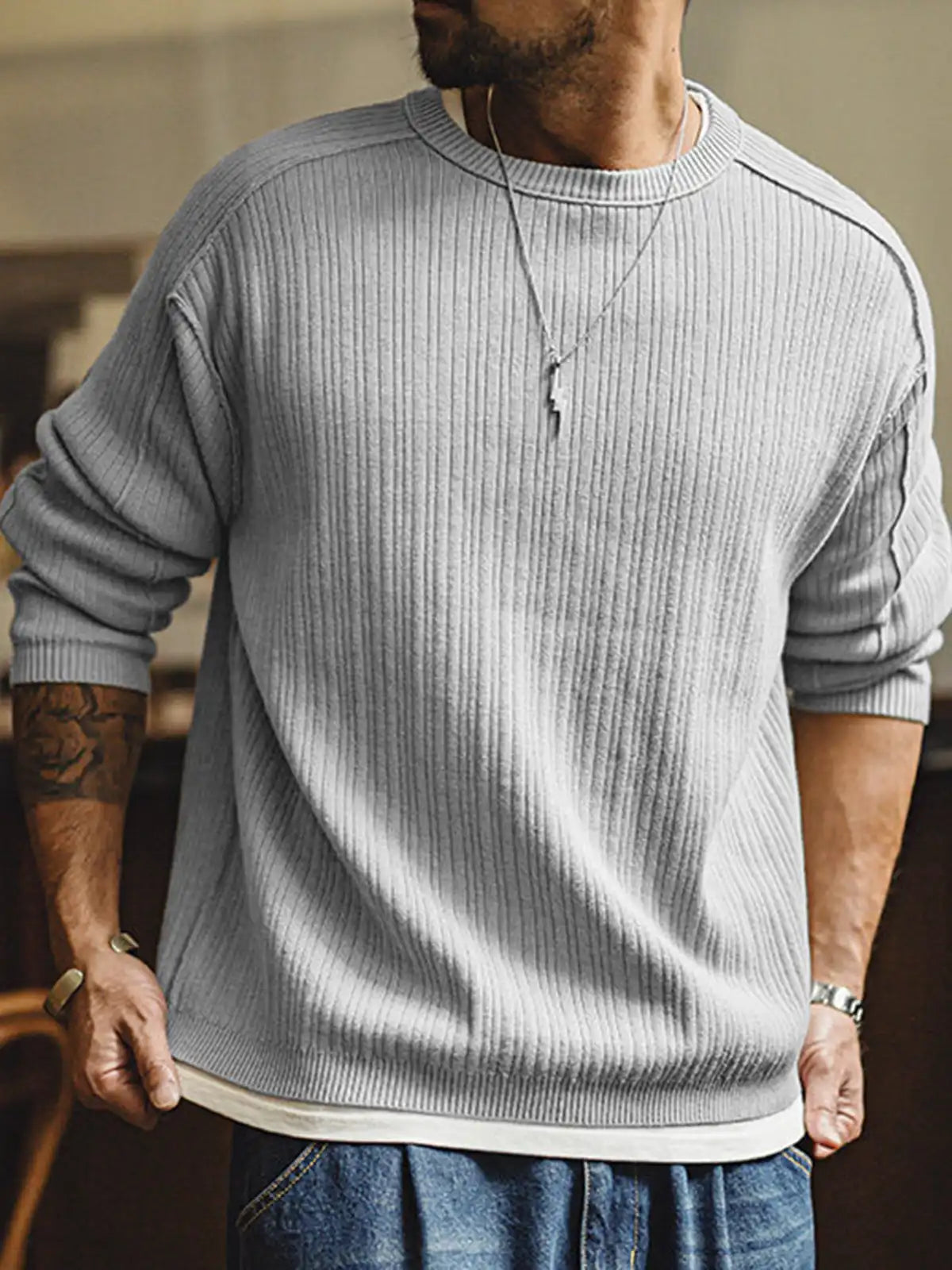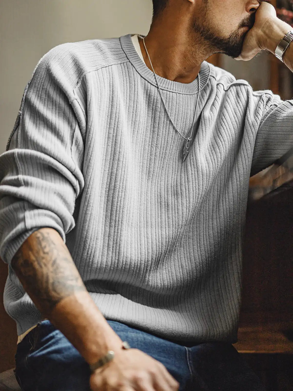 立体リブと切替の“外に見せる縫い”で、グレーのニットを基本から一段引き上げた一枚です。
