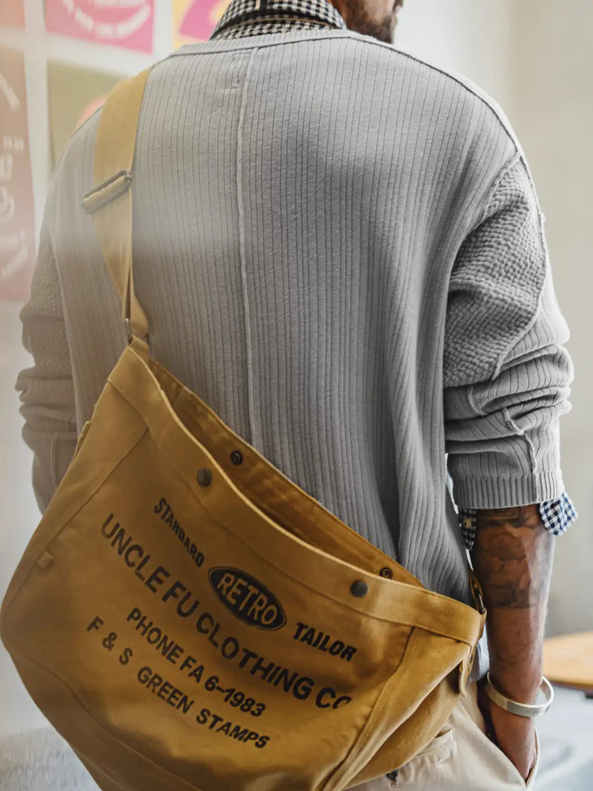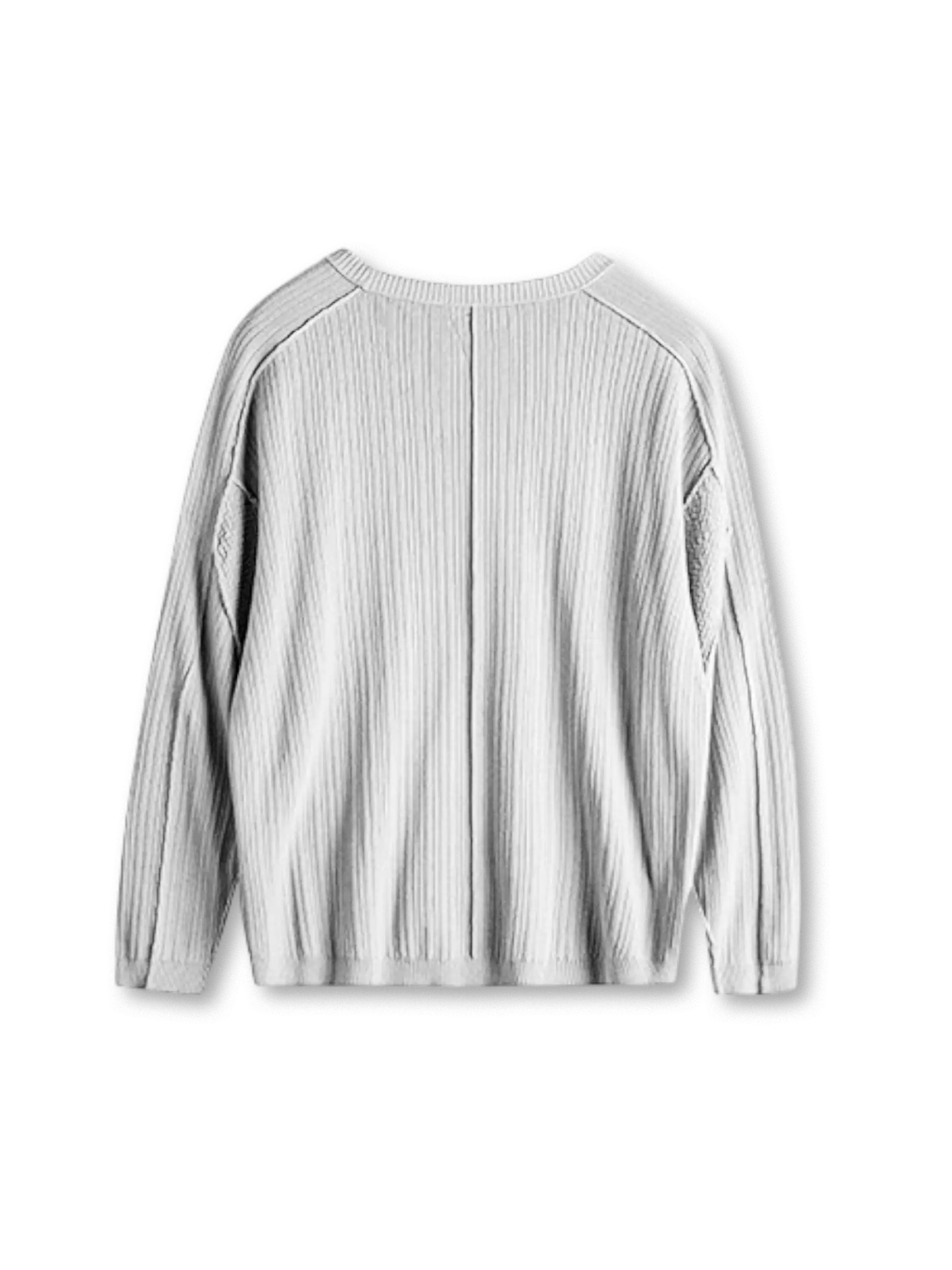 クリーンなグレー調を土台に、10枚のパーツ構成と3種の編み地を組み合わせて、単なる無地ニットでは出ない陰影と輪郭を作った設計です。身頃は縦方向のリブ(坑条)で線を立て、着たときの膨らみを抑えながら縦の流れを強調し、切替位置は外露の拼縫=立体的な“分割線”として見せることで、視覚的に体の面を締めます。コットン糸を双糸で編み、リブの山をくっきり出しつつ形が崩れにくい方向へ寄せ、袖口と裾はリブで緩急を付けて風の入りを抑えています。スラックスで落ち着きを出しても、デニムでラフに振っても、線の立ち方で“きれいに見える”ので、春の一枚着として手数が減ります。