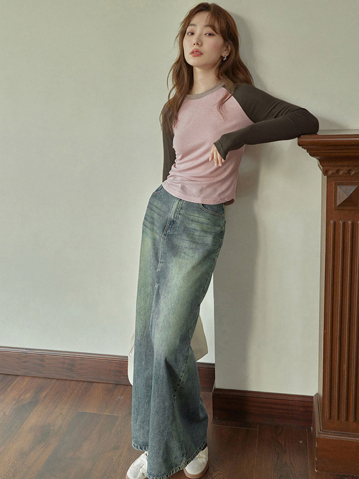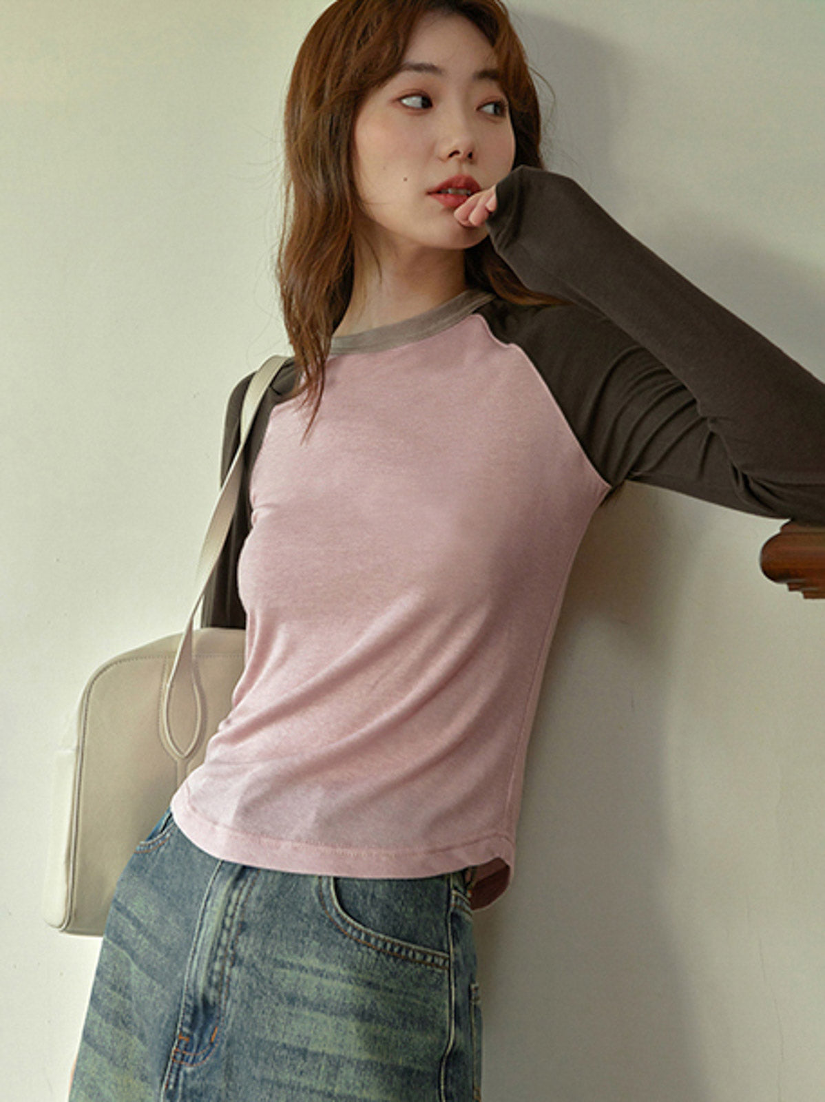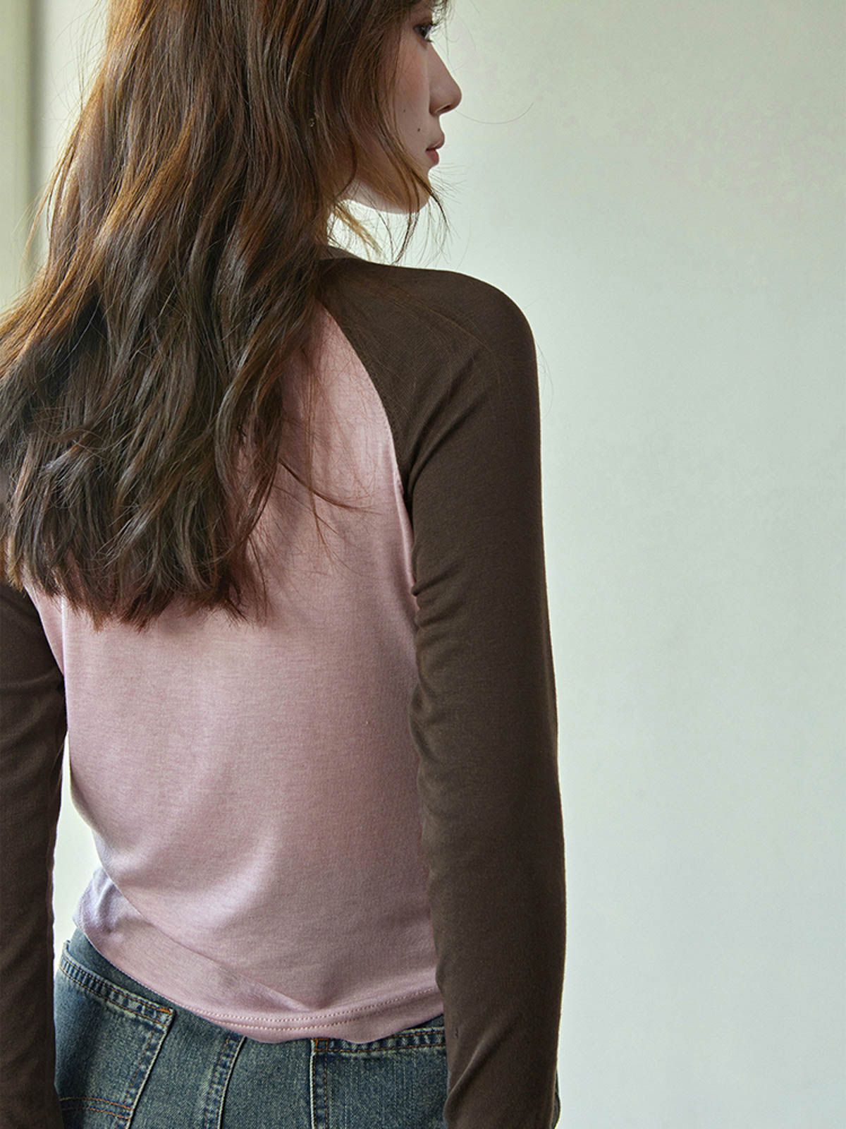 スリムで個性的な薄霧ピンクの配色ラグランスリーブ長袖Tシャツ。シャープでスタイリッシュな印象を演出します。