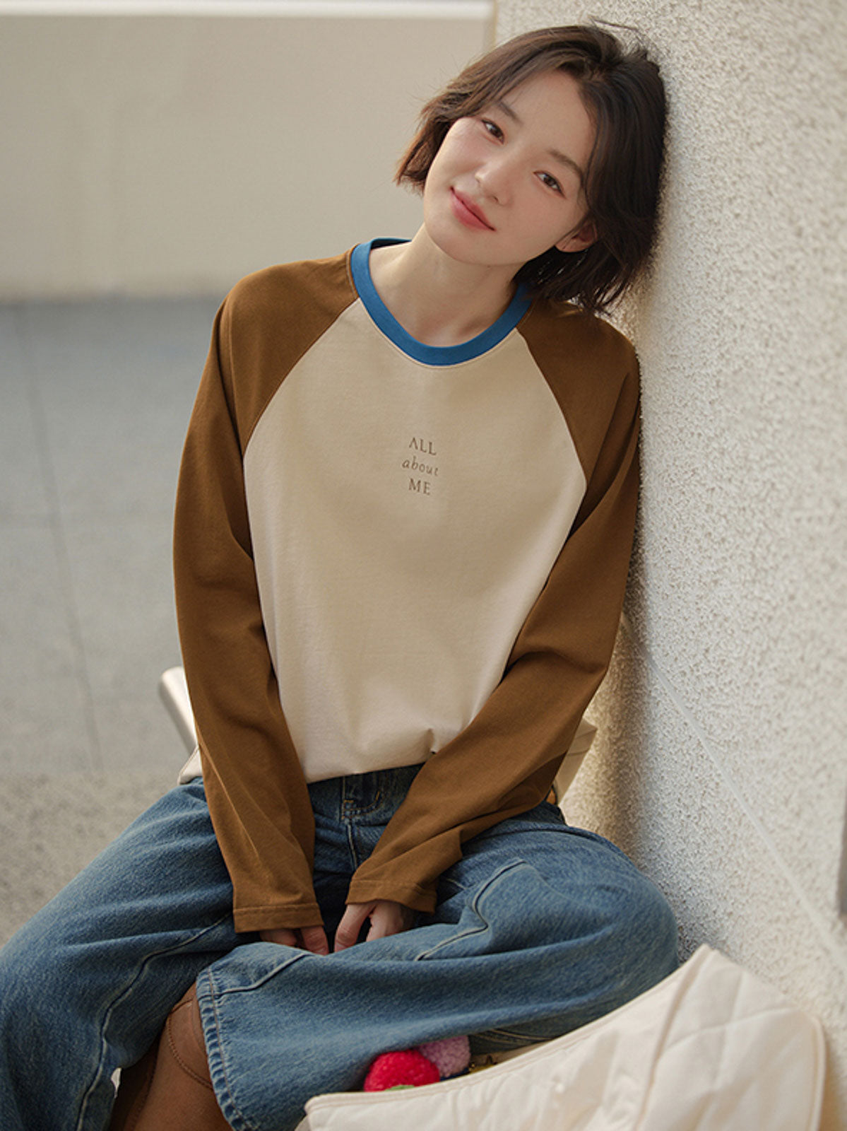 軽快なカジュアルスタイルの配色ラグラン長袖Tシャツ、快適でスリムに見える。
