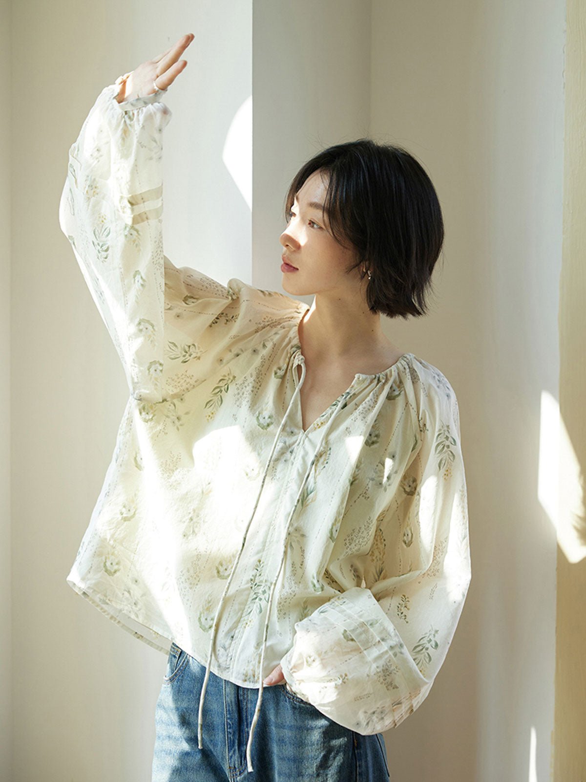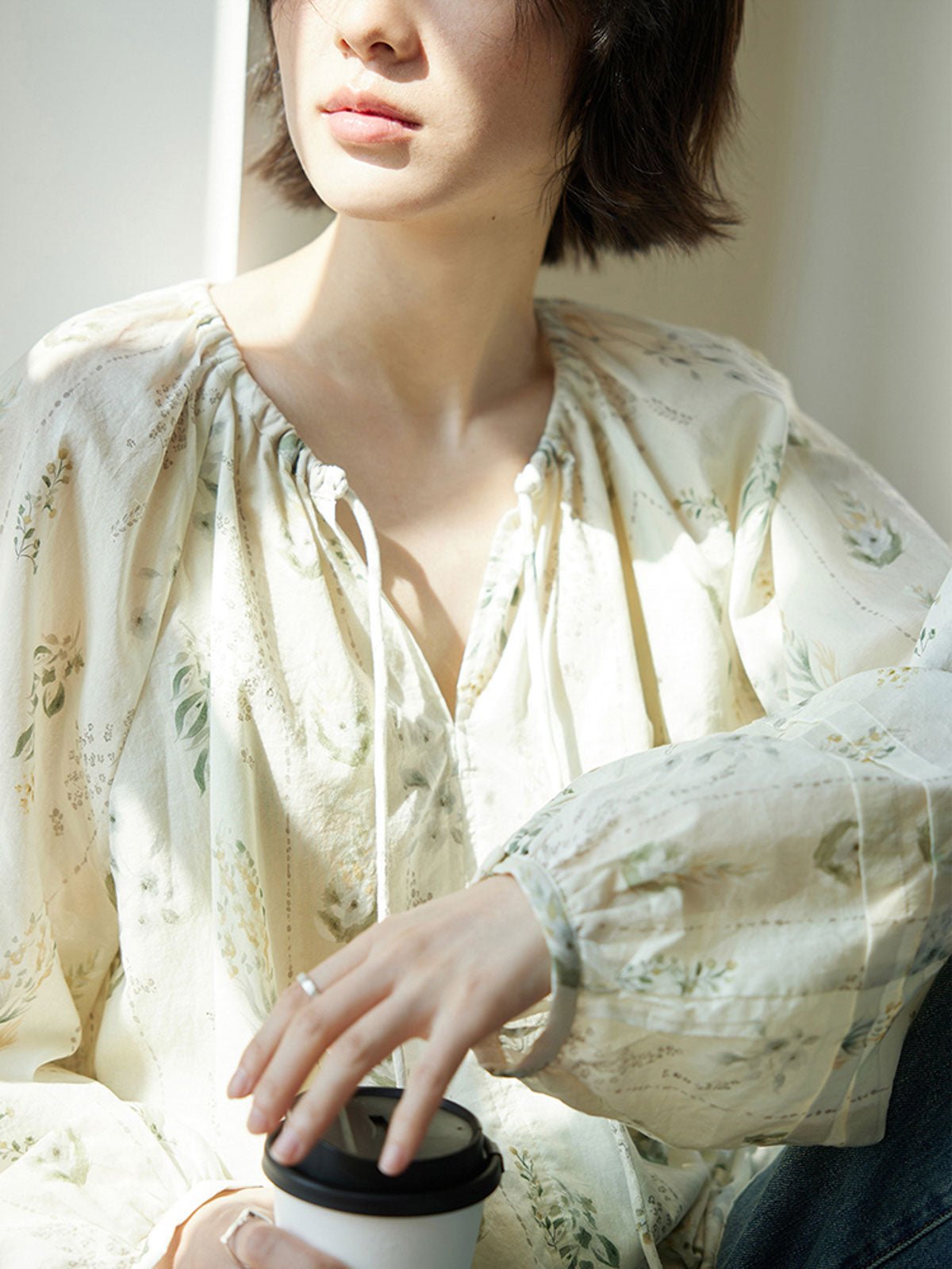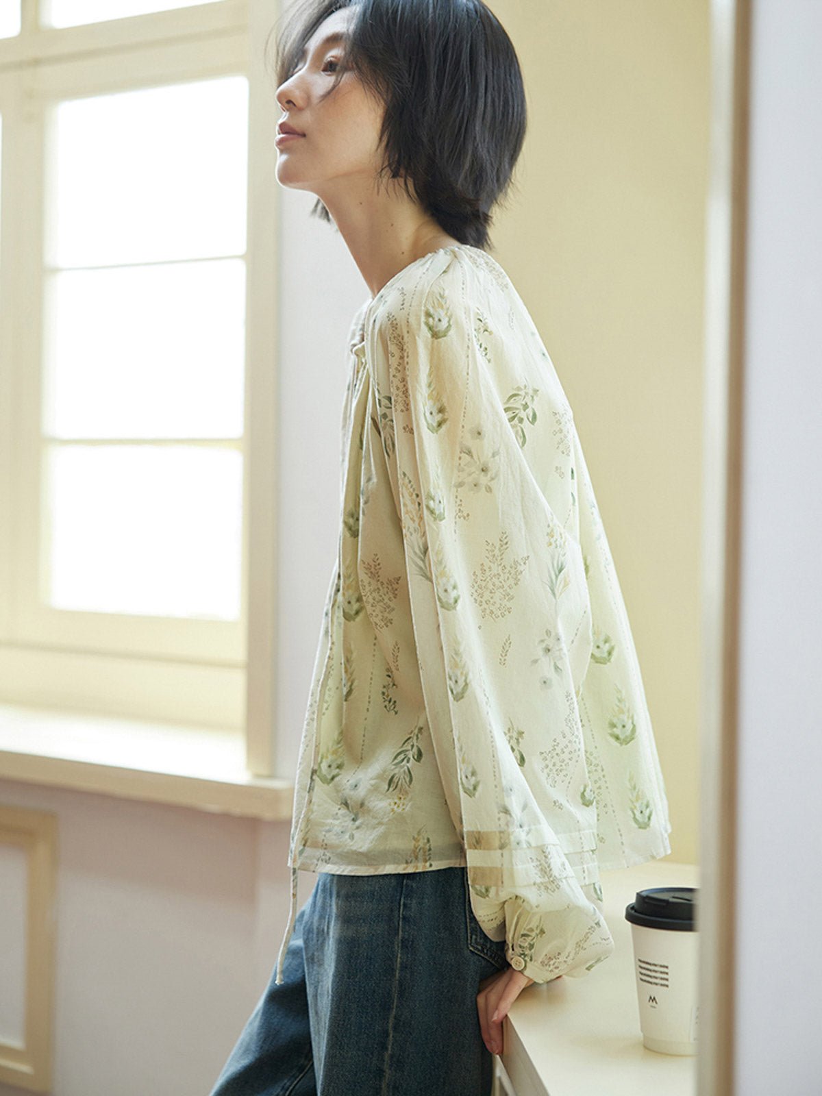このフレンチスタイルのシフォンブラウスは、爽やかで独特なウォーターグリーンの色調が特徴で、リラックスした涼しげな雰囲気を演出します。小さな開襟のラウンドネックデザインが顔の形を整え、タイ付きで着脱が簡単でありながら上品で美しい。自然なプリーツが柔らかな層を作り、ゆったりとしたシルエットとラグランスリーブのデザインが肩を華奢に見せ、リラックスしたカジュアルな印象を与えます。袖口の小さなボタンはわずかに絞られており、快適でスタイリッシュです。素材は柔らかく滑らかで、肌触りが良く通気性も優れています。裏地が付いているため透けることがなく、安心して着用できます。ショートパンツやスカートと合わせることで、休日のリラックスした快適なスタイルを楽しめます。