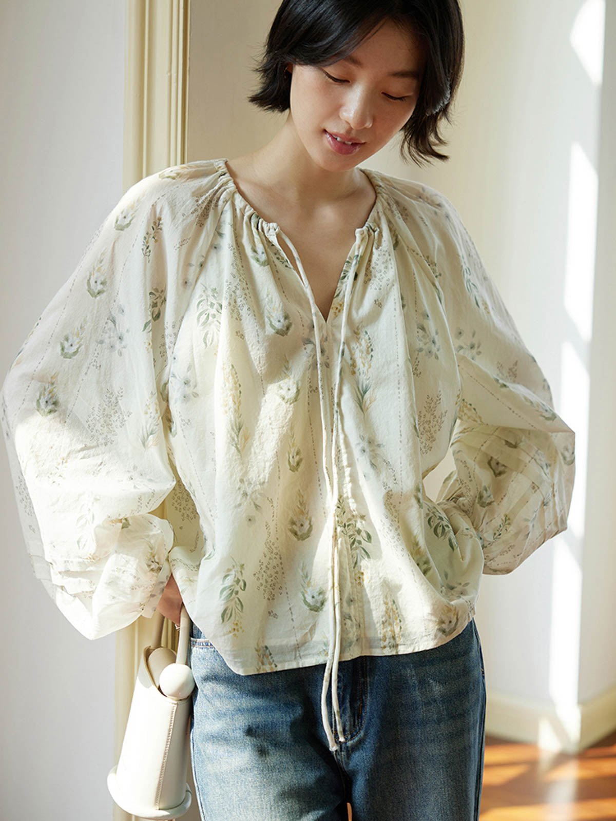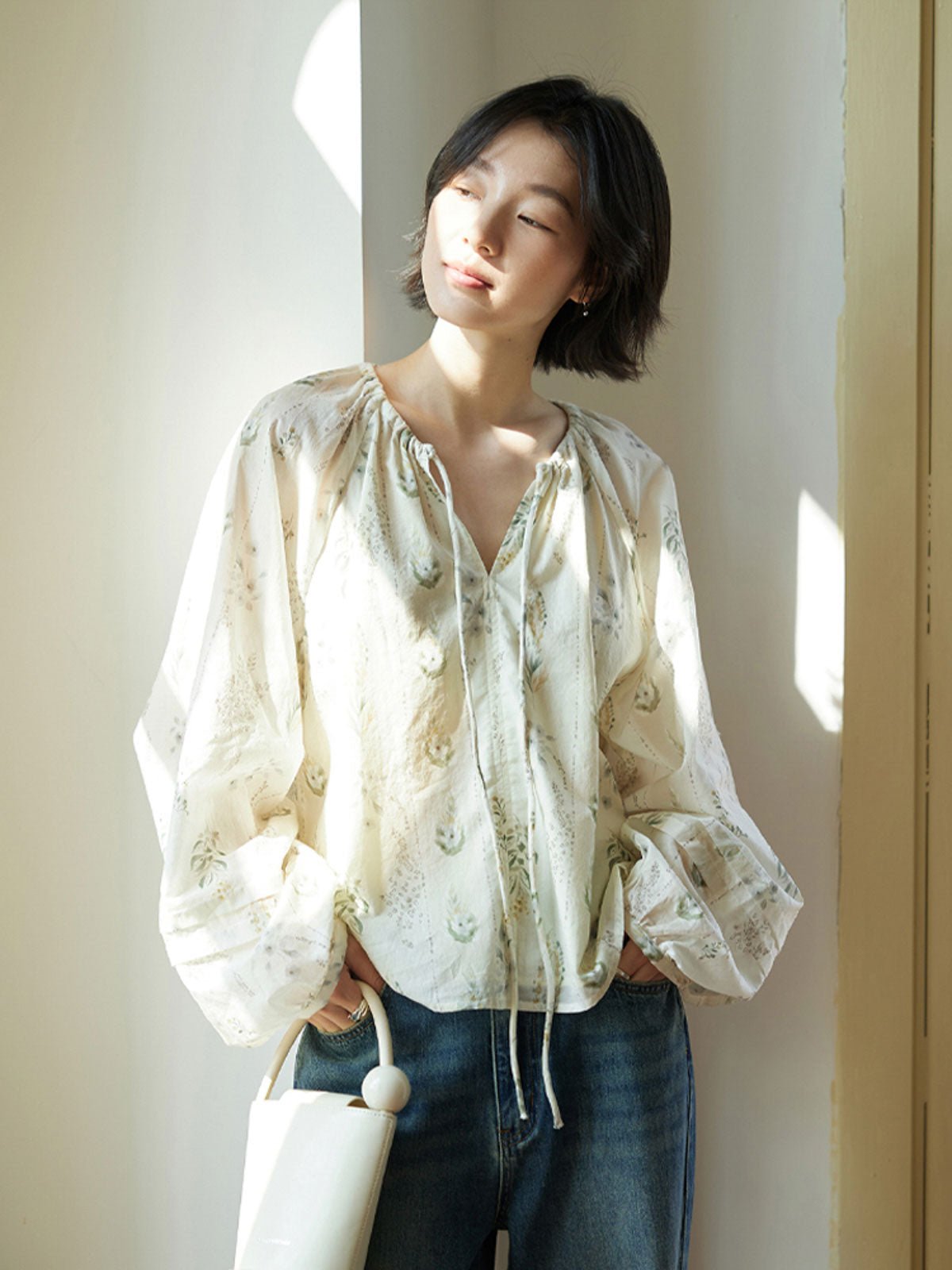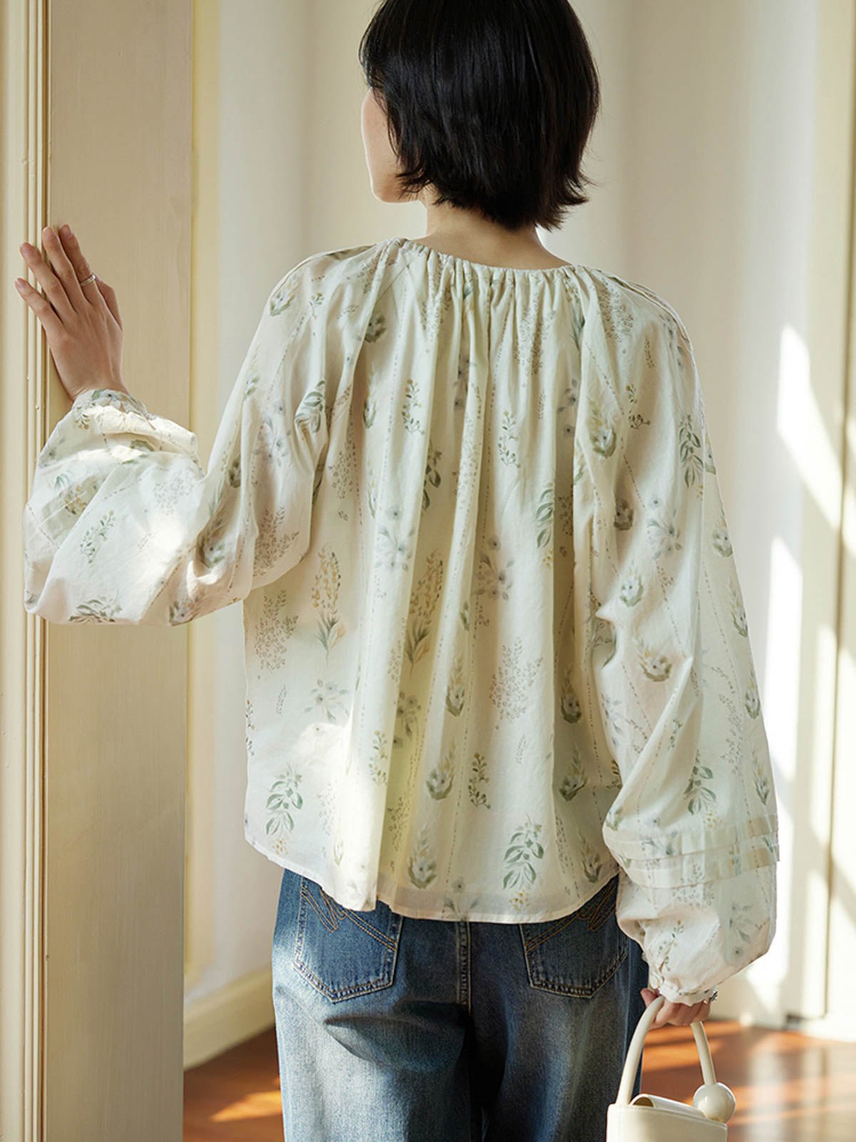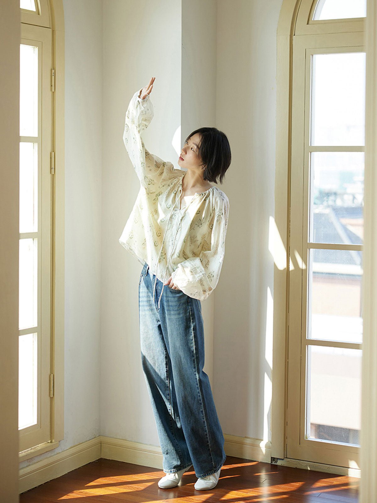 このフレンチスタイルのシフォンブラウスは、爽やかで独特なウォーターグリーンの色調が特徴で、リラックスした涼しげな雰囲気を演出します。小さな開襟のラウンドネックデザインが顔の形を整え、タイ付きで着脱が簡単でありながら上品で美しい。自然なプリーツが柔らかな層を作り、ゆったりとしたシルエットとラグランスリーブのデザインが肩を華奢に見せ、リラックスしたカジュアルな印象を与えます。袖口の小さなボタンはわずかに絞られており、快適でスタイリッシュです。素材は柔らかく滑らかで、肌触りが良く通気性も優れています。裏地が付いているため透けることがなく、安心して着用できます。ショートパンツやスカートと合わせることで、休日のリラックスした快適なスタイルを楽しめます。