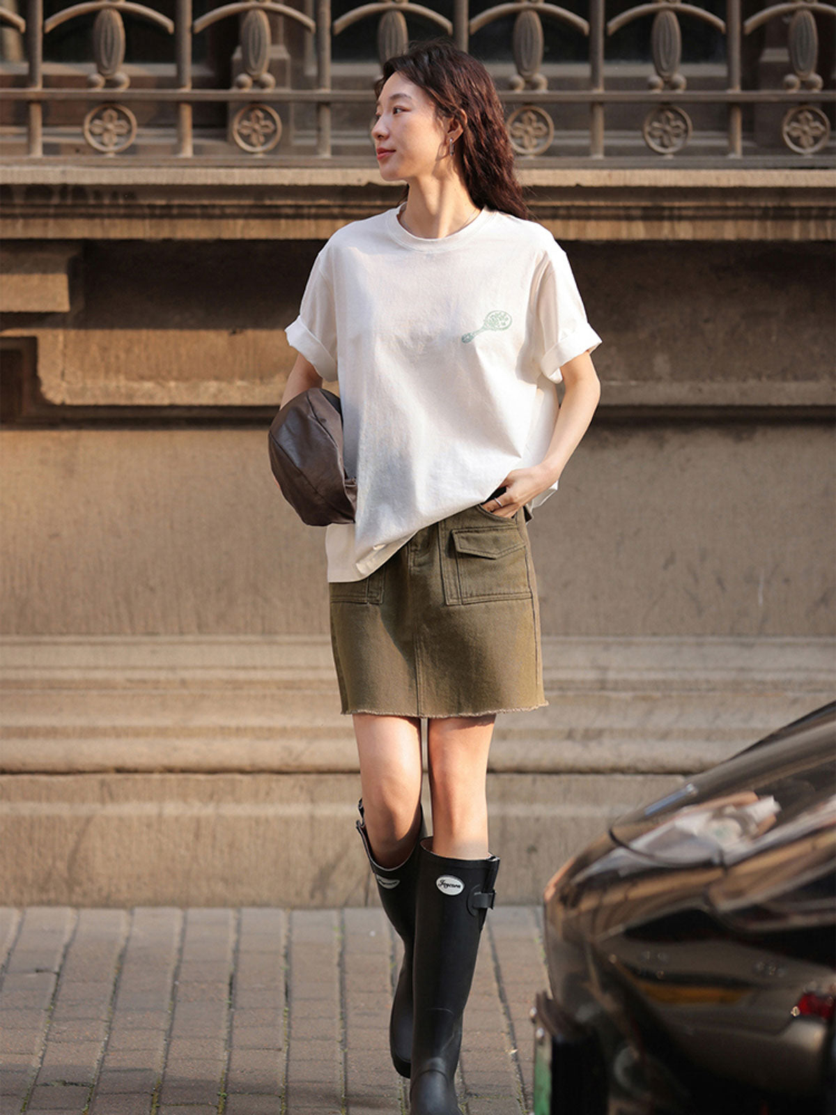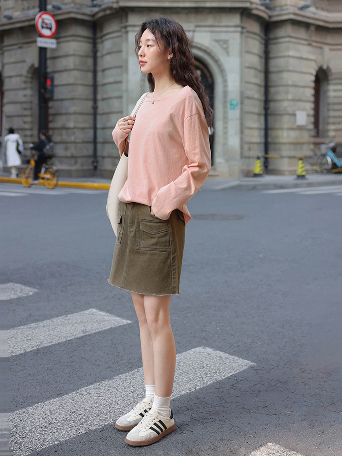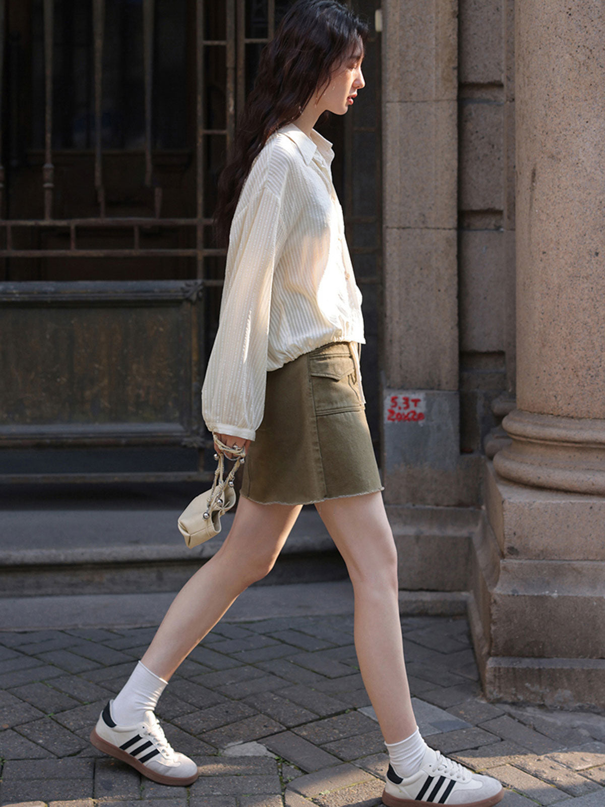 このデニムミニスカートはヴィンテージデザインを採用しており、ブラウンカラーが濃厚なヴィンテージ感を演出します。ハイウエストのAラインシルエットがウエストラインを強調し、スタイルを整えます。ゆったりとしたフィット感で快適な着心地を提供し、立体的なカットがヒップラインをスリムに見せます。両サイドにはワークスタイルの斜めポケットがデザインされ、スタイルにアクセントを加えます。背面には装飾的なフラップポケットがあり、ヘムはフリンジカットでカジュアルな雰囲気をプラス。95%コットンと5%ポリエステルの快適でしっかりとしたデニム素材を使用しており、耐久性とスタイルの幅広さを兼ね備えています。カラフルなトップスやカジュアルな装いと合わせて、ファッショナブルなスタイルを楽しめます。
