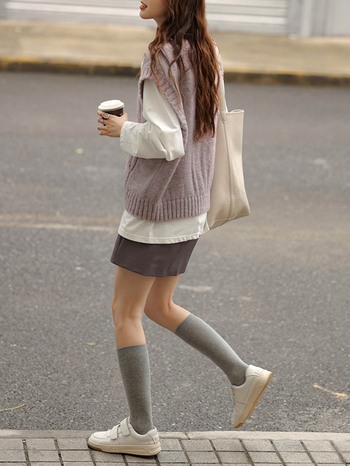 ファッション性のあるヴィンテージマットなグレー×パープルのハイウエストPUレザーミニスカート。スリムで合わせやすい。