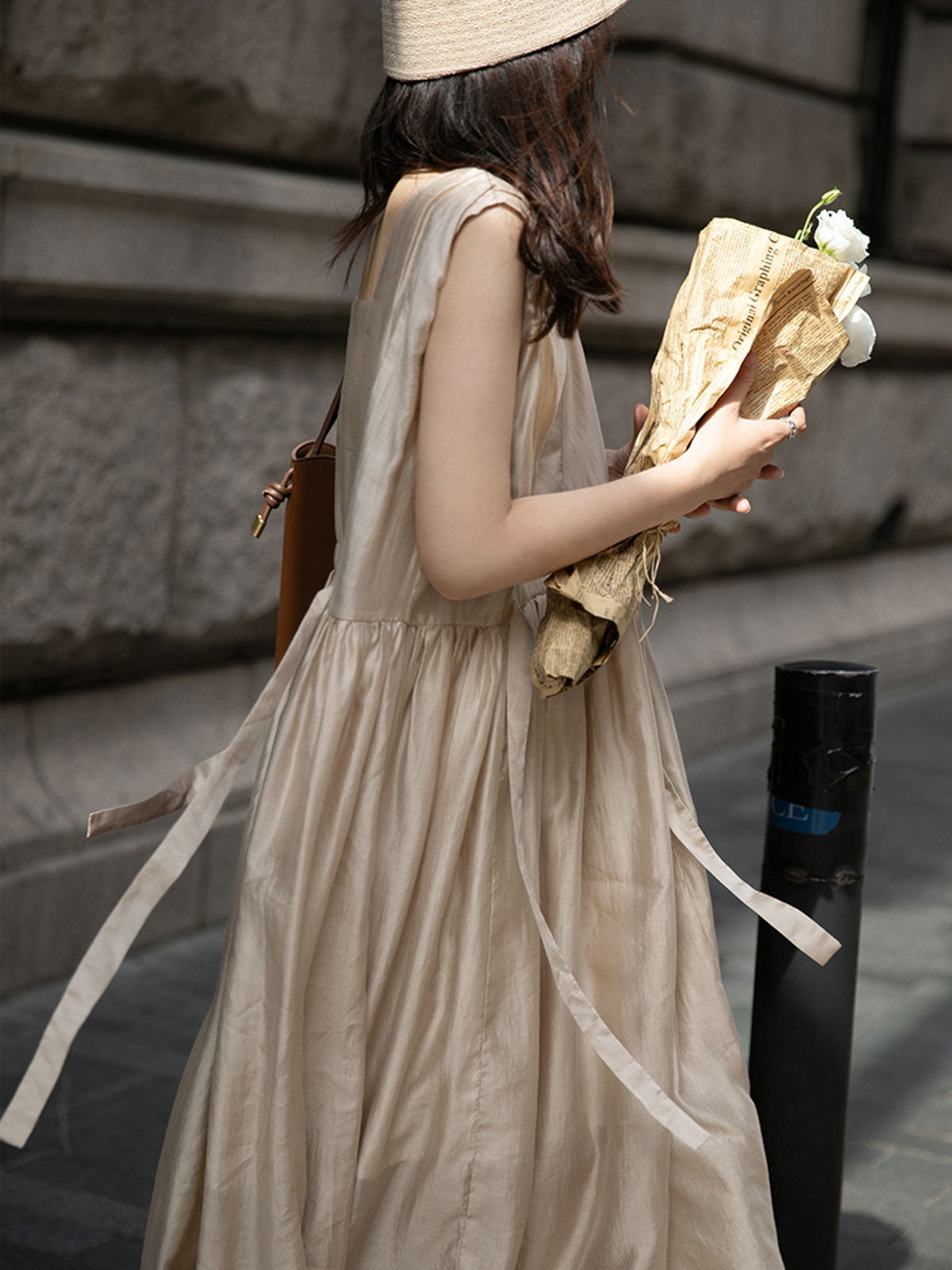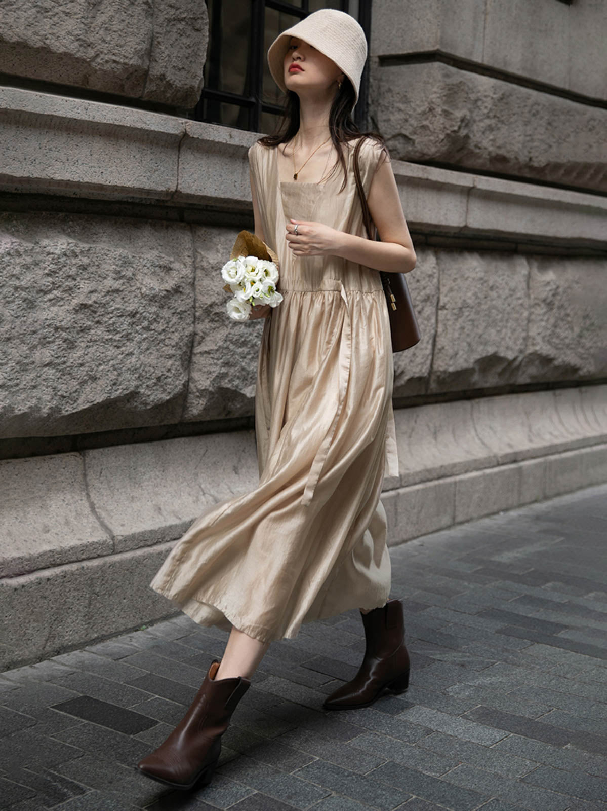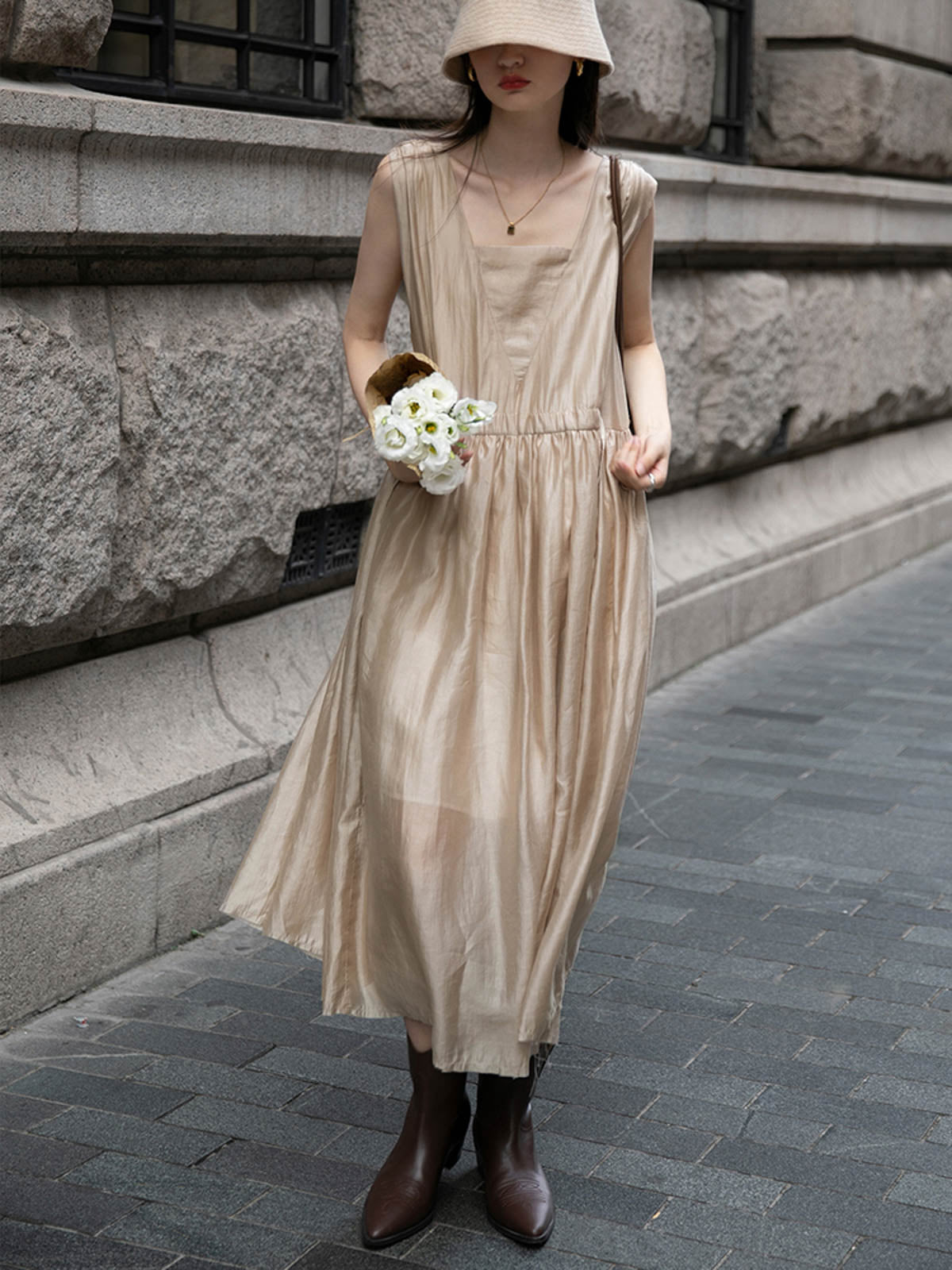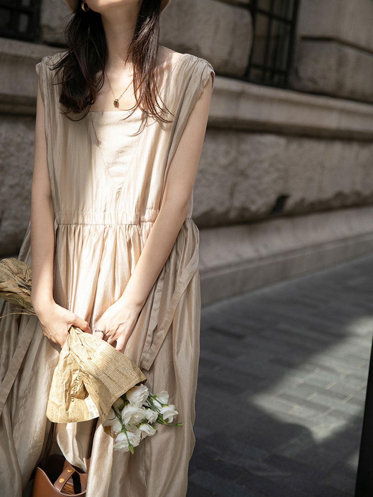 このドレスは、柔らかく穏やかなヌードピンクの色調が特徴で、静かで上品な雰囲気を作り出します。胸元のトライアングルパッチがトラピーズネックラインを形成し、独特のデザインが視覚的な深みを加えます。ウエスト部分にはシャーリングディテールがあり、純色に豊かな視覚効果を与え、前後にタイの装飾が施されています。これによりウエストを引き締め、サイドで結ぶことで可愛らしくスリムなシルエットを実現します。素材は84%テンセルと16%ポリエステルの混紡で、ウォッシュ加工を施した後、柔らかくふんわりとした手触りになり、快適で通気性に優れています。光の下で微細な光沢感を放ち、重くならず、夏には単独で、春秋にはジャケットと合わせてエレガントなスタイルを楽しむことができます。
