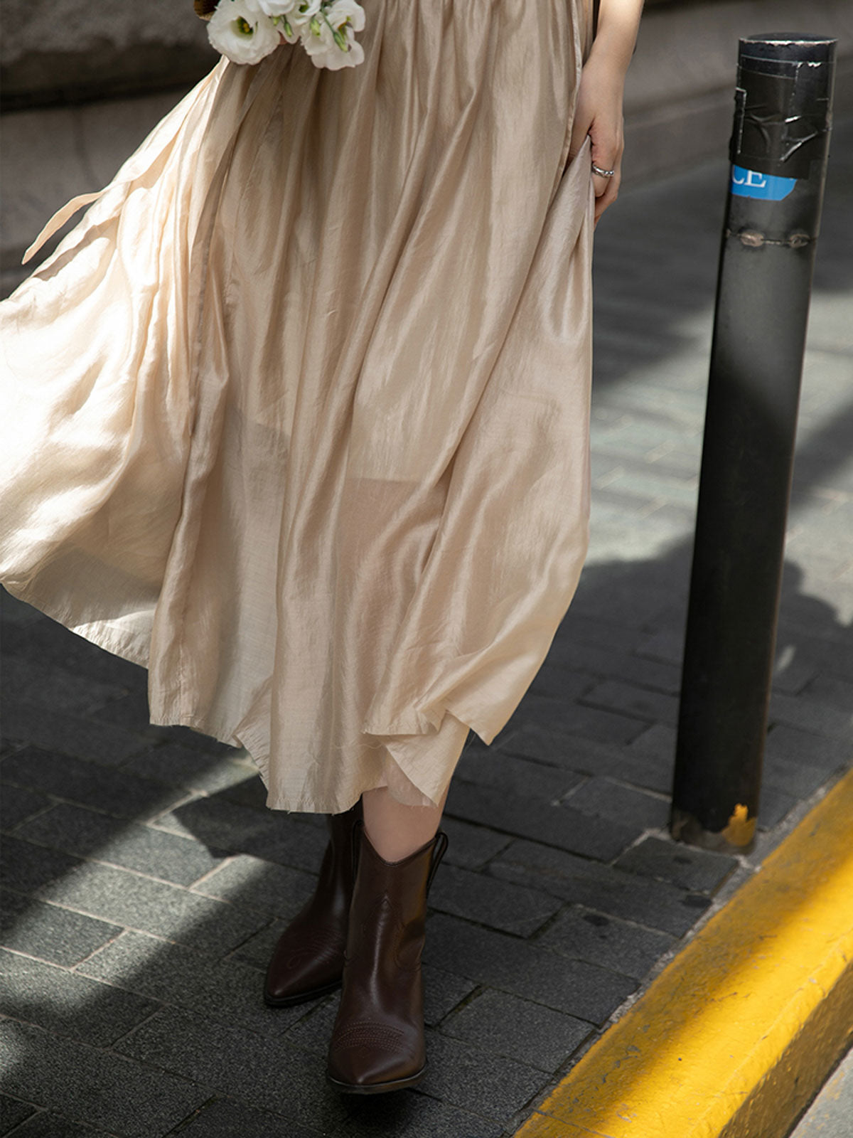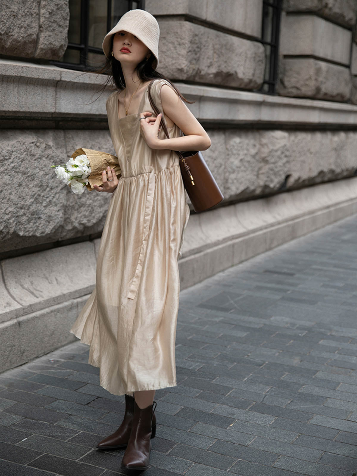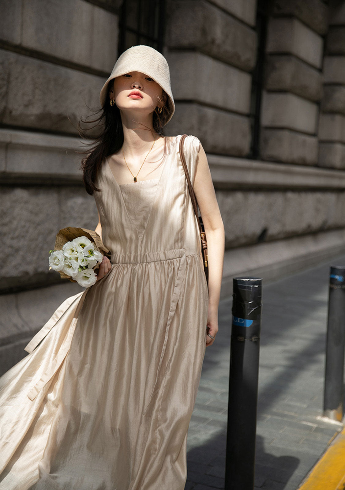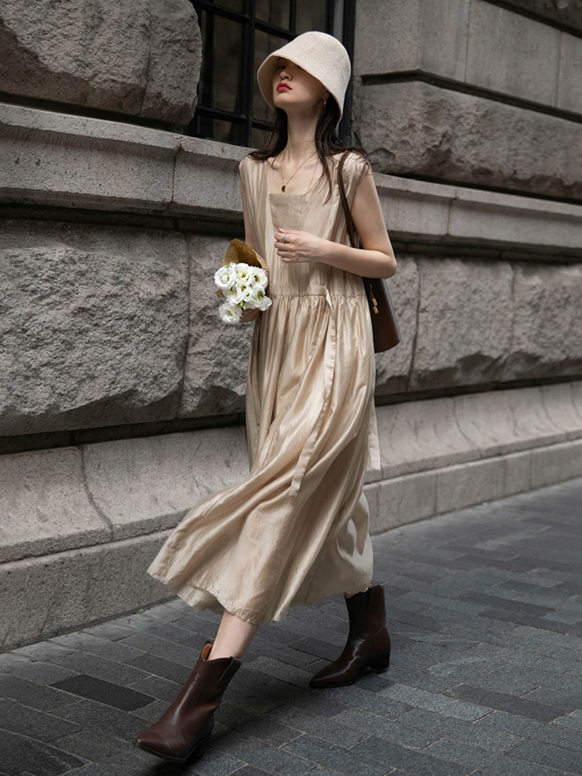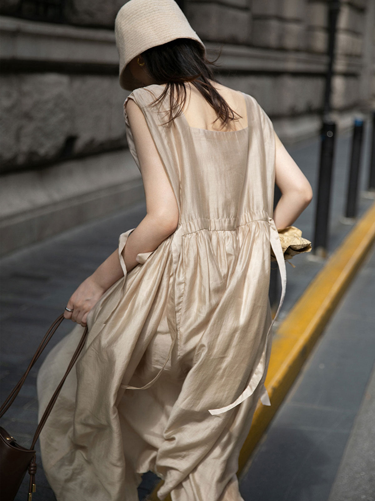 このドレスは、柔らかく穏やかなヌードピンクの色調が特徴で、静かで上品な雰囲気を作り出します。胸元のトライアングルパッチがトラピーズネックラインを形成し、独特のデザインが視覚的な深みを加えます。ウエスト部分にはシャーリングディテールがあり、純色に豊かな視覚効果を与え、前後にタイの装飾が施されています。これによりウエストを引き締め、サイドで結ぶことで可愛らしくスリムなシルエットを実現します。素材は84%テンセルと16%ポリエステルの混紡で、ウォッシュ加工を施した後、柔らかくふんわりとした手触りになり、快適で通気性に優れています。光の下で微細な光沢感を放ち、重くならず、夏には単独で、春秋にはジャケットと合わせてエレガントなスタイルを楽しむことができます。
