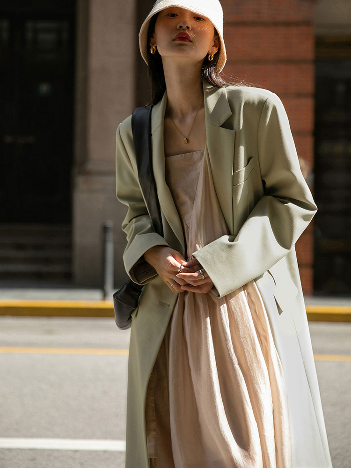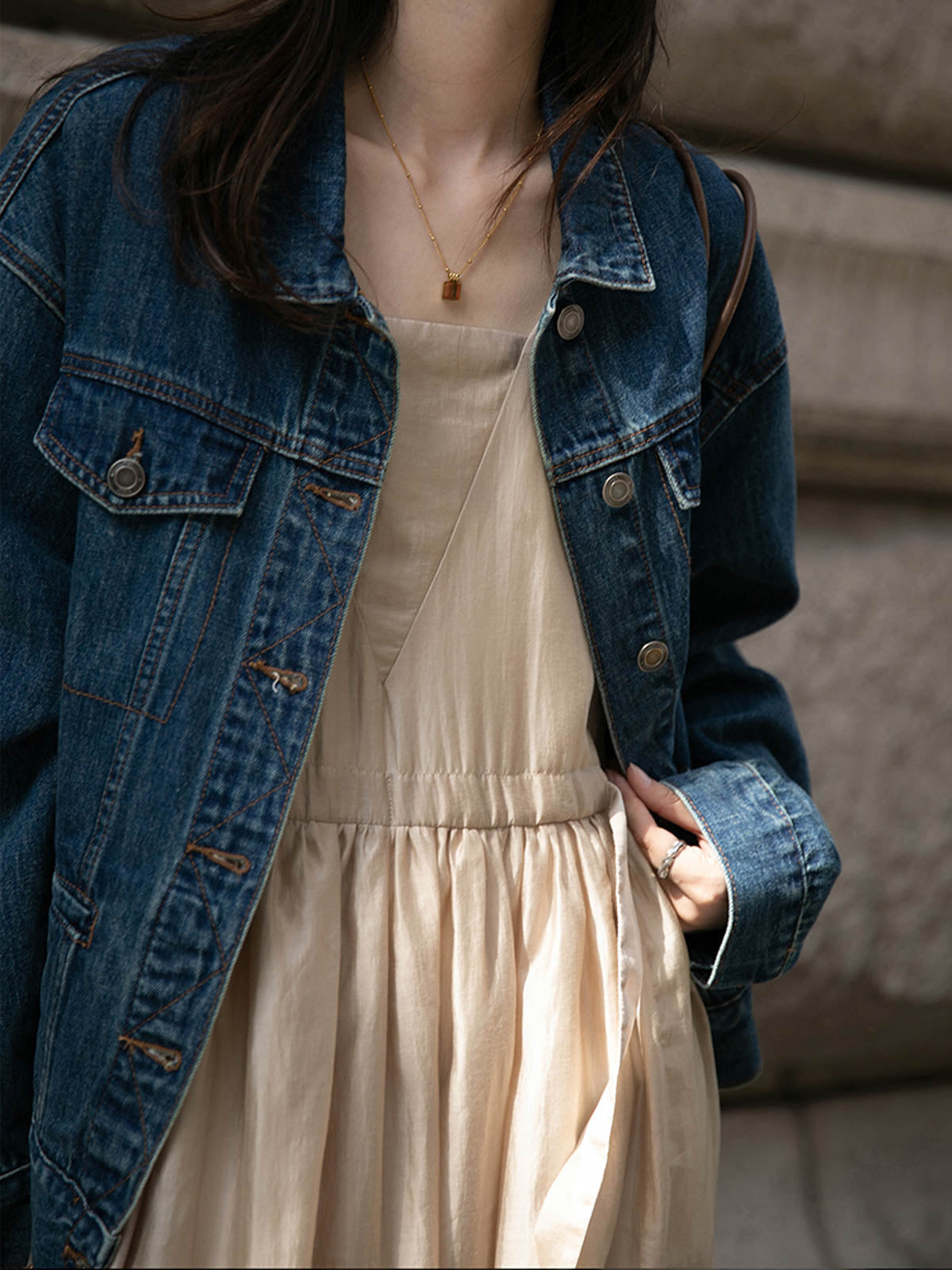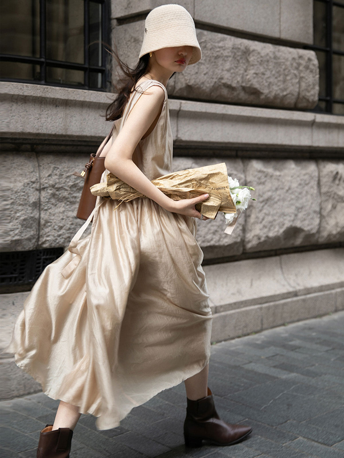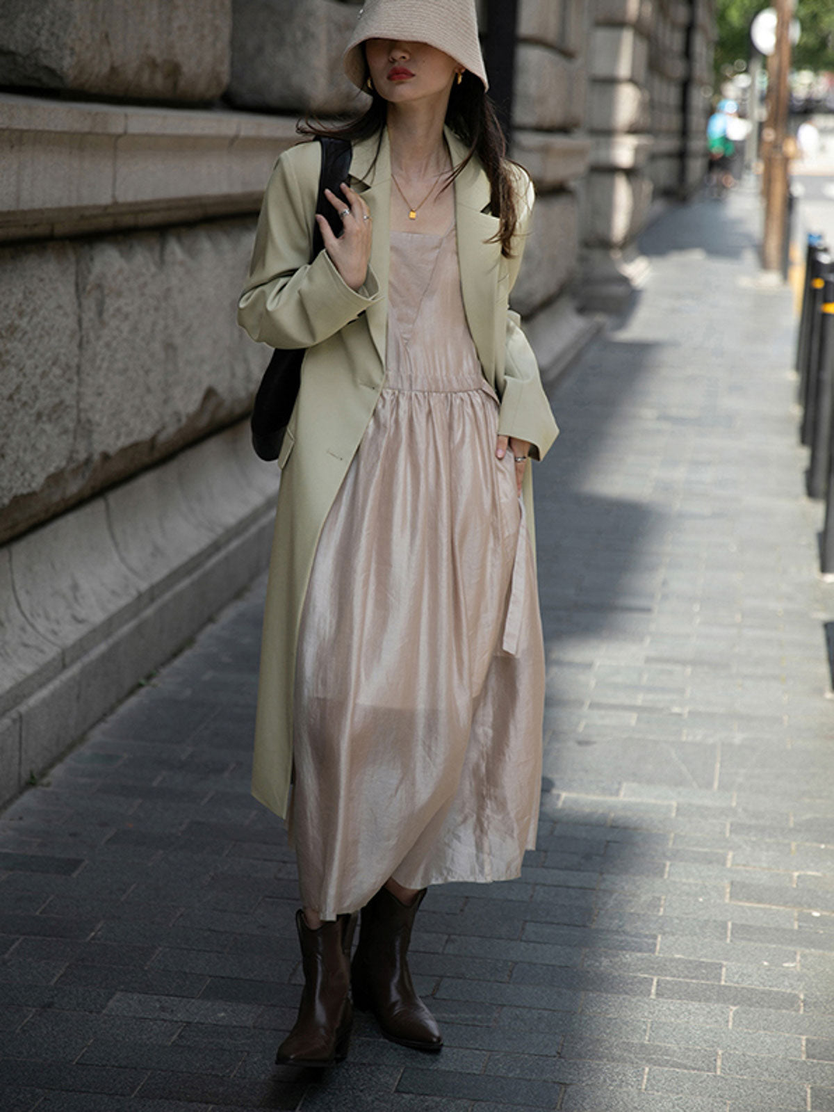 このドレスは、柔らかく穏やかなヌードピンクの色調が特徴で、静かで上品な雰囲気を作り出します。胸元のトライアングルパッチがトラピーズネックラインを形成し、独特のデザインが視覚的な深みを加えます。ウエスト部分にはシャーリングディテールがあり、純色に豊かな視覚効果を与え、前後にタイの装飾が施されています。これによりウエストを引き締め、サイドで結ぶことで可愛らしくスリムなシルエットを実現します。素材は84%テンセルと16%ポリエステルの混紡で、ウォッシュ加工を施した後、柔らかくふんわりとした手触りになり、快適で通気性に優れています。光の下で微細な光沢感を放ち、重くならず、夏には単独で、春秋にはジャケットと合わせてエレガントなスタイルを楽しむことができます。