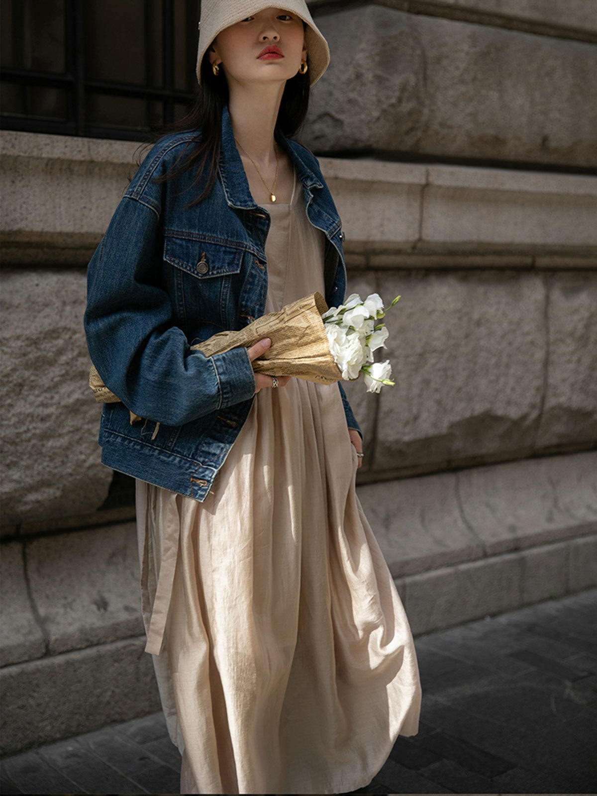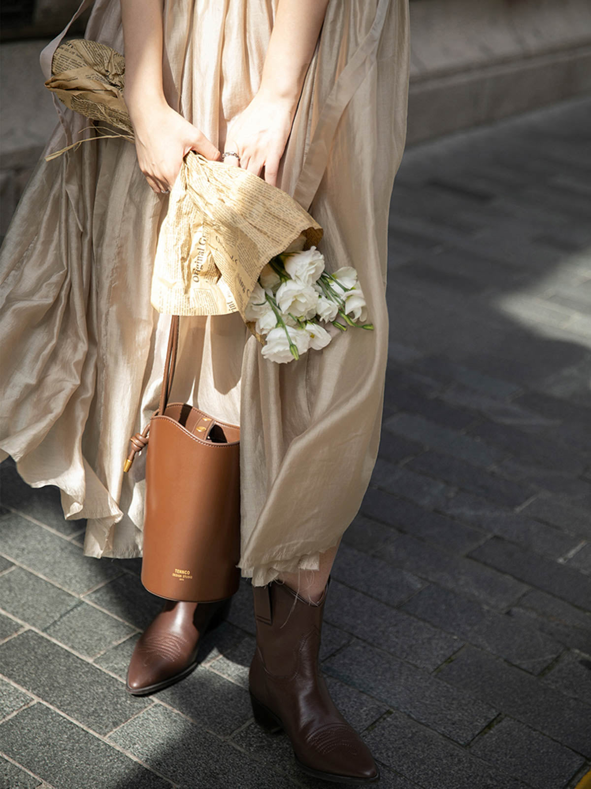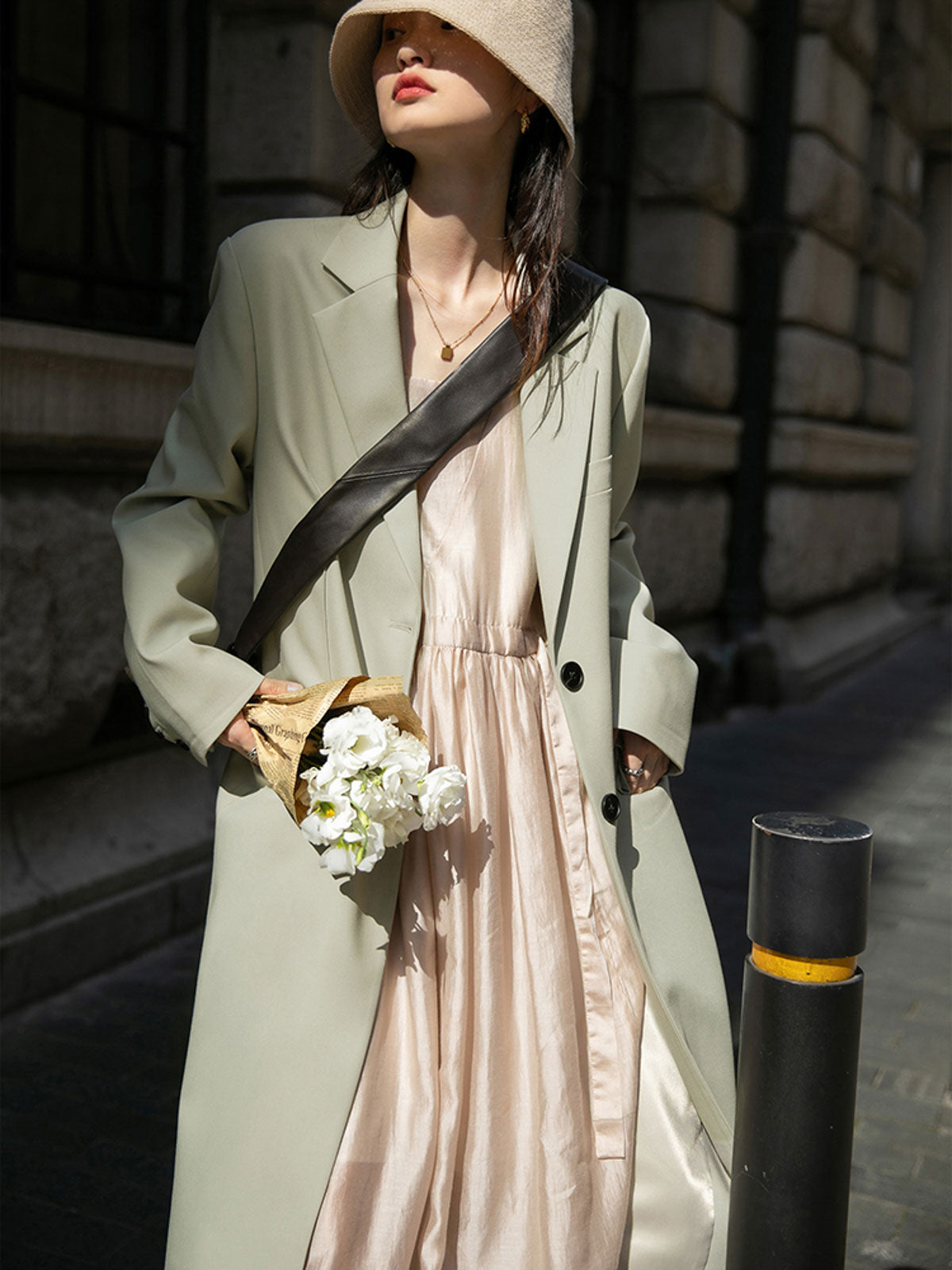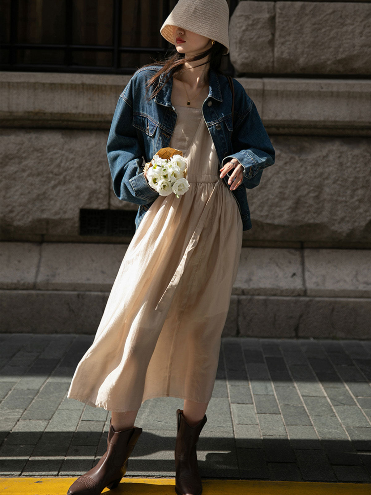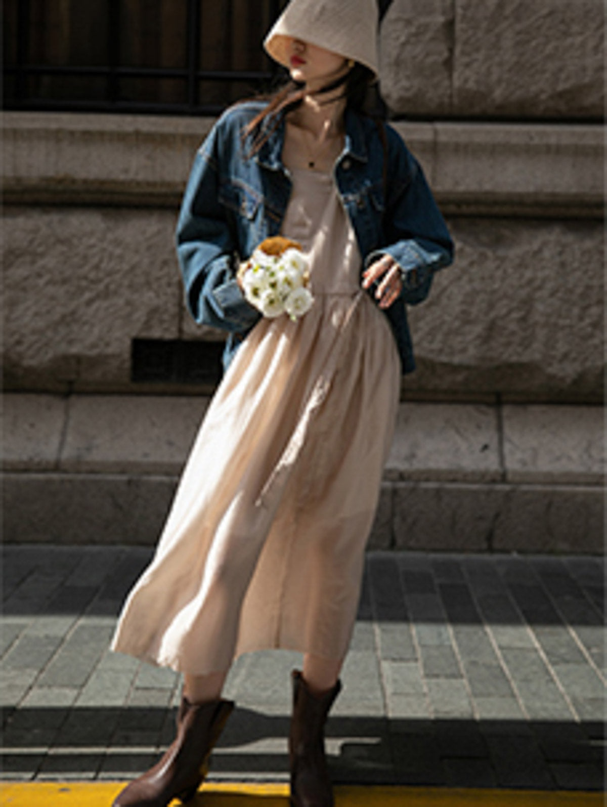 このドレスは、柔らかく穏やかなヌードピンクの色調が特徴で、静かで上品な雰囲気を作り出します。胸元のトライアングルパッチがトラピーズネックラインを形成し、独特のデザインが視覚的な深みを加えます。ウエスト部分にはシャーリングディテールがあり、純色に豊かな視覚効果を与え、前後にタイの装飾が施されています。これによりウエストを引き締め、サイドで結ぶことで可愛らしくスリムなシルエットを実現します。素材は84%テンセルと16%ポリエステルの混紡で、ウォッシュ加工を施した後、柔らかくふんわりとした手触りになり、快適で通気性に優れています。光の下で微細な光沢感を放ち、重くならず、夏には単独で、春秋にはジャケットと合わせてエレガントなスタイルを楽しむことができます。