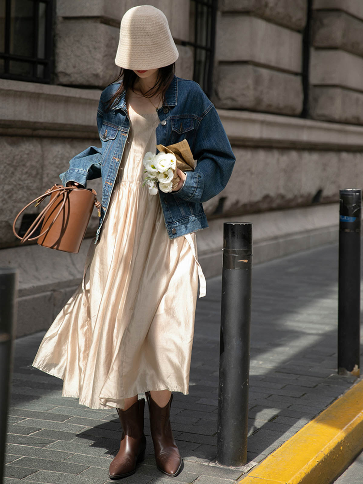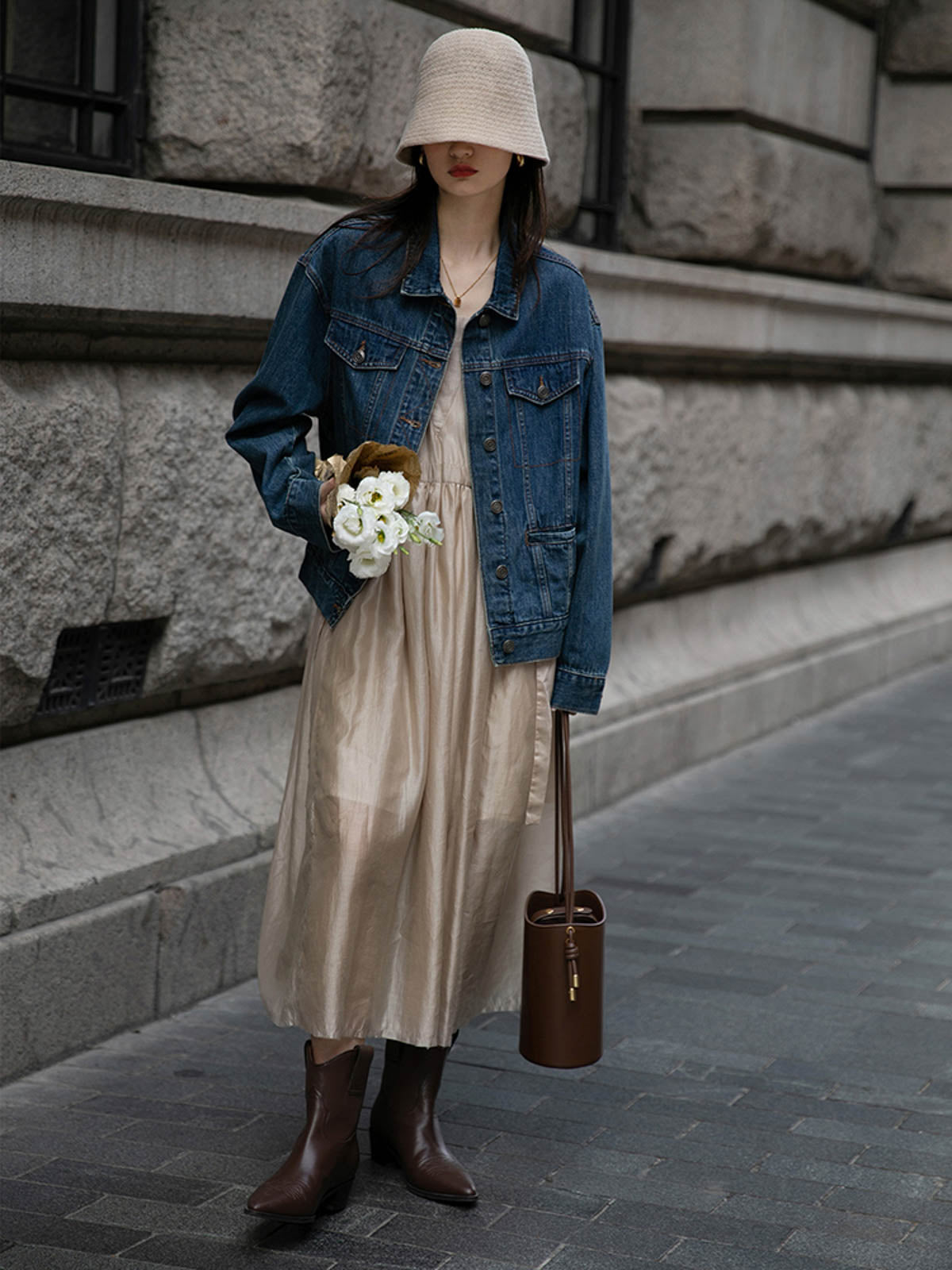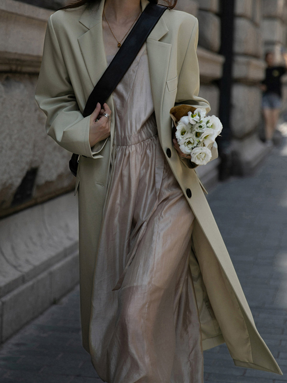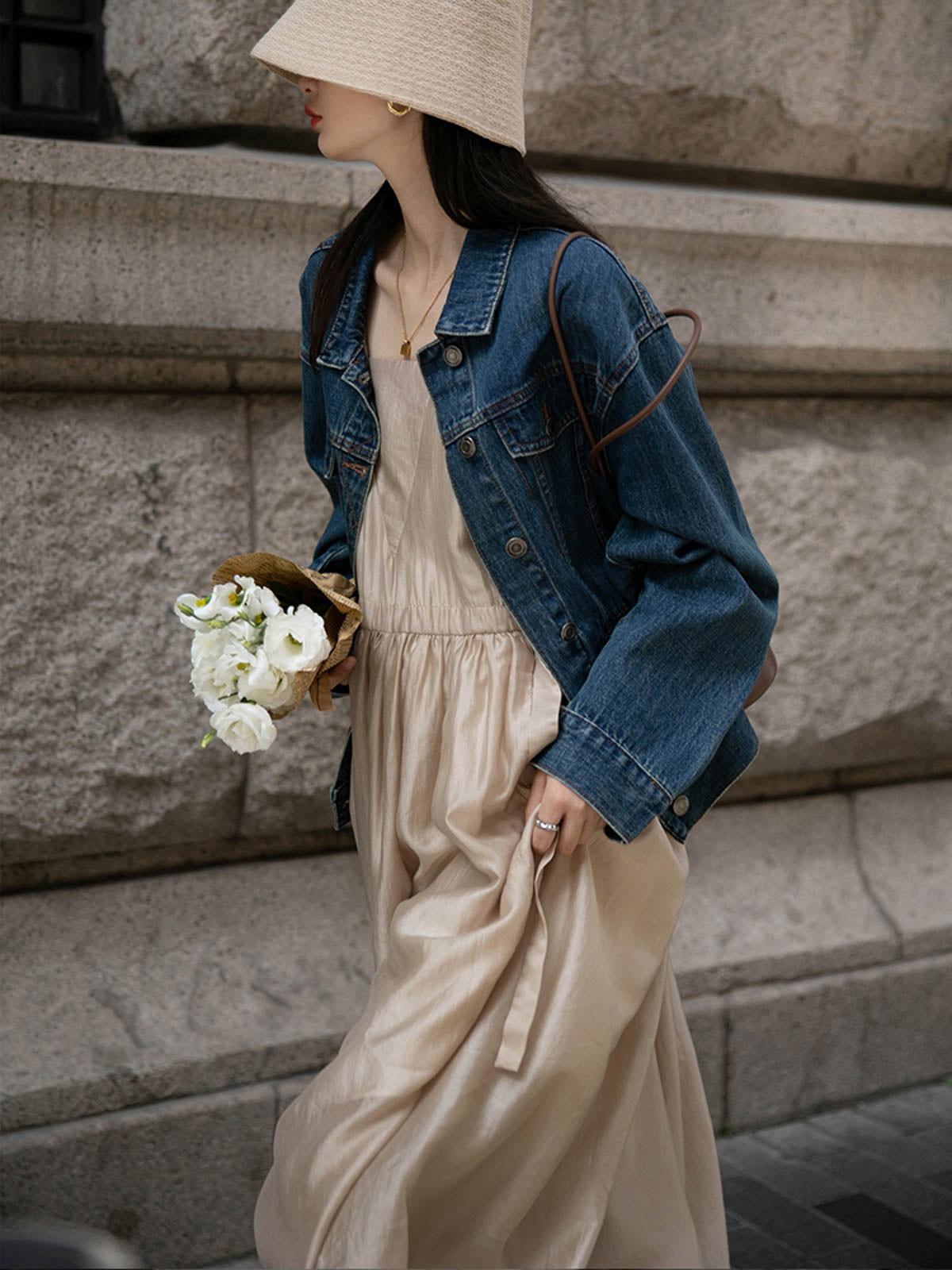 このドレスは、柔らかく穏やかなヌードピンクの色調が特徴で、静かで上品な雰囲気を作り出します。胸元のトライアングルパッチがトラピーズネックラインを形成し、独特のデザインが視覚的な深みを加えます。ウエスト部分にはシャーリングディテールがあり、純色に豊かな視覚効果を与え、前後にタイの装飾が施されています。これによりウエストを引き締め、サイドで結ぶことで可愛らしくスリムなシルエットを実現します。素材は84%テンセルと16%ポリエステルの混紡で、ウォッシュ加工を施した後、柔らかくふんわりとした手触りになり、快適で通気性に優れています。光の下で微細な光沢感を放ち、重くならず、夏には単独で、春秋にはジャケットと合わせてエレガントなスタイルを楽しむことができます。