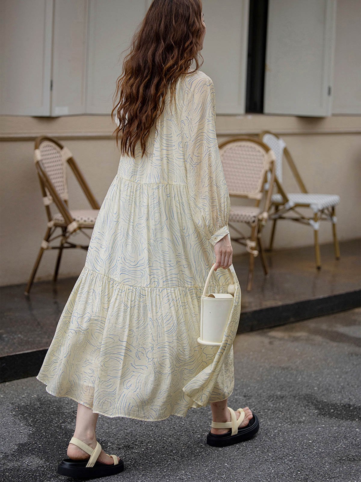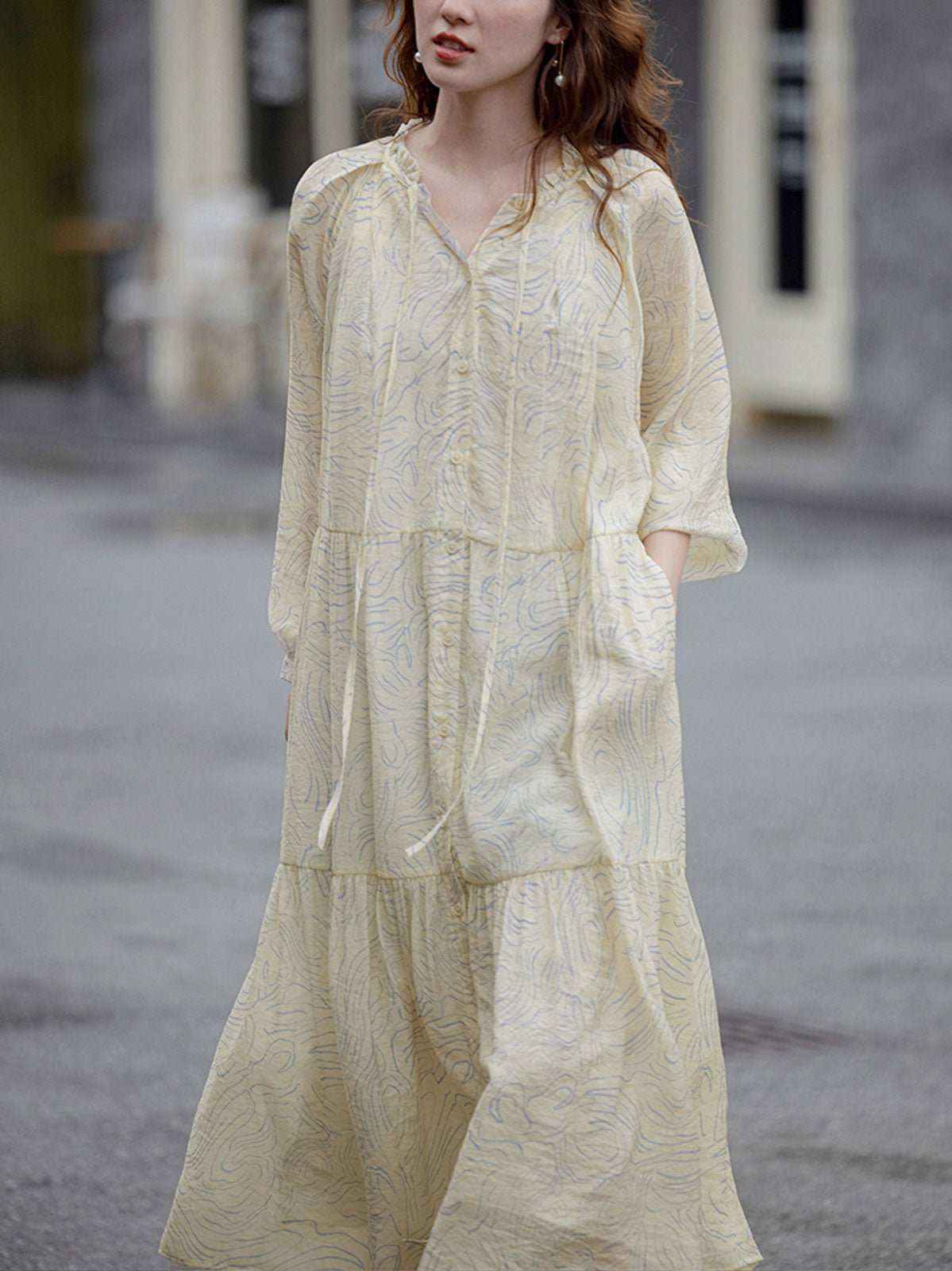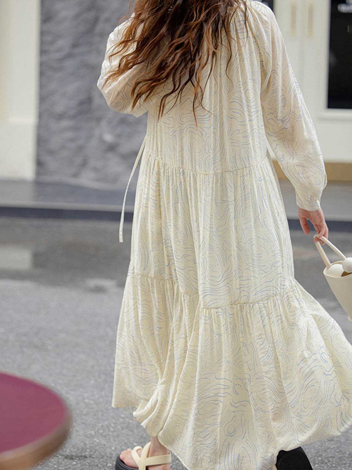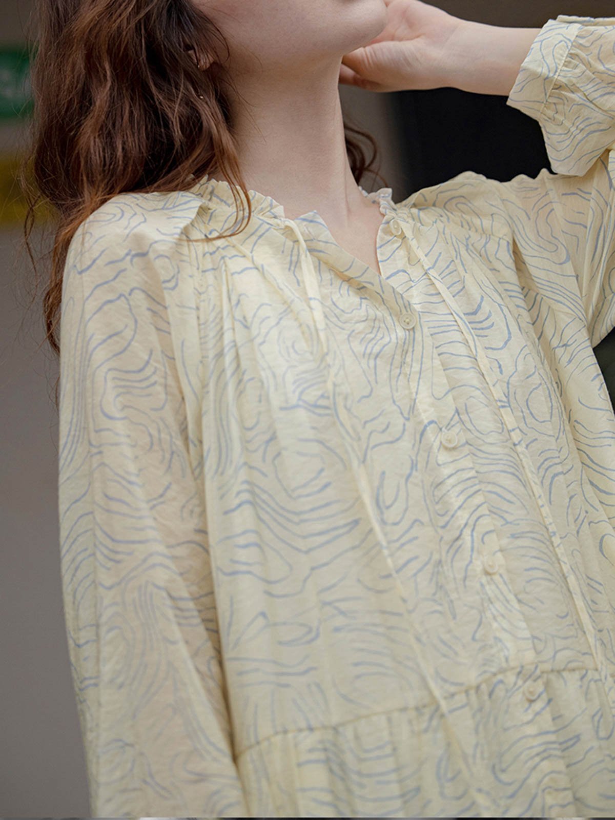 このロングドレスはシミズウェーブシリーズに属し、ゆったりとしたシルエットで体型を選ばず着用できます。ブルーのウェーブ模様が全体に広がり、女性の柔らかさと芸術的な雰囲気を強調しています。小さなホワイトボタンが前立てを飾り、カジュアルな印象を与えます。シンプルで快適なラウンドネックデザインは、周りにフリルとギャザーが施されており、繊細な美しさと文学的な気質を加えます。ネックラインのリボンがシンプルな中にもデザイン性を感じさせます。ゆったりとしたロングスカートは、ふんわりとしたシルエットを作り出し、風に揺れるスカートが少女のような心情を表現します。生地は滑らかで雲のように柔らかく、肌触りが良く通気性に優れ、ロマンチックで美しいです。