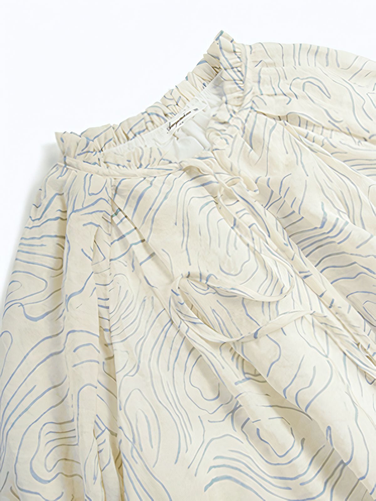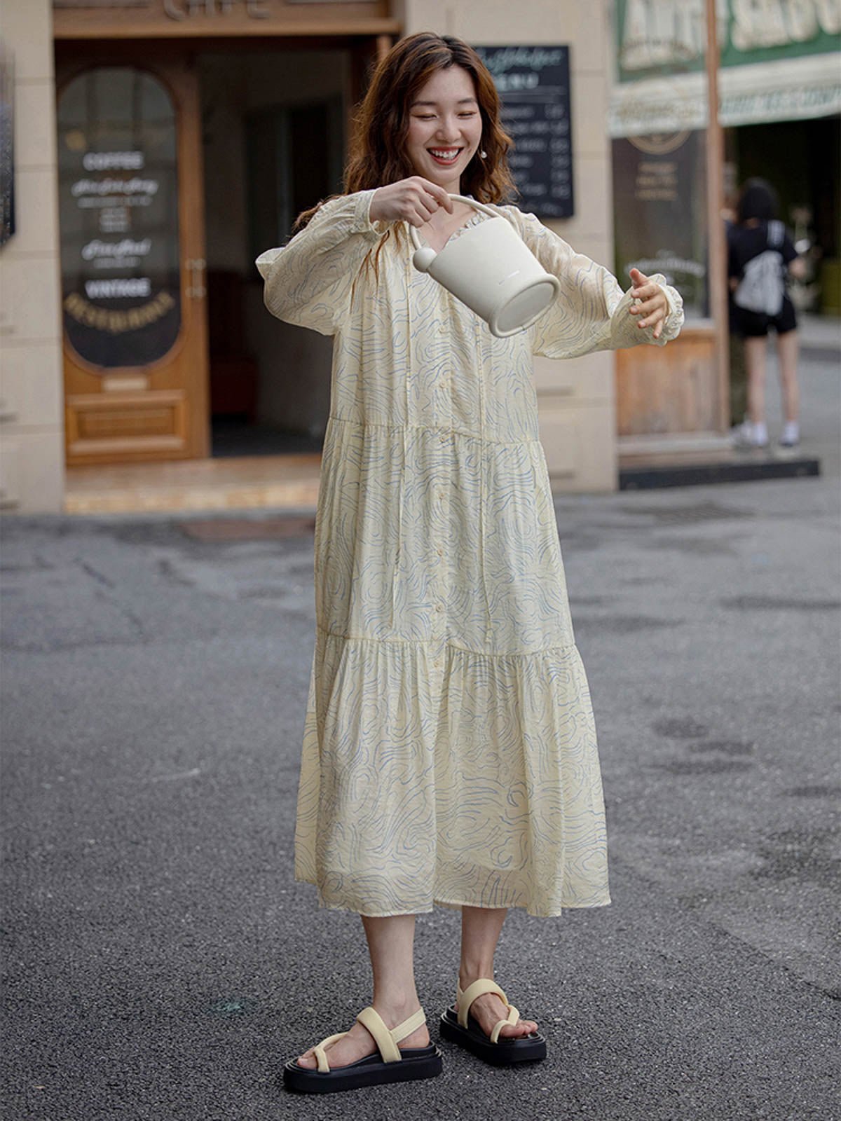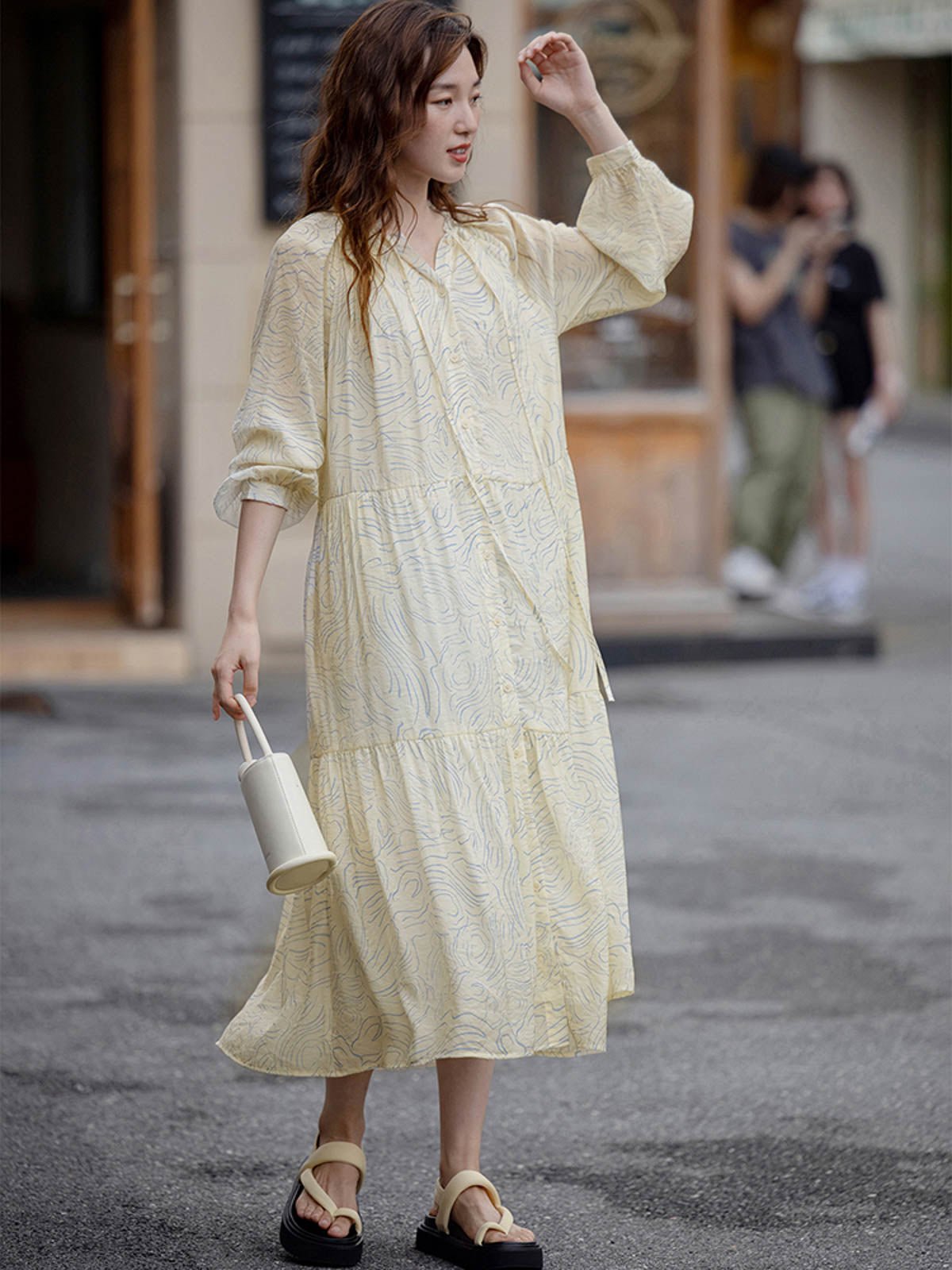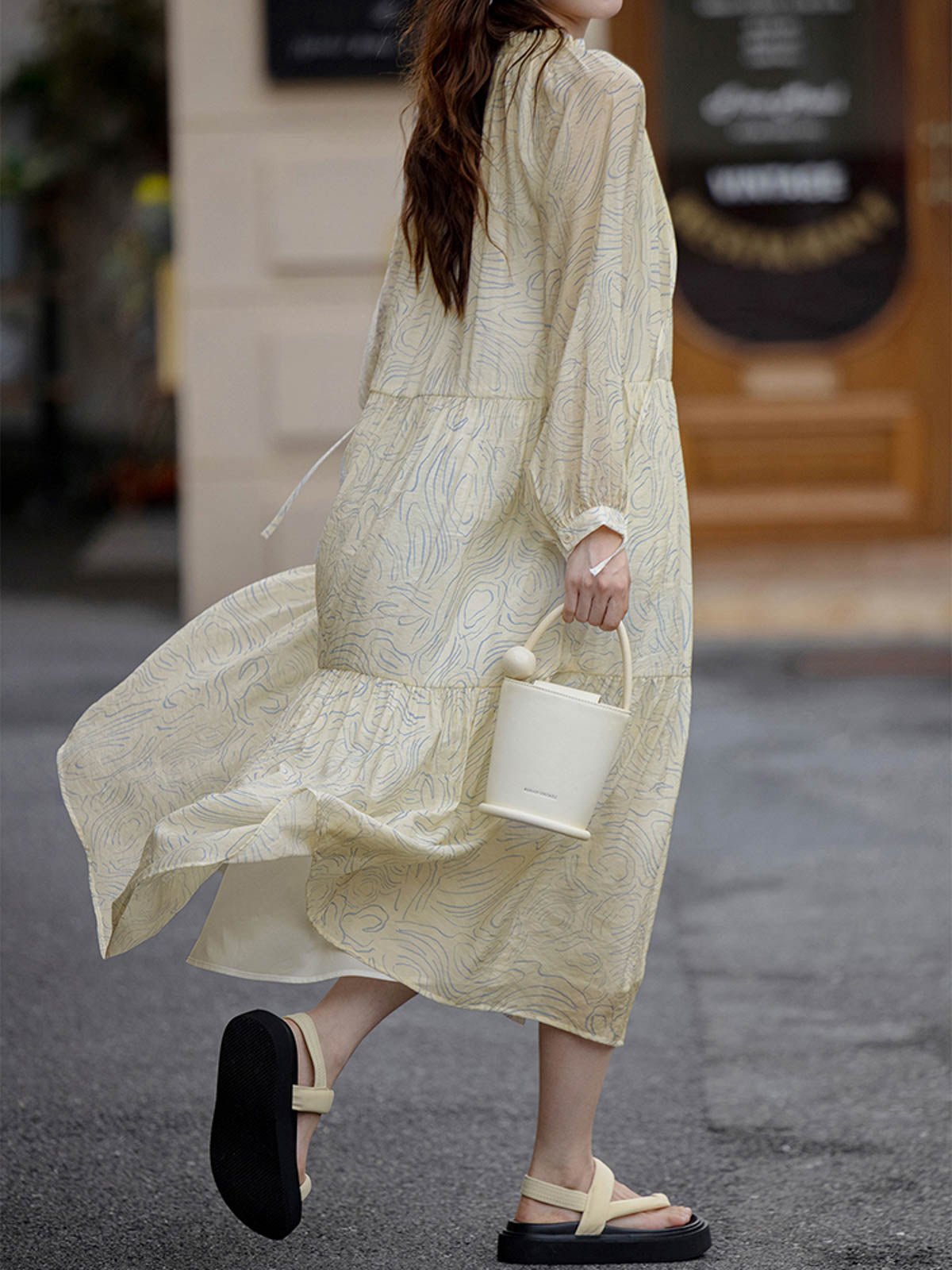 このロングドレスはシミズウェーブシリーズに属し、ゆったりとしたシルエットで体型を選ばず着用できます。ブルーのウェーブ模様が全体に広がり、女性の柔らかさと芸術的な雰囲気を強調しています。小さなホワイトボタンが前立てを飾り、カジュアルな印象を与えます。シンプルで快適なラウンドネックデザインは、周りにフリルとギャザーが施されており、繊細な美しさと文学的な気質を加えます。ネックラインのリボンがシンプルな中にもデザイン性を感じさせます。ゆったりとしたロングスカートは、ふんわりとしたシルエットを作り出し、風に揺れるスカートが少女のような心情を表現します。生地は滑らかで雲のように柔らかく、肌触りが良く通気性に優れ、ロマンチックで美しいです。