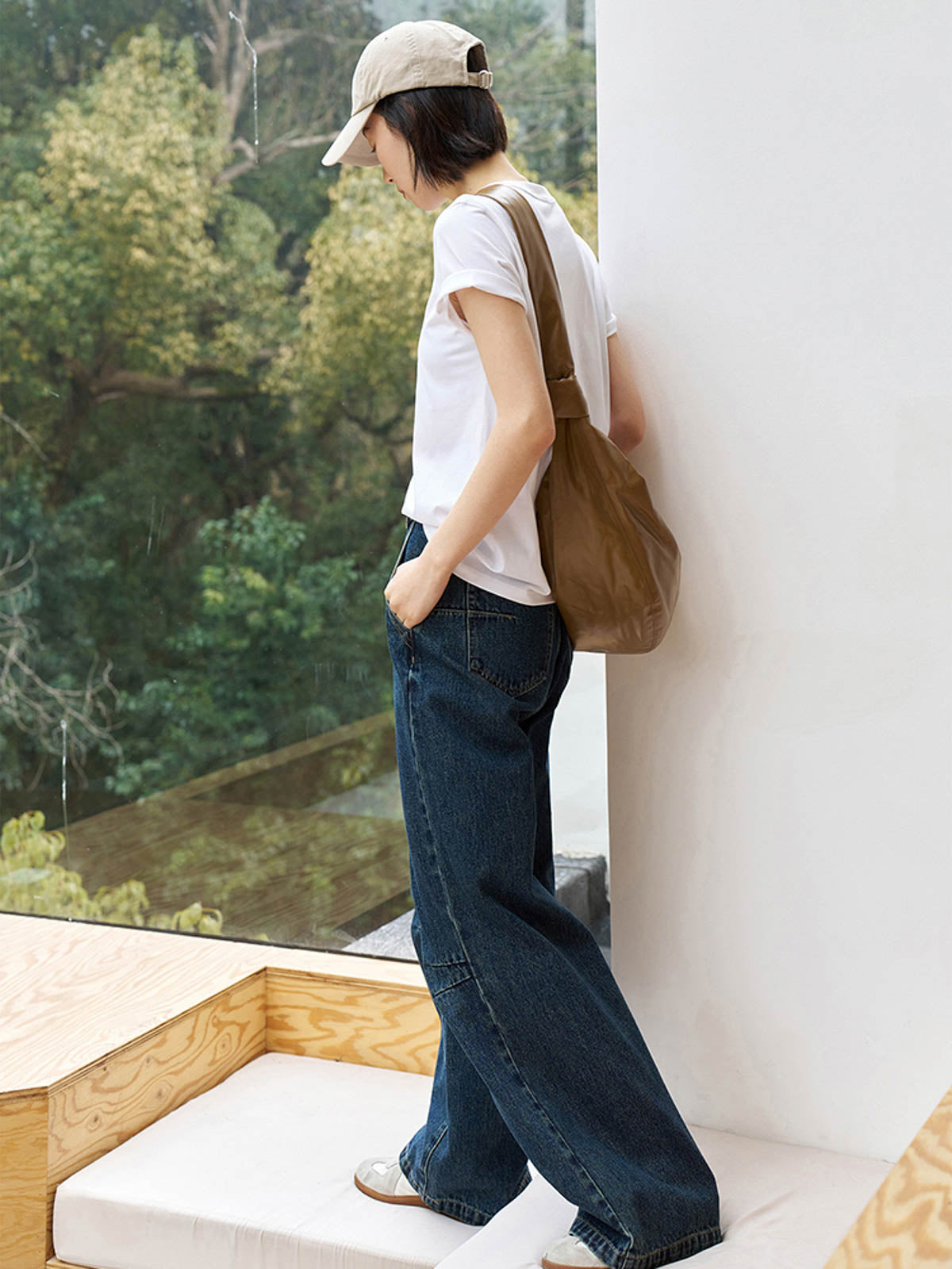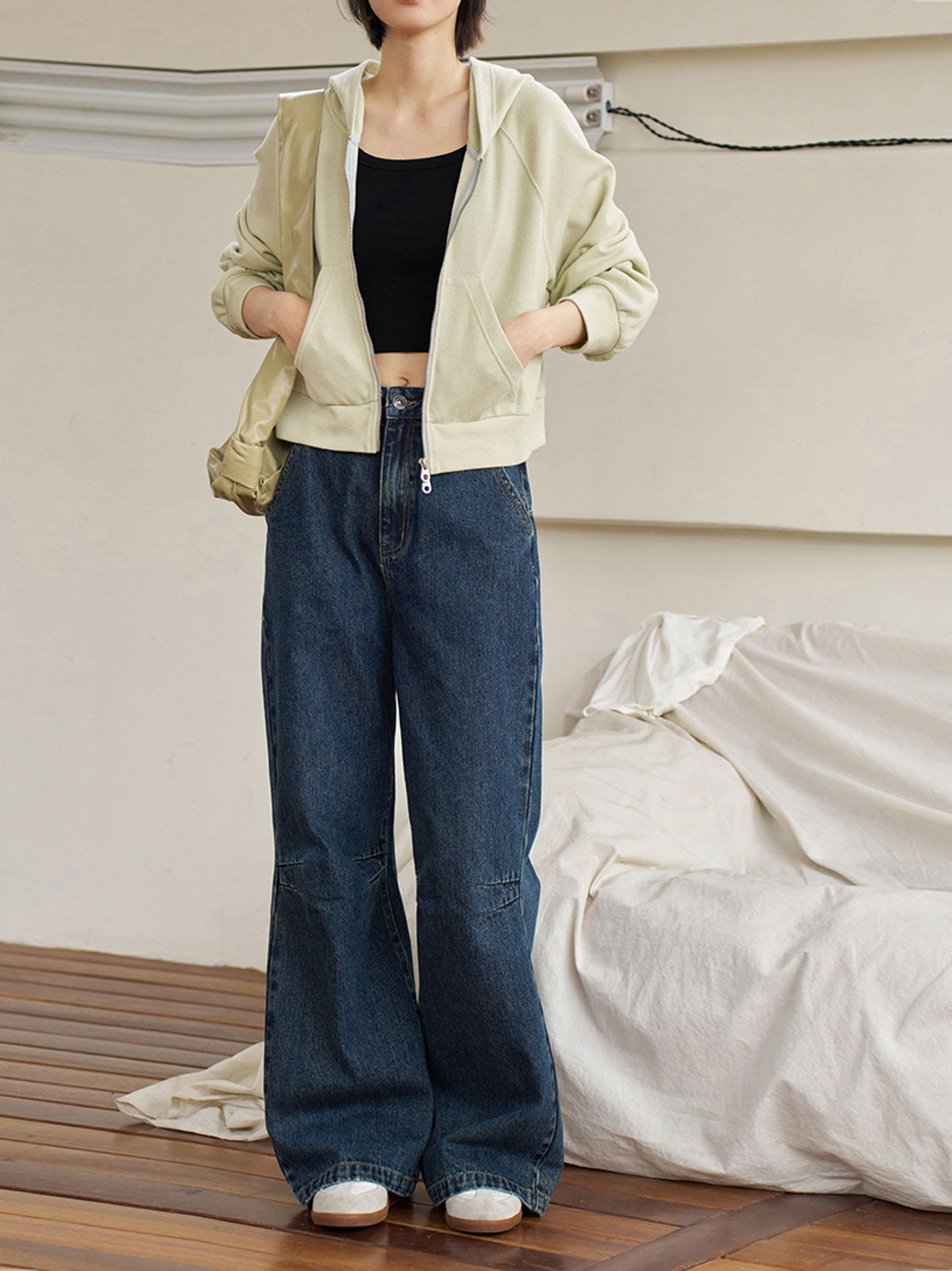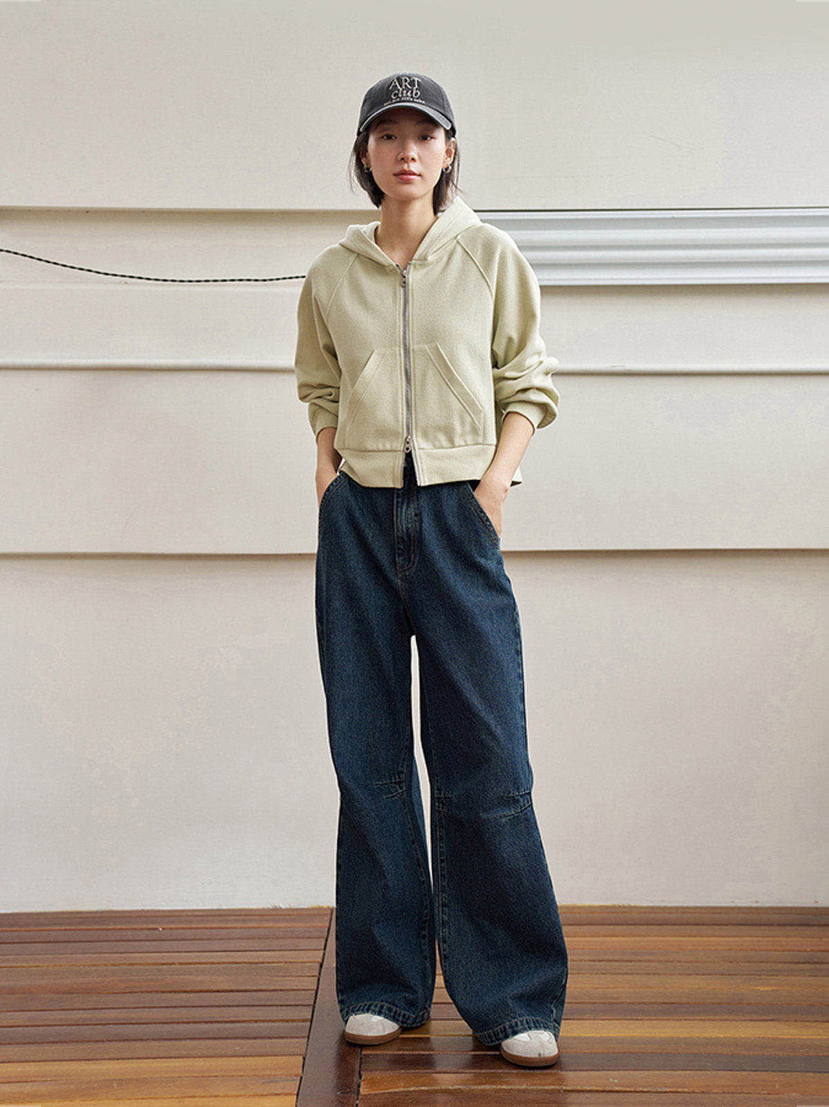このデニムパンツは、ディープなレトロブルーを生み出すために徹底したウォッシュ加工を施しています。ハイウエストのストレートフィットで、パンツレッグがしっかりとした形状を保ち、足元に軽くドラッグする長さで無骨でクールなスタイルを演出します。脚のラインを美しく見せ、スリムで背が高く見える効果があります。ハードで厚みのあるウォッシュドデニムコットンを使用しており、快適さと形状保持を両立しています。裾のフリンジディテールがストリート感と個性をプラス。斜めのフロントポケットとバックパッチポケットは実用性と美しさを兼ね備えたデザインです。シンプルながらも独特なスタイルで、日常のカジュアルコーディネートに最適です。