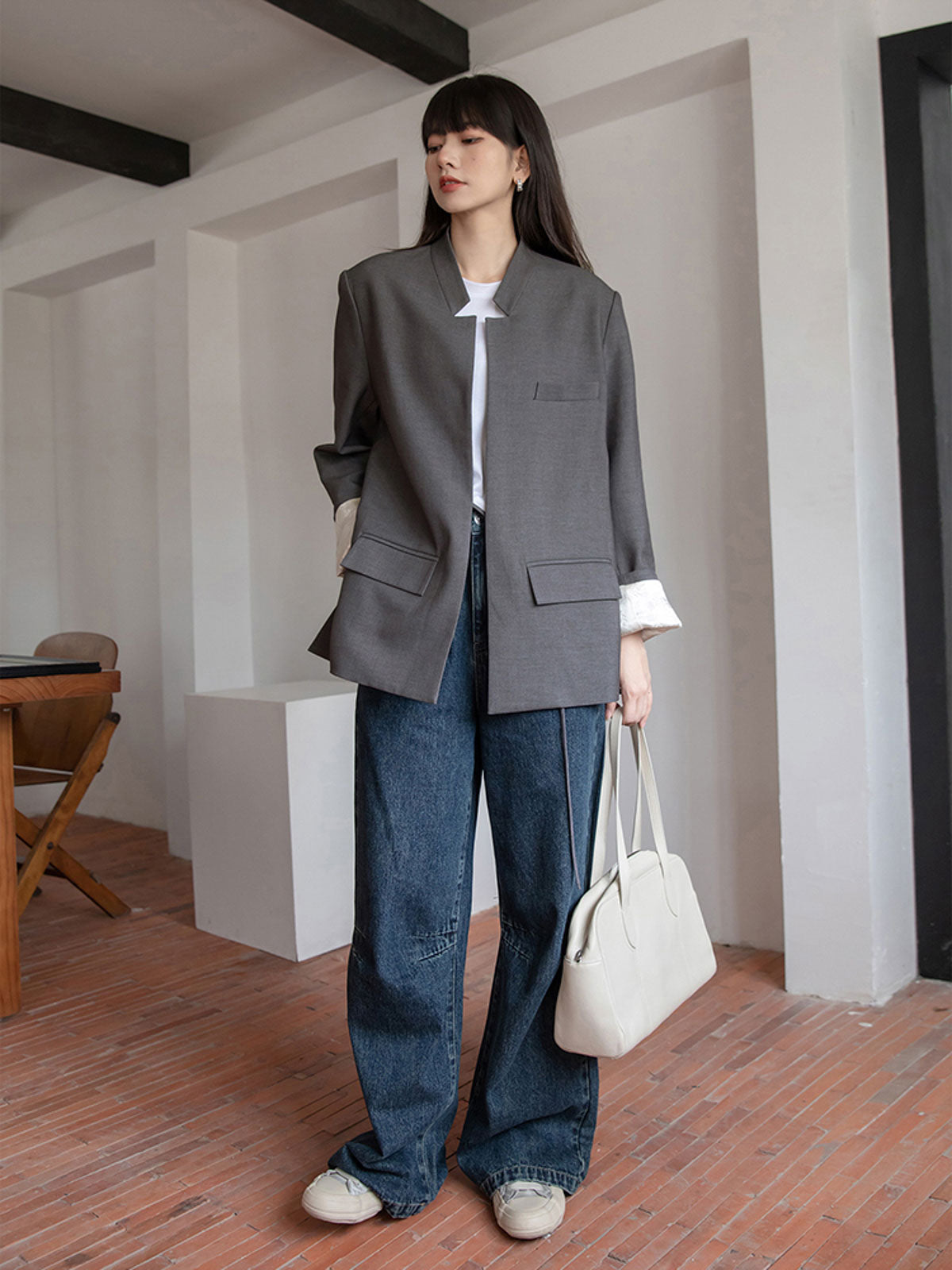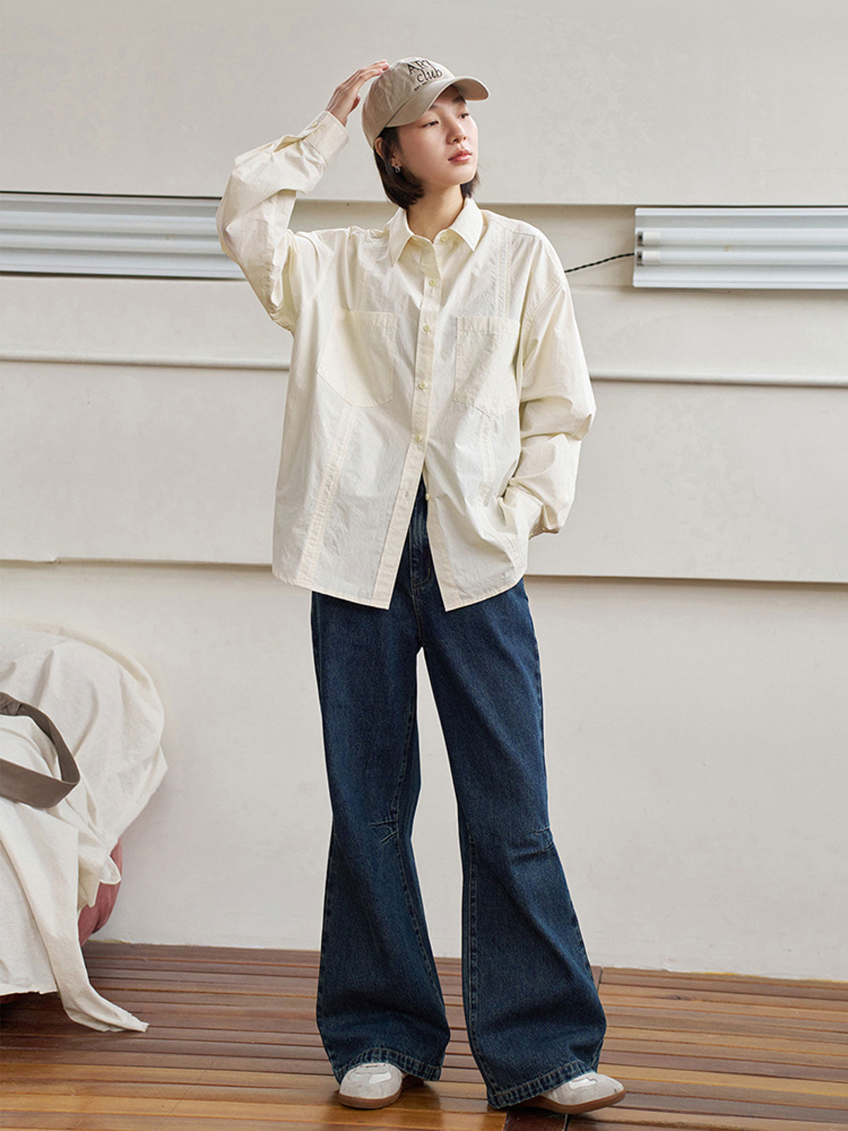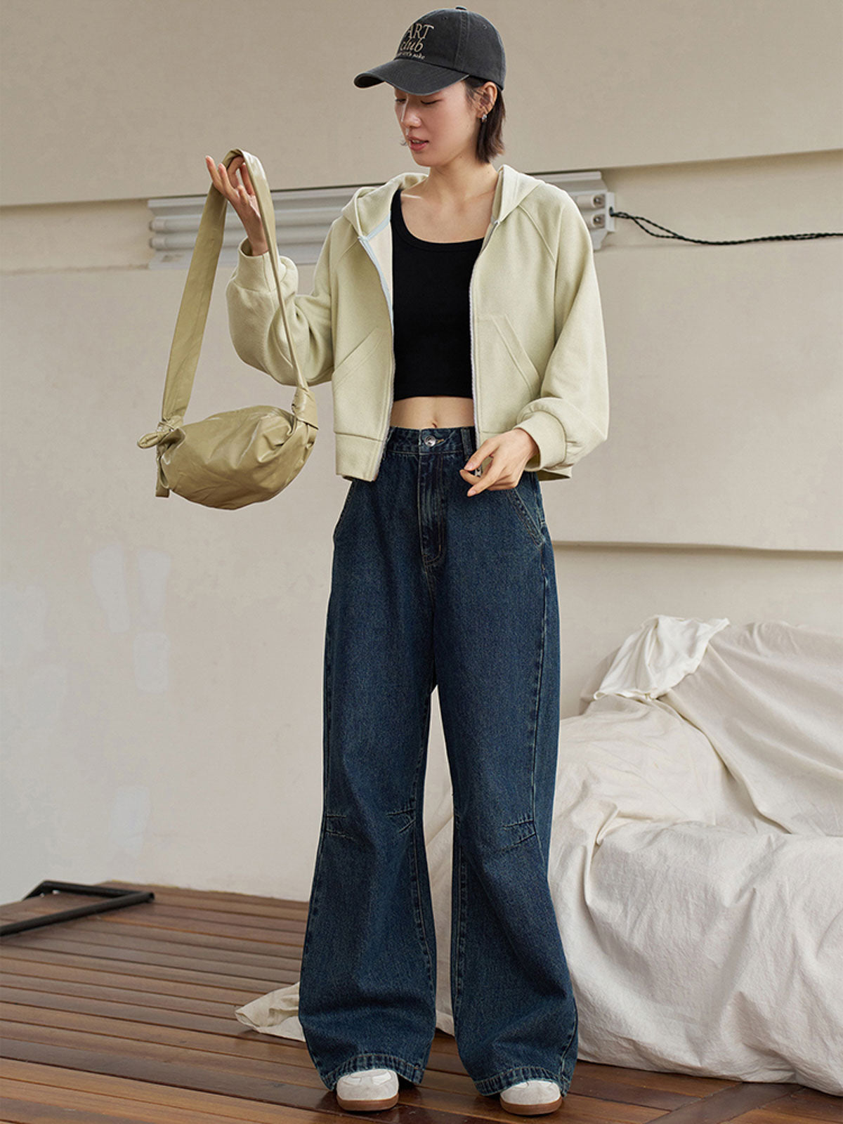このデニムパンツは、ディープなレトロブルーを生み出すために徹底したウォッシュ加工を施しています。ハイウエストのストレートフィットで、パンツレッグがしっかりとした形状を保ち、足元に軽くドラッグする長さで無骨でクールなスタイルを演出します。脚のラインを美しく見せ、スリムで背が高く見える効果があります。ハードで厚みのあるウォッシュドデニムコットンを使用しており、快適さと形状保持を両立しています。裾のフリンジディテールがストリート感と個性をプラス。斜めのフロントポケットとバックパッチポケットは実用性と美しさを兼ね備えたデザインです。シンプルながらも独特なスタイルで、日常のカジュアルコーディネートに最適です。