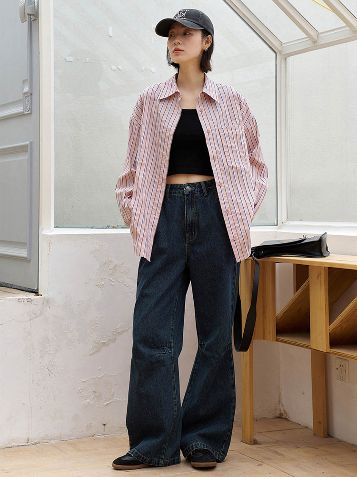 ハイウエストストレートデザイン、レトロでクールなスタイル、脚長効果あり。