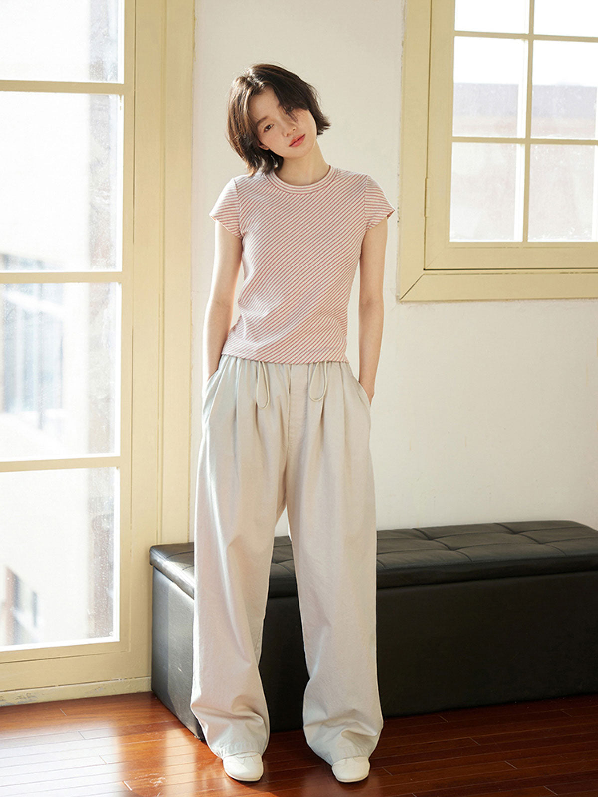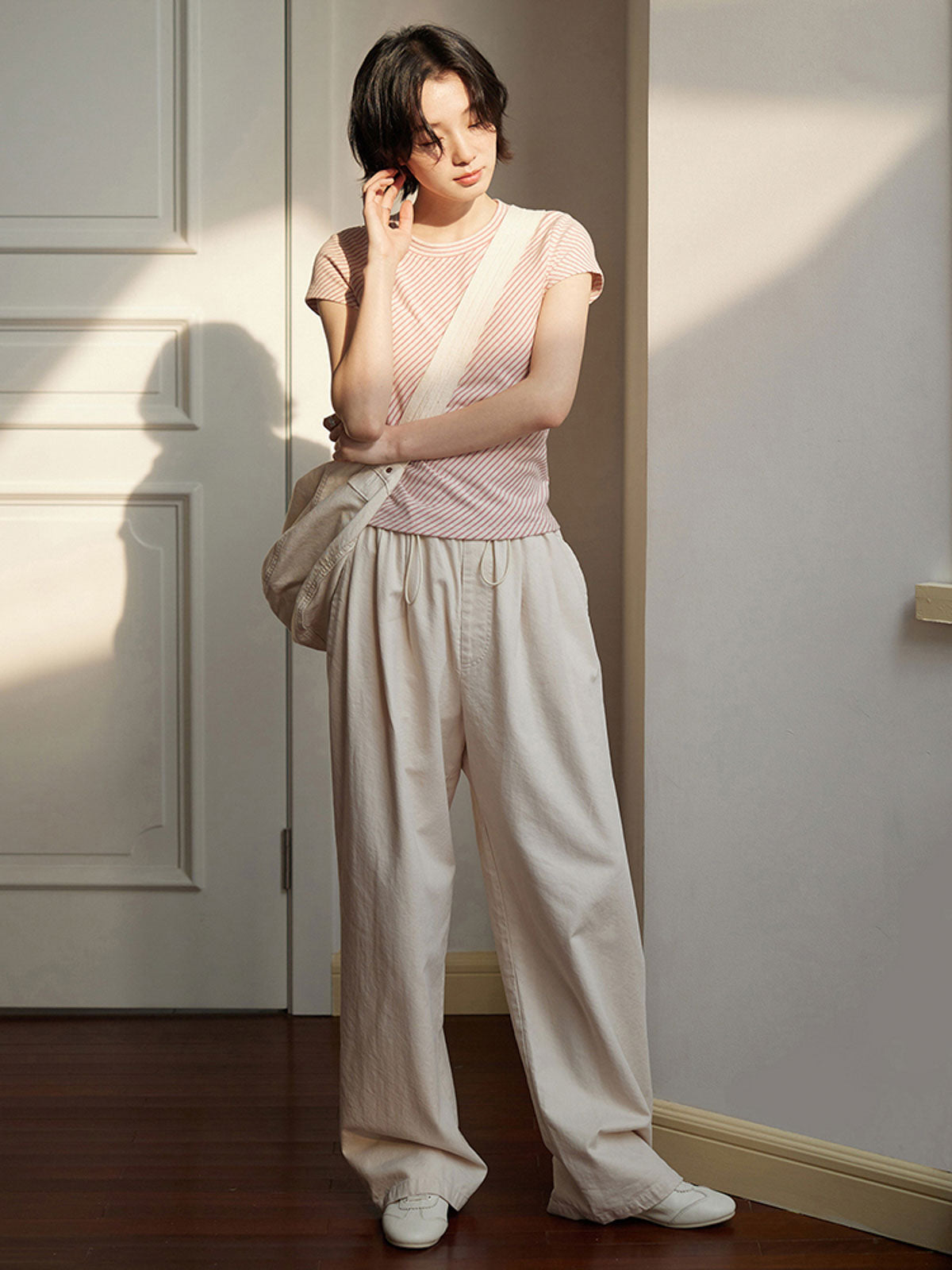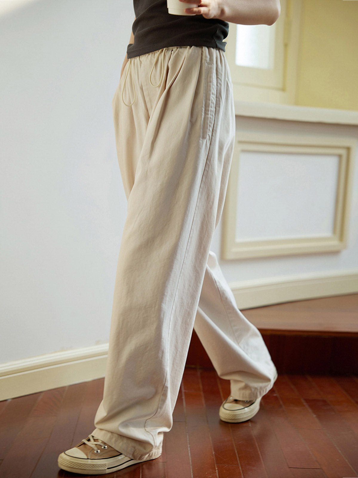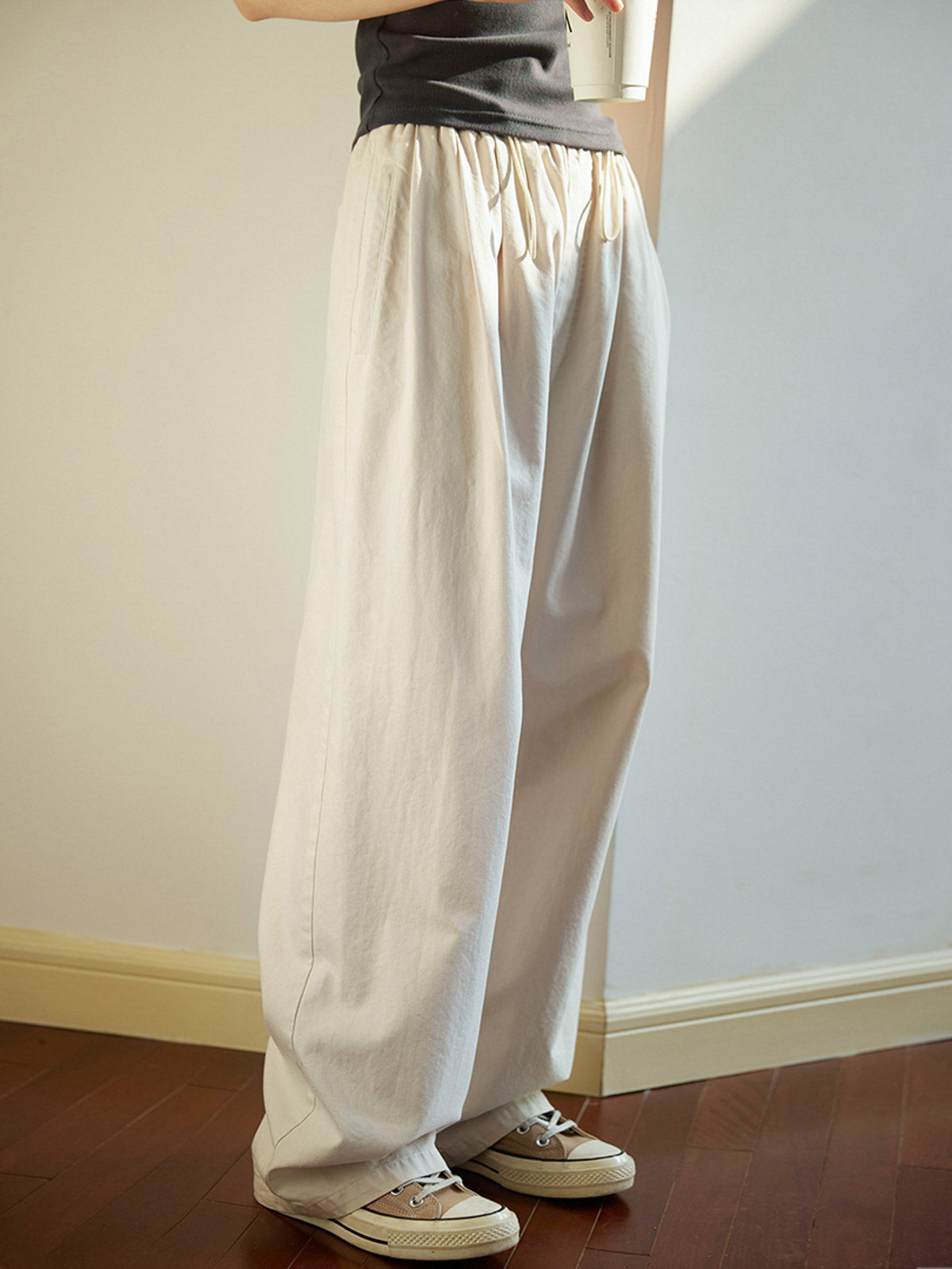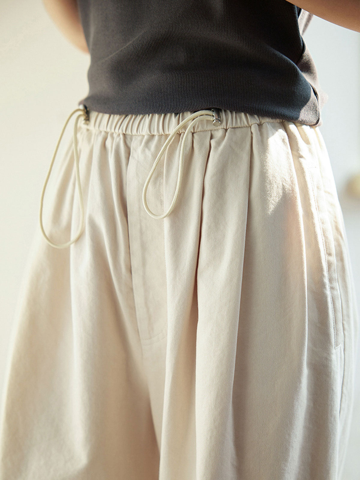 シンプルで優しいライトベージュのドローストリングウエストワイドレッグパンツ。快適でどんなスタイルにも合わせやすい。