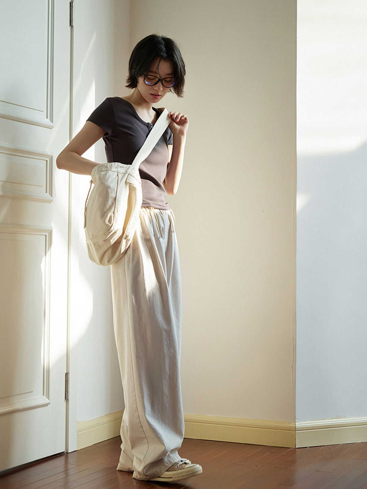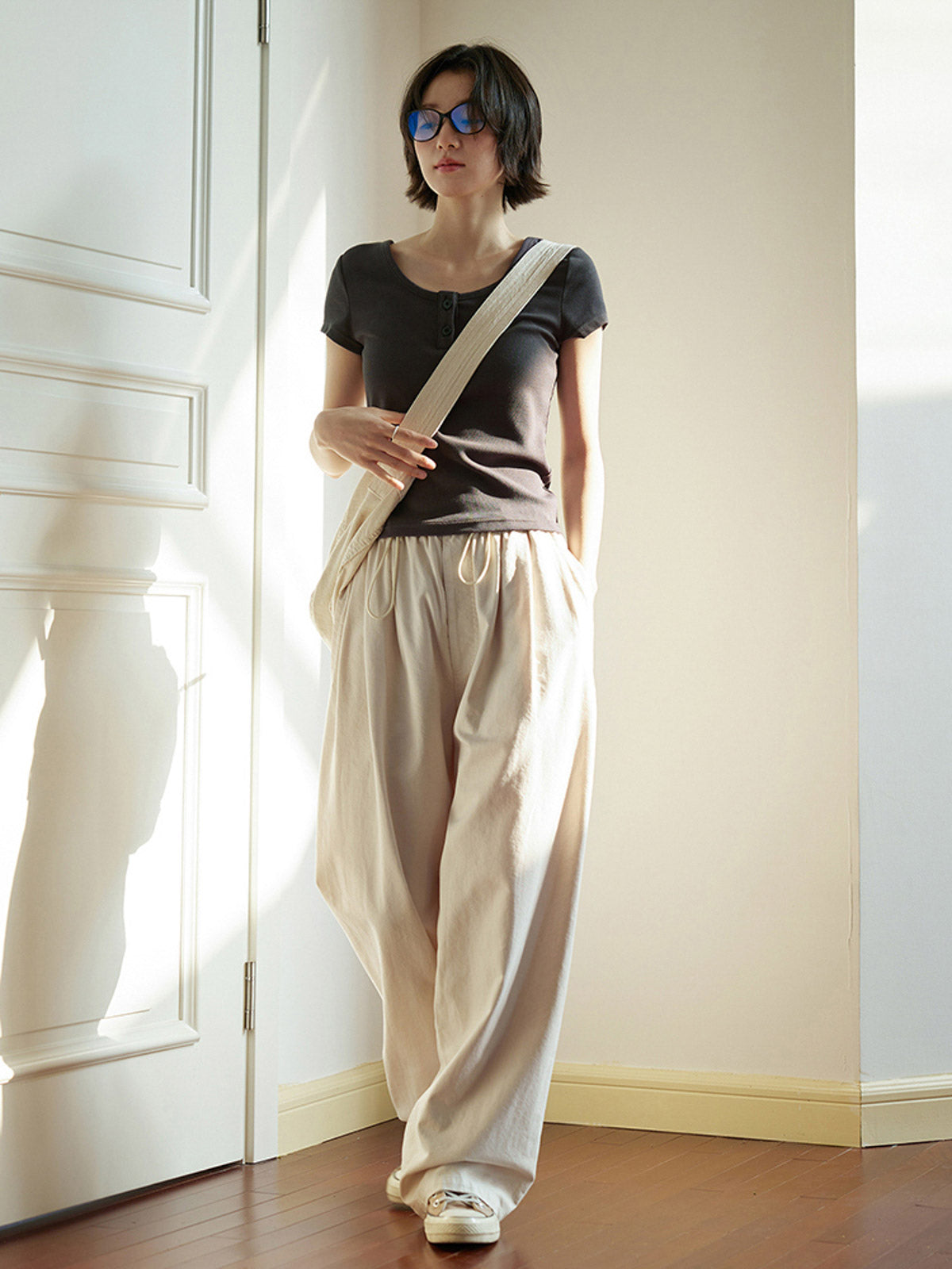 このパンツはシンプルで温かみのあるライトベージュカラーが特徴で、ナチュラルでレトロな雰囲気を醸し出します。ワイドレッグとハイウエストのデザインで、裾が少し靴の上にかかる長さがあり、スッキリとしたラインを演出し、体型をカバーしながらもスリムに見せます。ウエストはゴム仕様で、高いフィット感と快適さを提供し、ドローストリングで自由に調整可能です。素材にはドライで通気性の良い混紡コットンを使用しており、柔らかく滑らかな手触りと優れたドレープ性を持ち、美しいシルエットを作り出します。デイリーカジュアルから通勤まで、幅広いシーンで活躍する一枚です。
