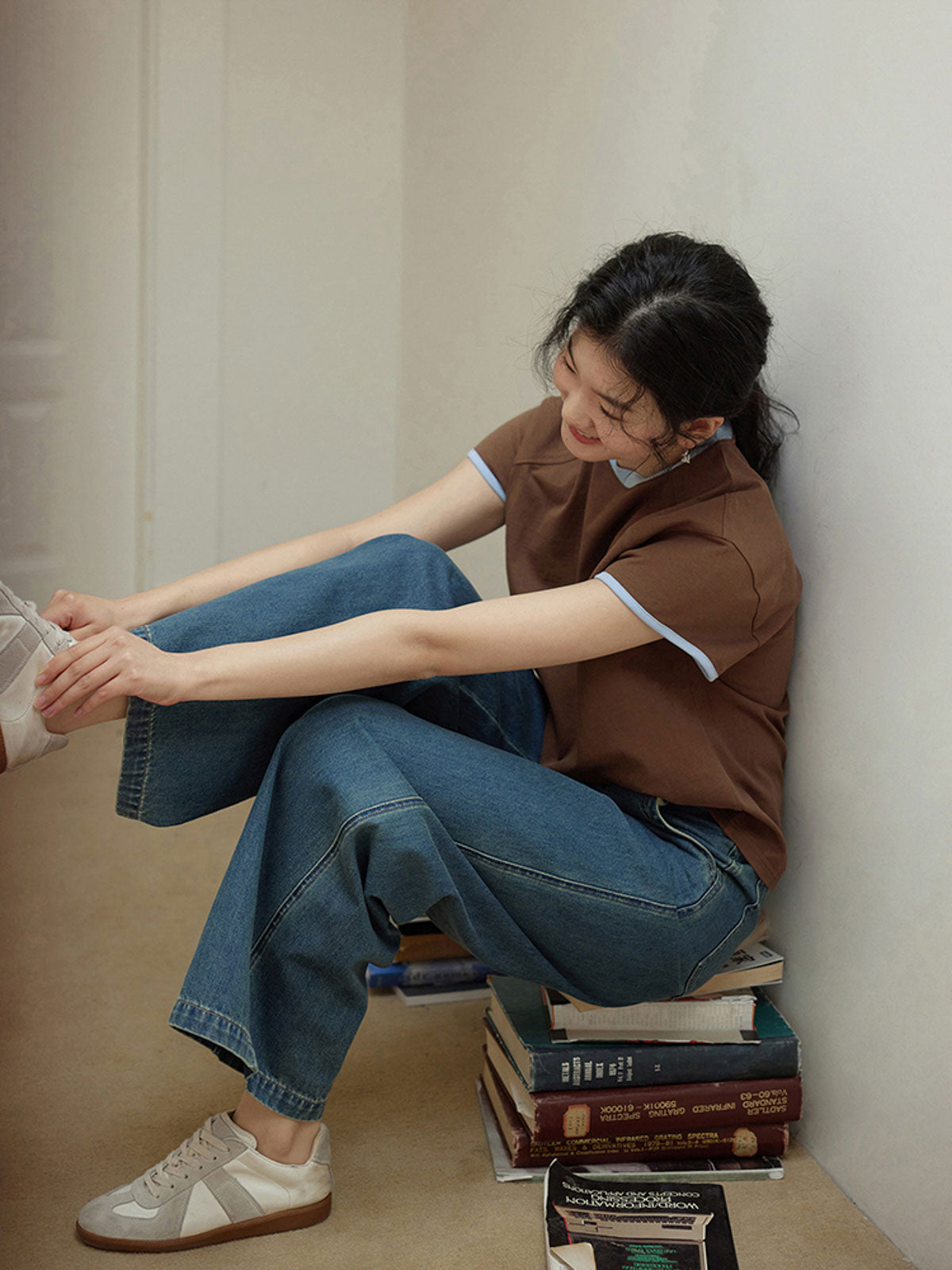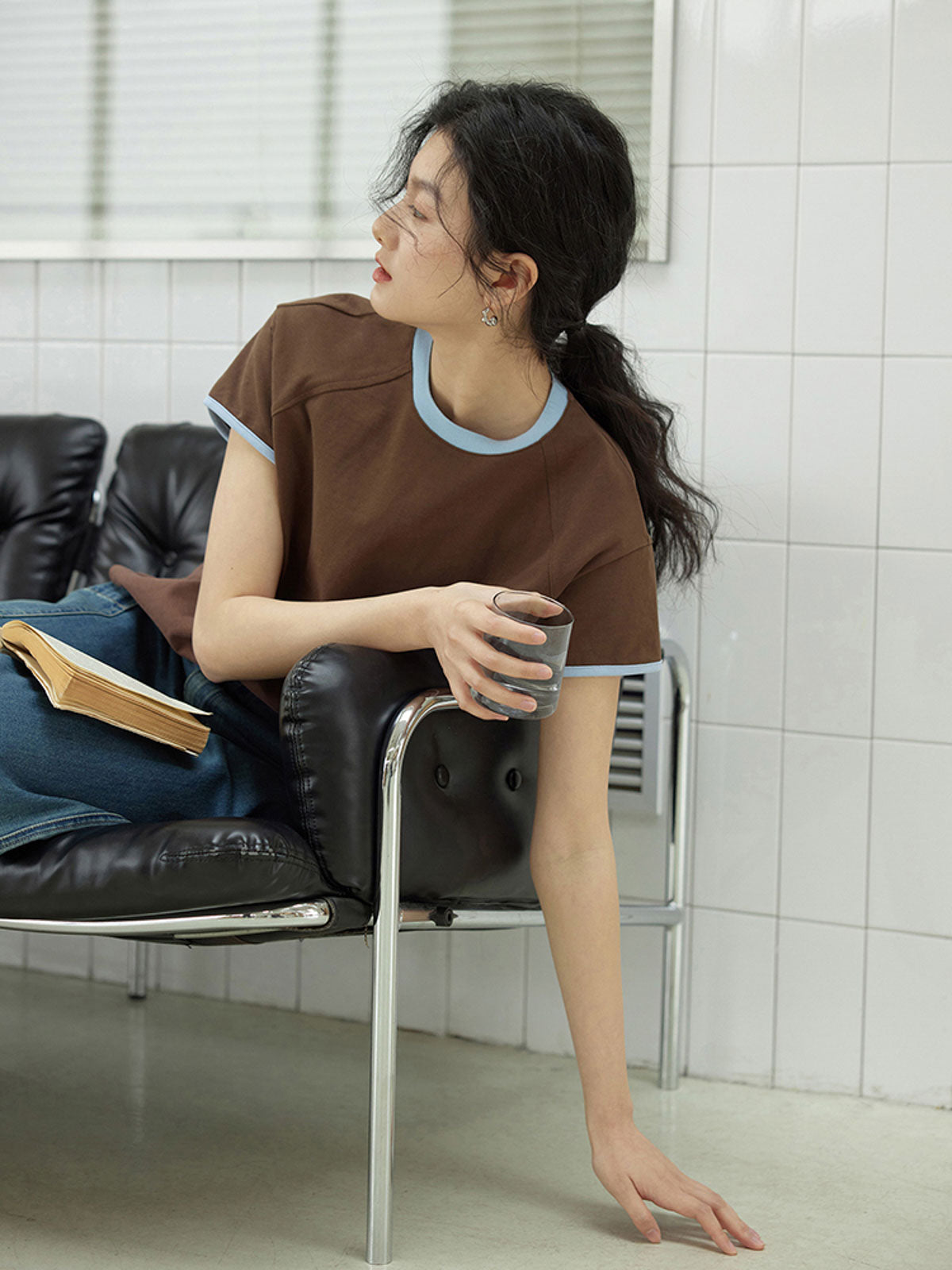 レトロとモダンの配色デザインを融合したブラウンのショートスリーブTシャツ、控えめなファッションを演出し、様々なカジュアルシーンに適しています。