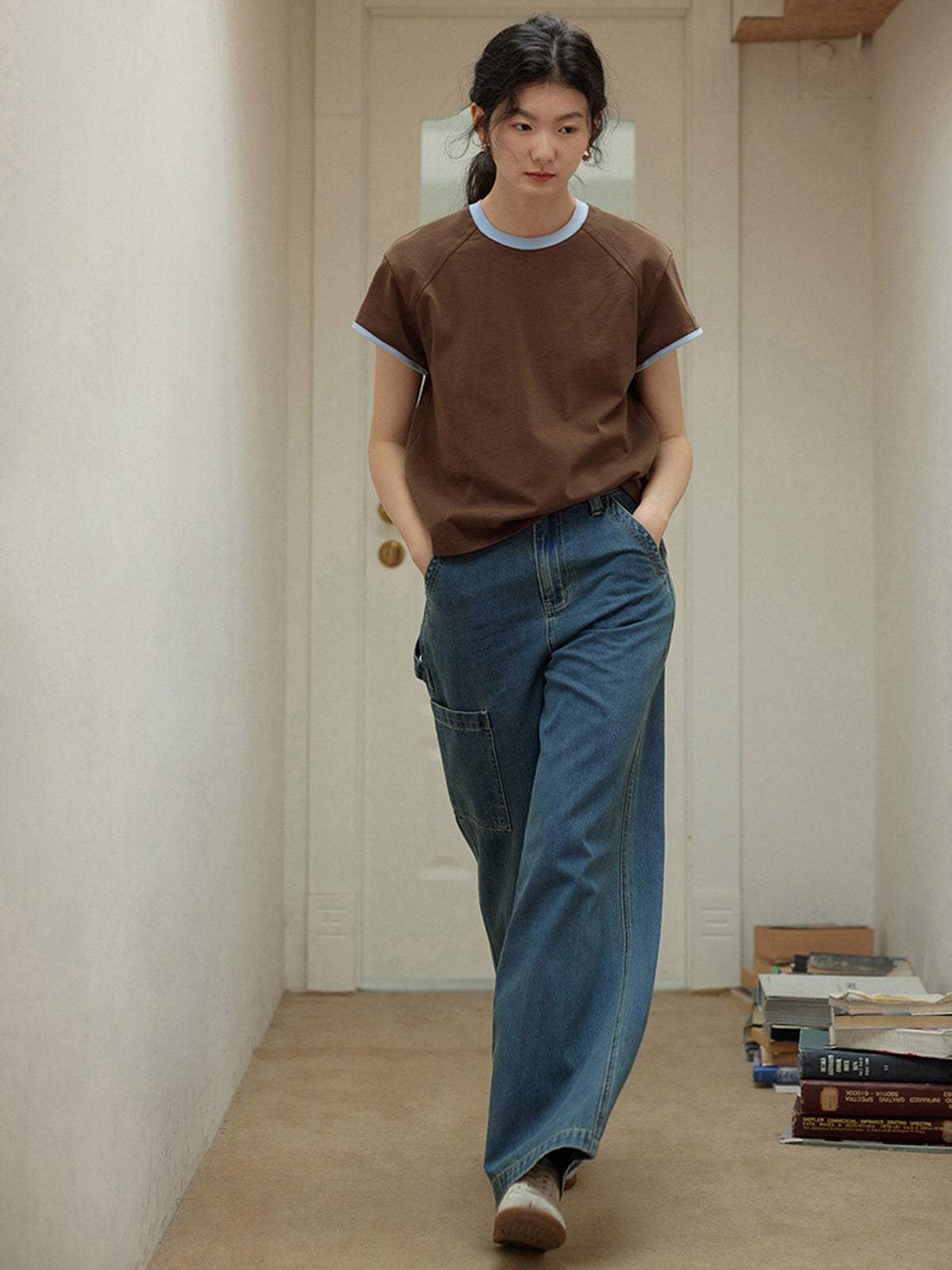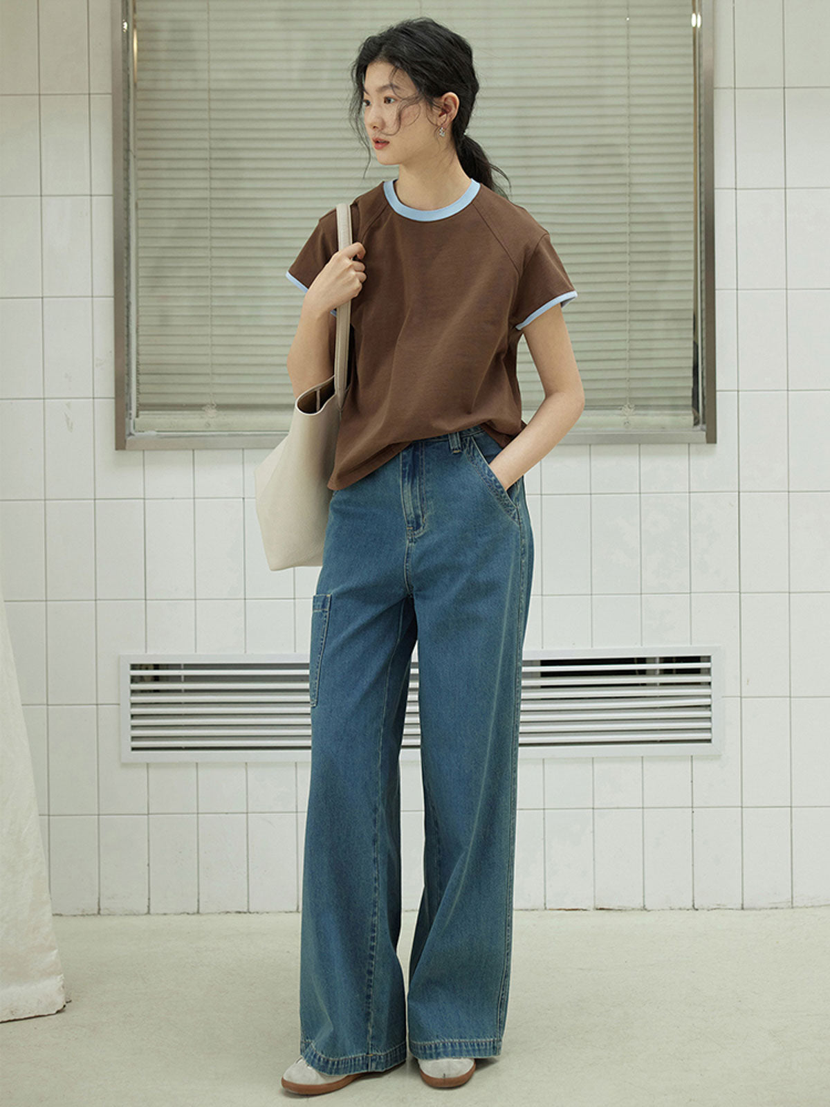 このTシャツは、99%コットンと1%エラスタンの素材を使用しており、快適で肌に優しい着心地を提供します。独特な配色のトリムデザインが特徴で、ネックラインと袖口には淡いブルーのディテールが加えられ、視覚的な楽しさを増しています。ゆったりとしたシルエットは様々な体型にフィットし、単品でもインナーとしても個性とスタイルを表現できます。ジーンズやカジュアルパンツとの相性が良く、日常のお出かけやリラックスした社交シーンにぴったりです。
