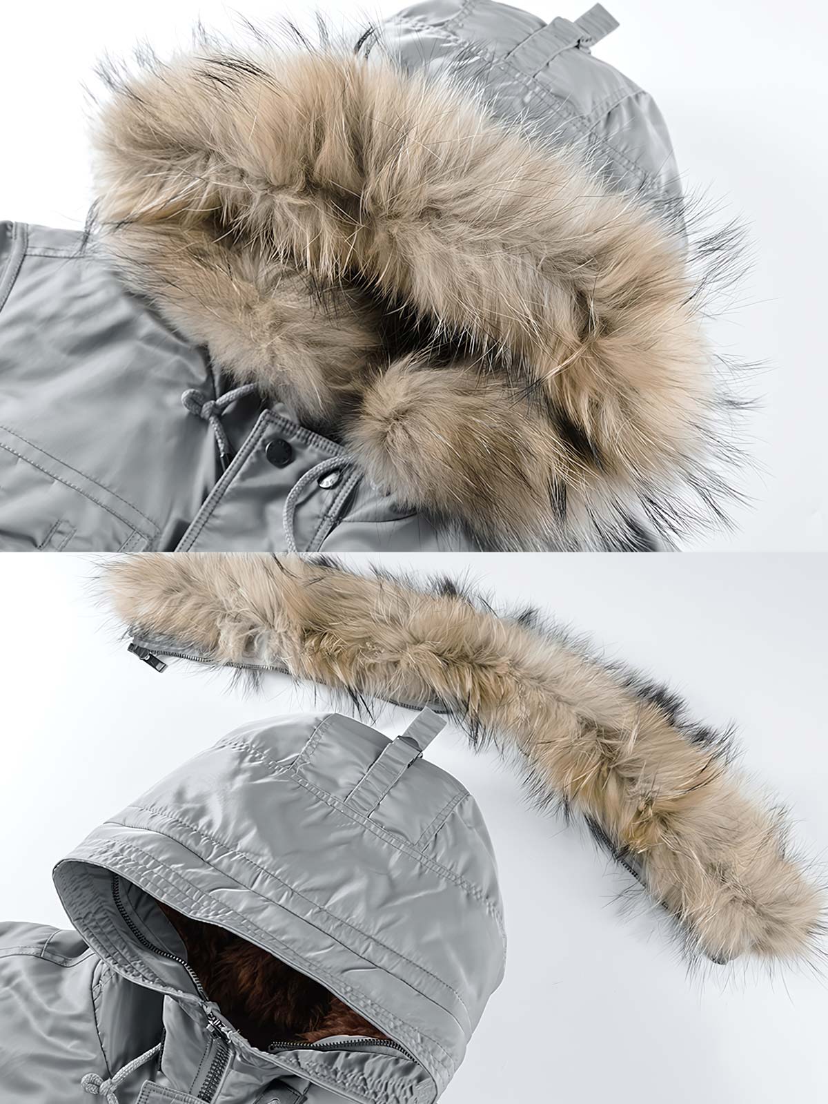 防寒を考慮したディテールが際立ち、ジップ部分には風の侵入を防ぐウインドフラップがあります。両胸に配置されたスナップポケットやフラップ仕様のハンドポケットなど、実用性に富んだディテールが充実しています。取り外し可能なファー付きフードも機能的なポイントです。