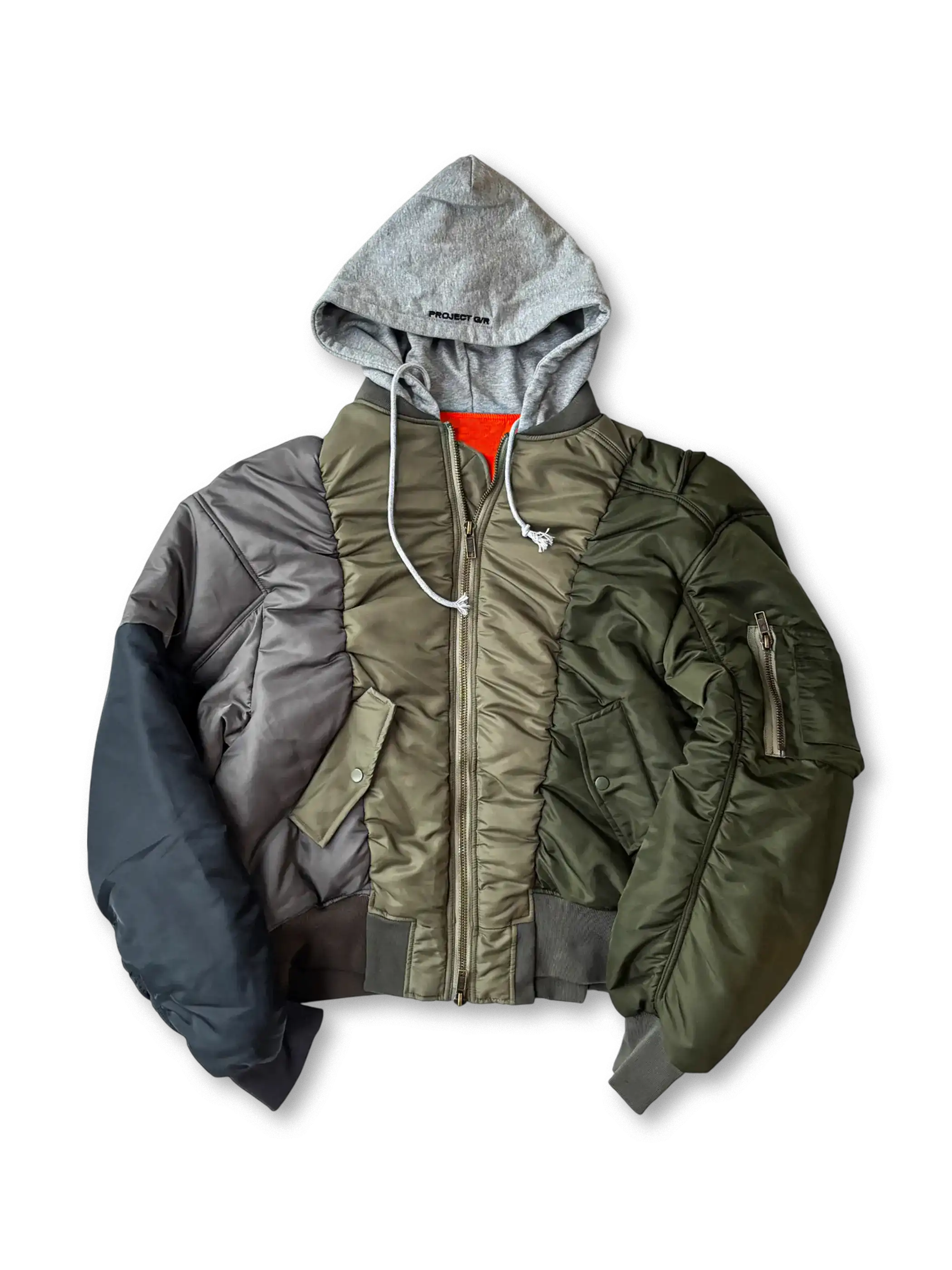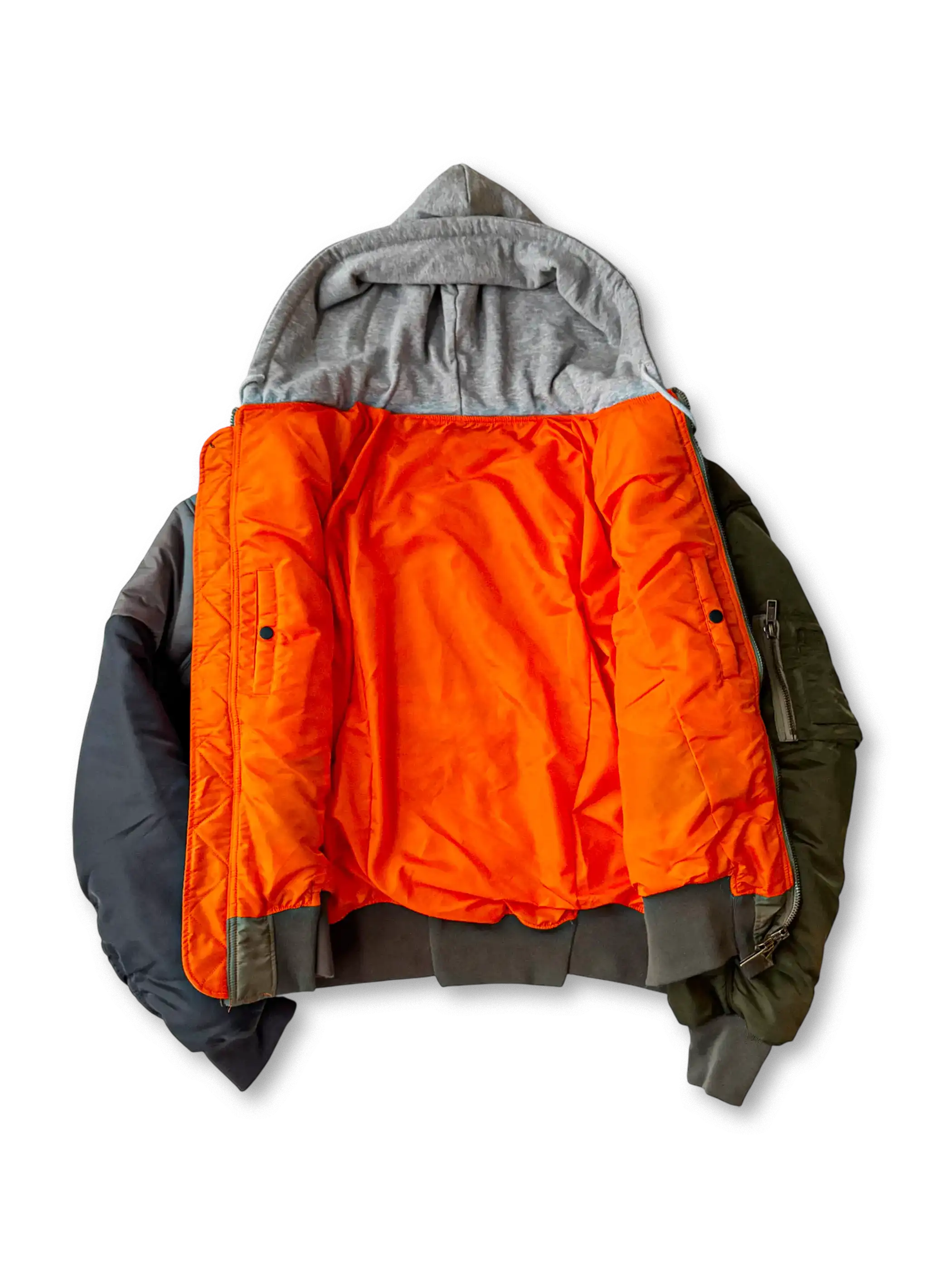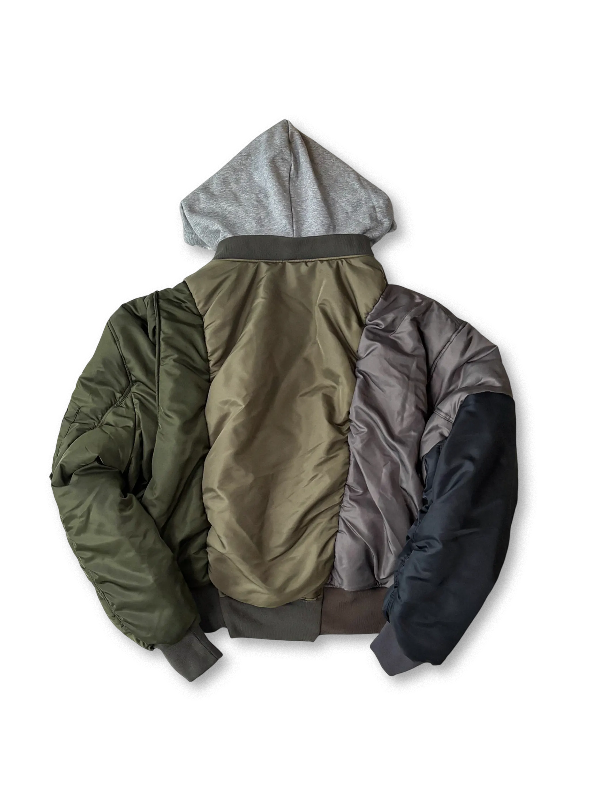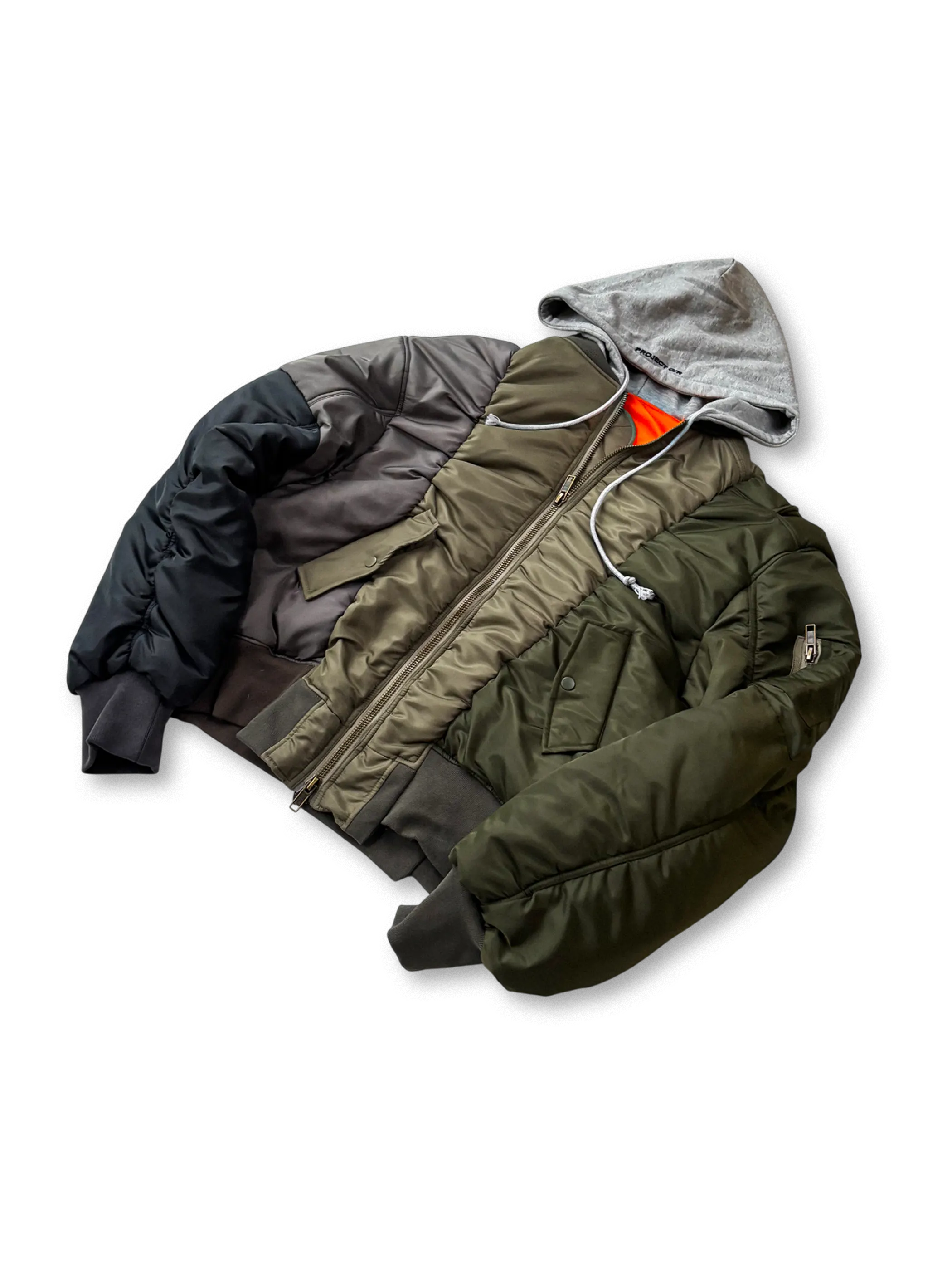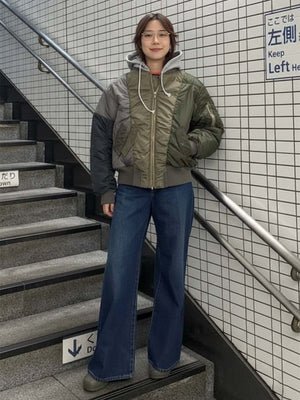 大胆なアシンメトリーパッチワークと三色バイカラー、フード付きで冬のストリートファッションに新しい風を吹き込むフライトジャケット。