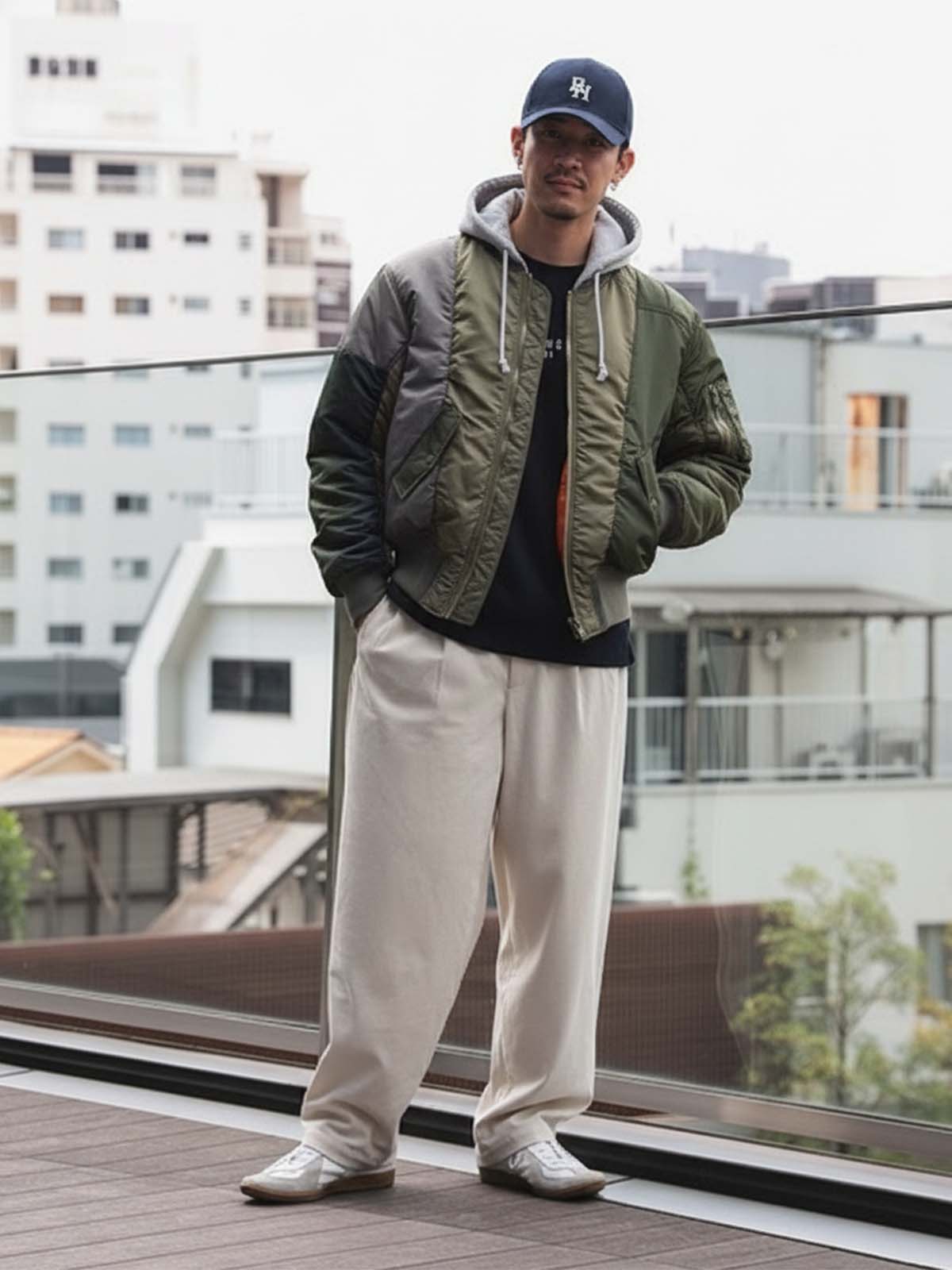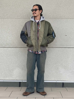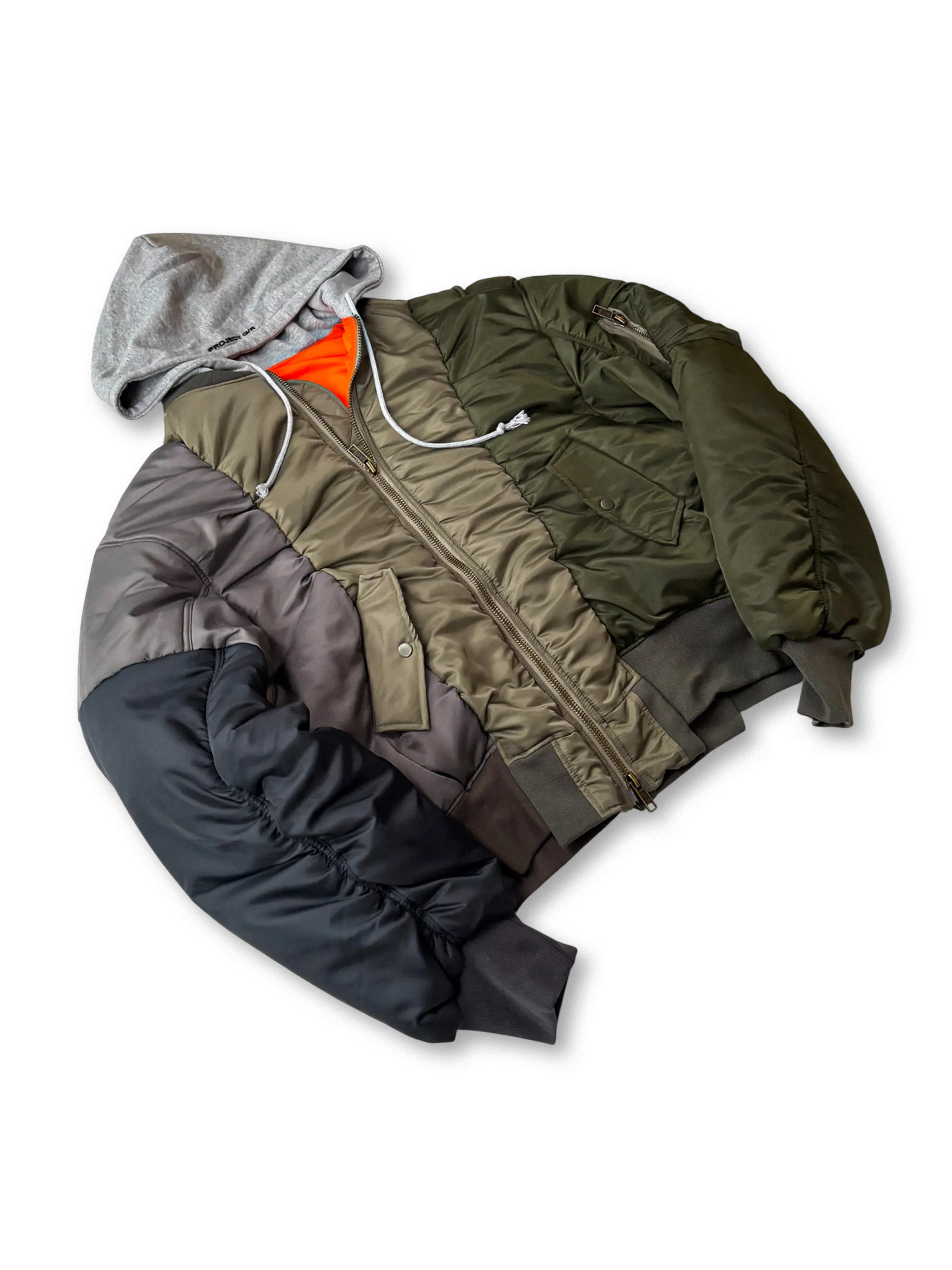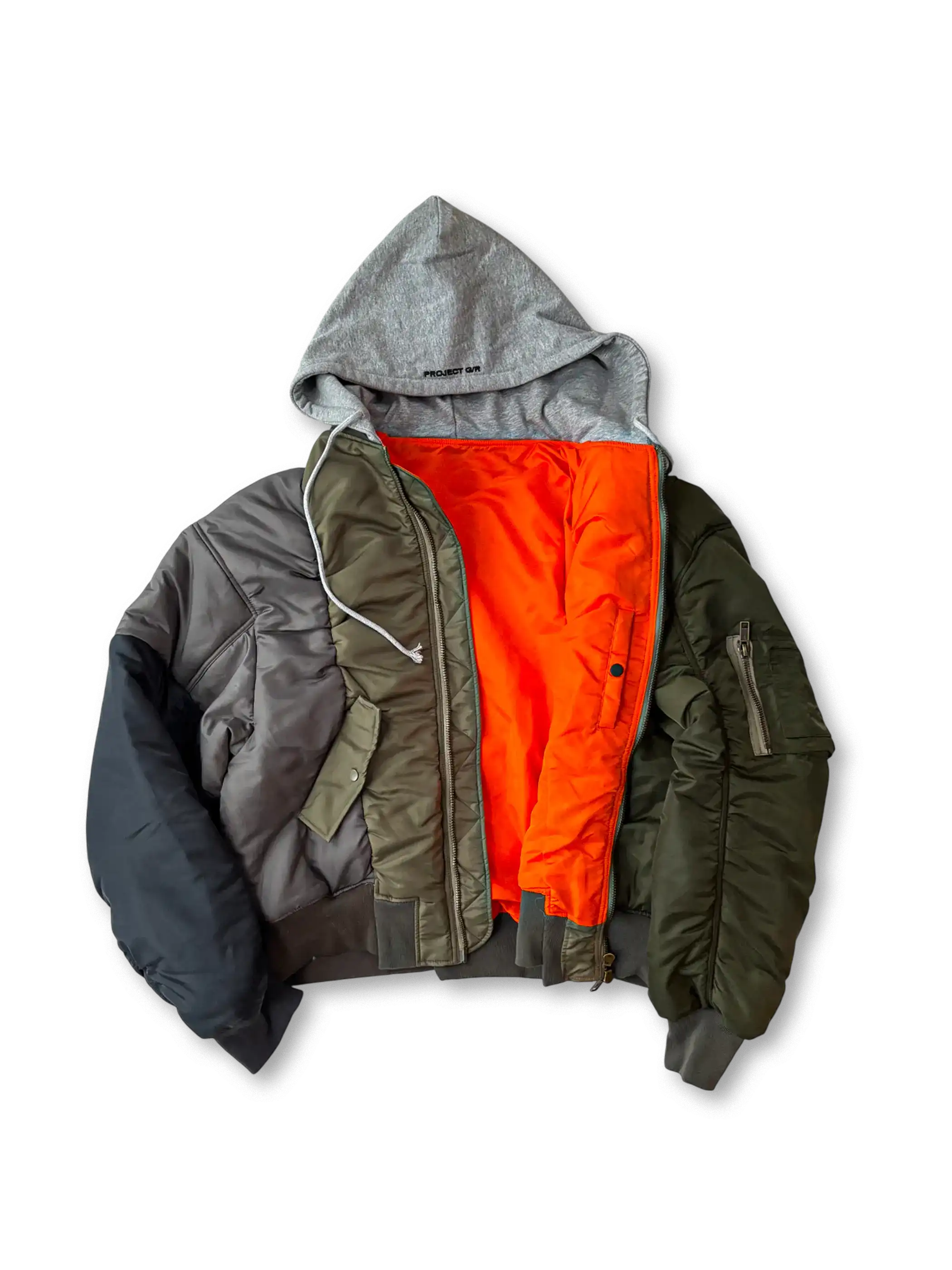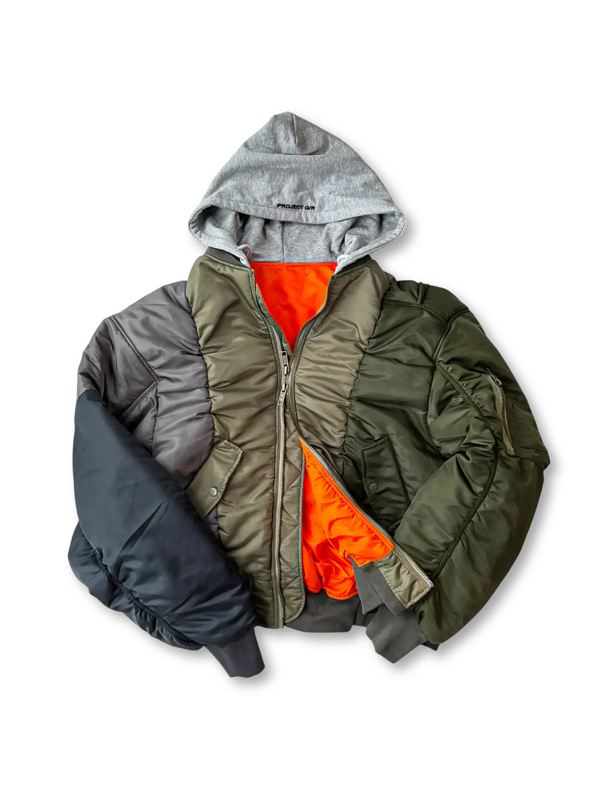 大胆なアシンメトリーパッチワークと三色バイカラー、フード付きで冬のストリートファッションに新しい風を吹き込むフライトジャケット。
