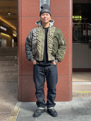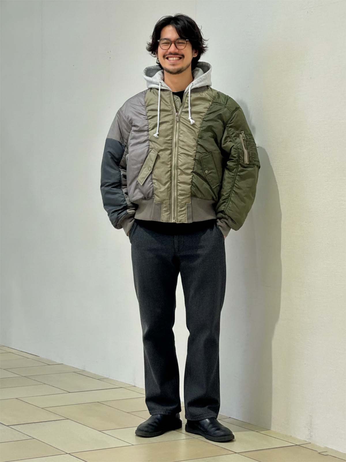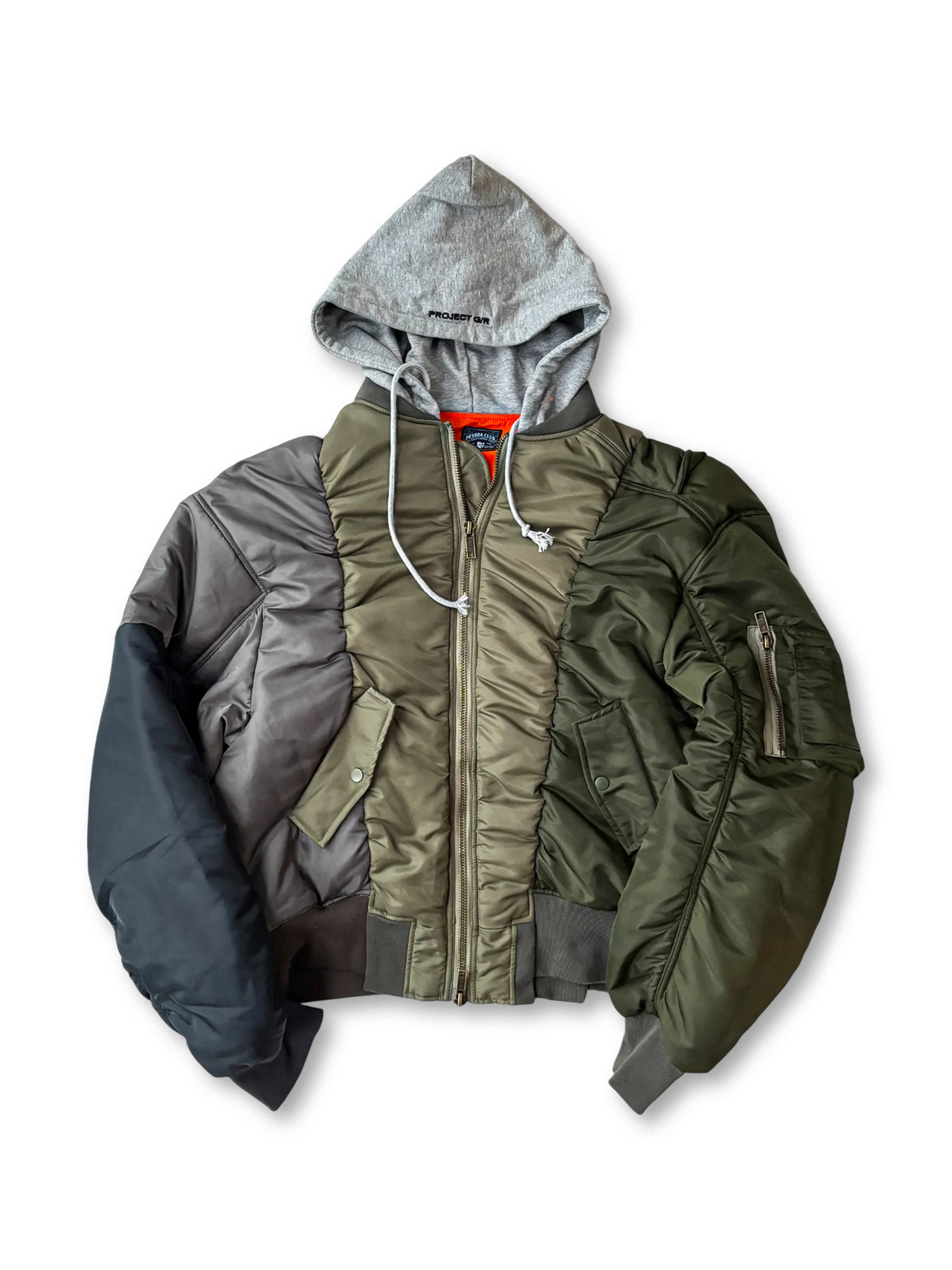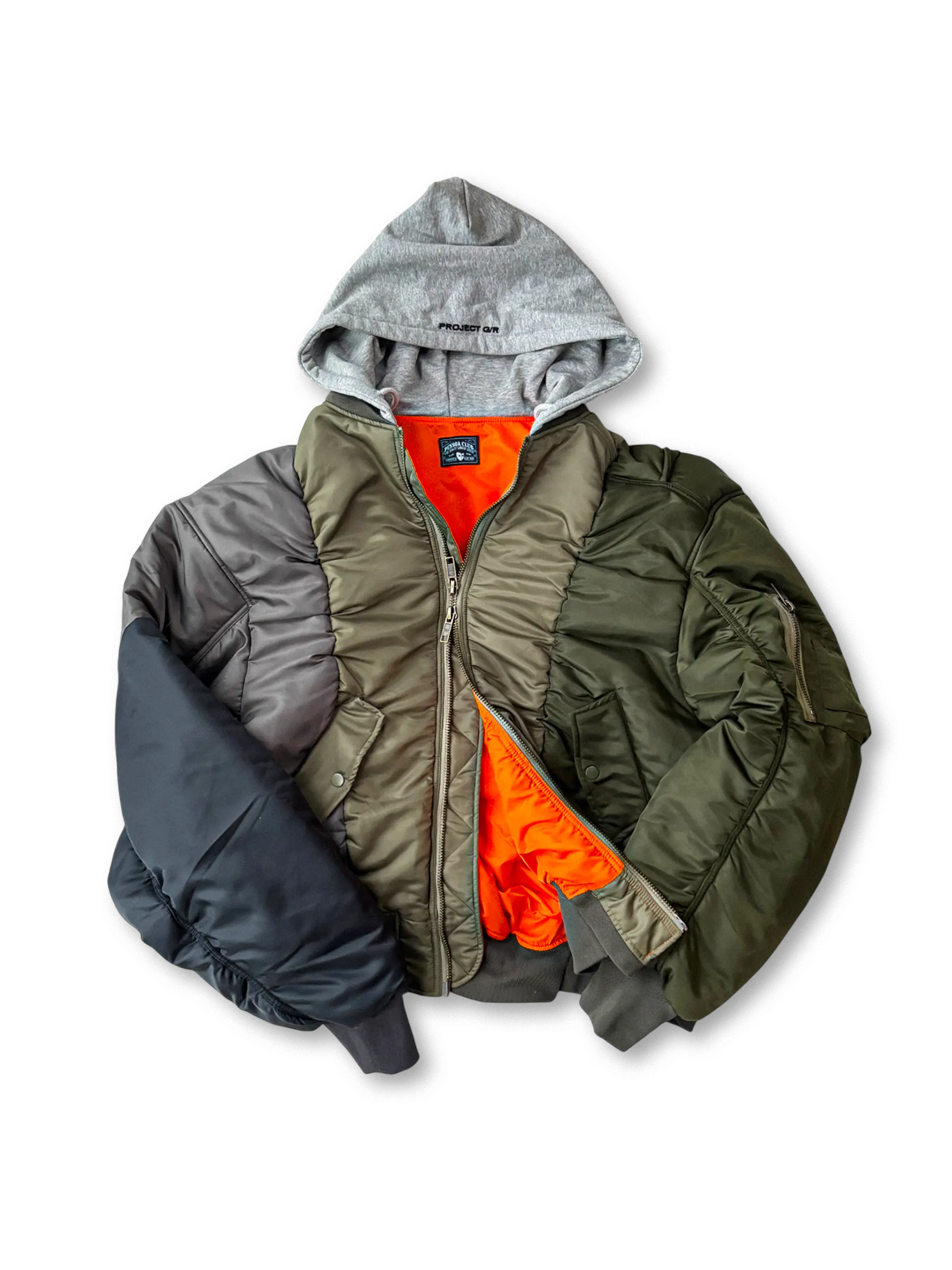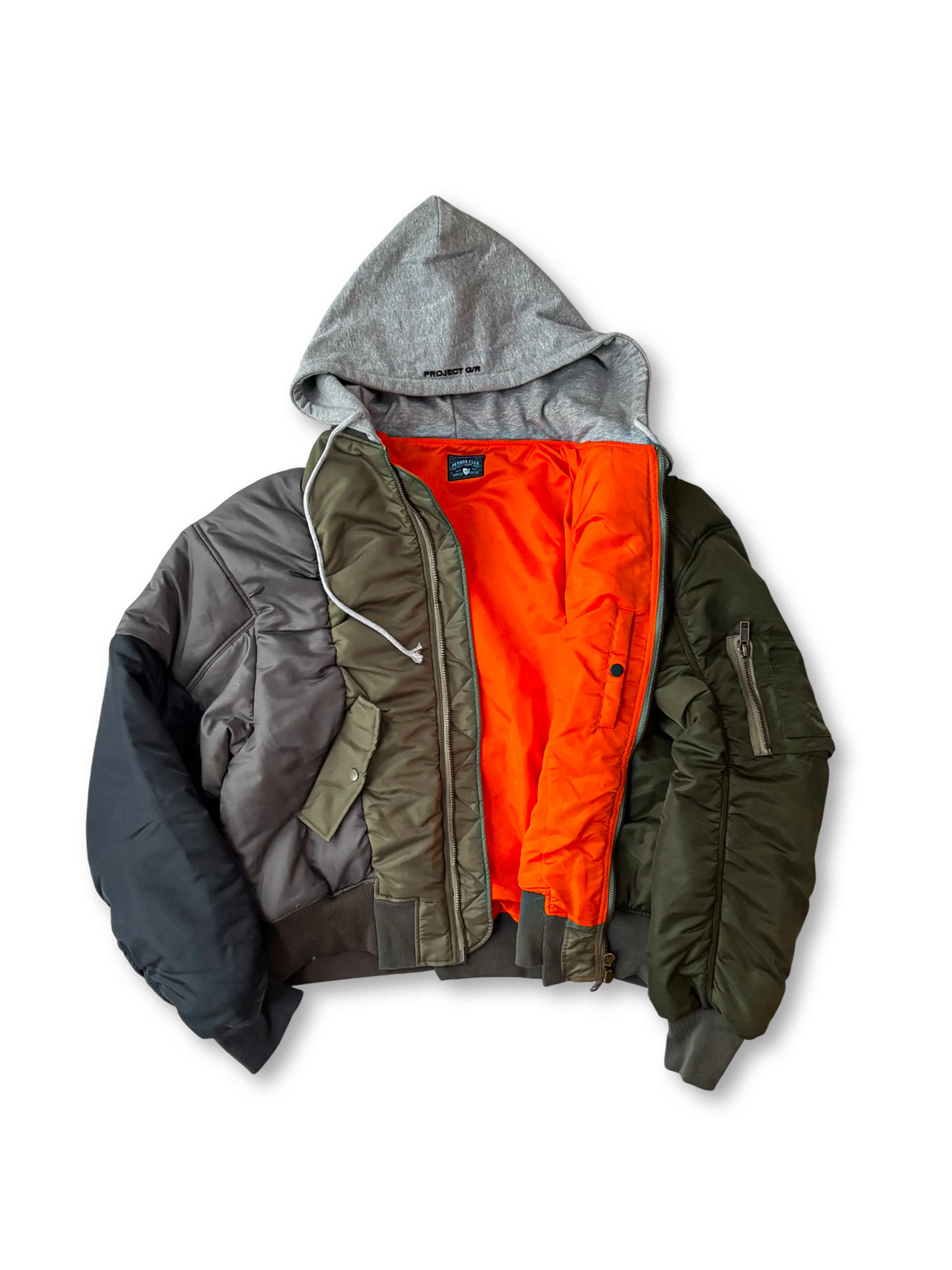 大胆なアシンメトリーパッチワークと三色バイカラー、フード付きで冬のストリートファッションに新しい風を吹き込むフライトジャケット。