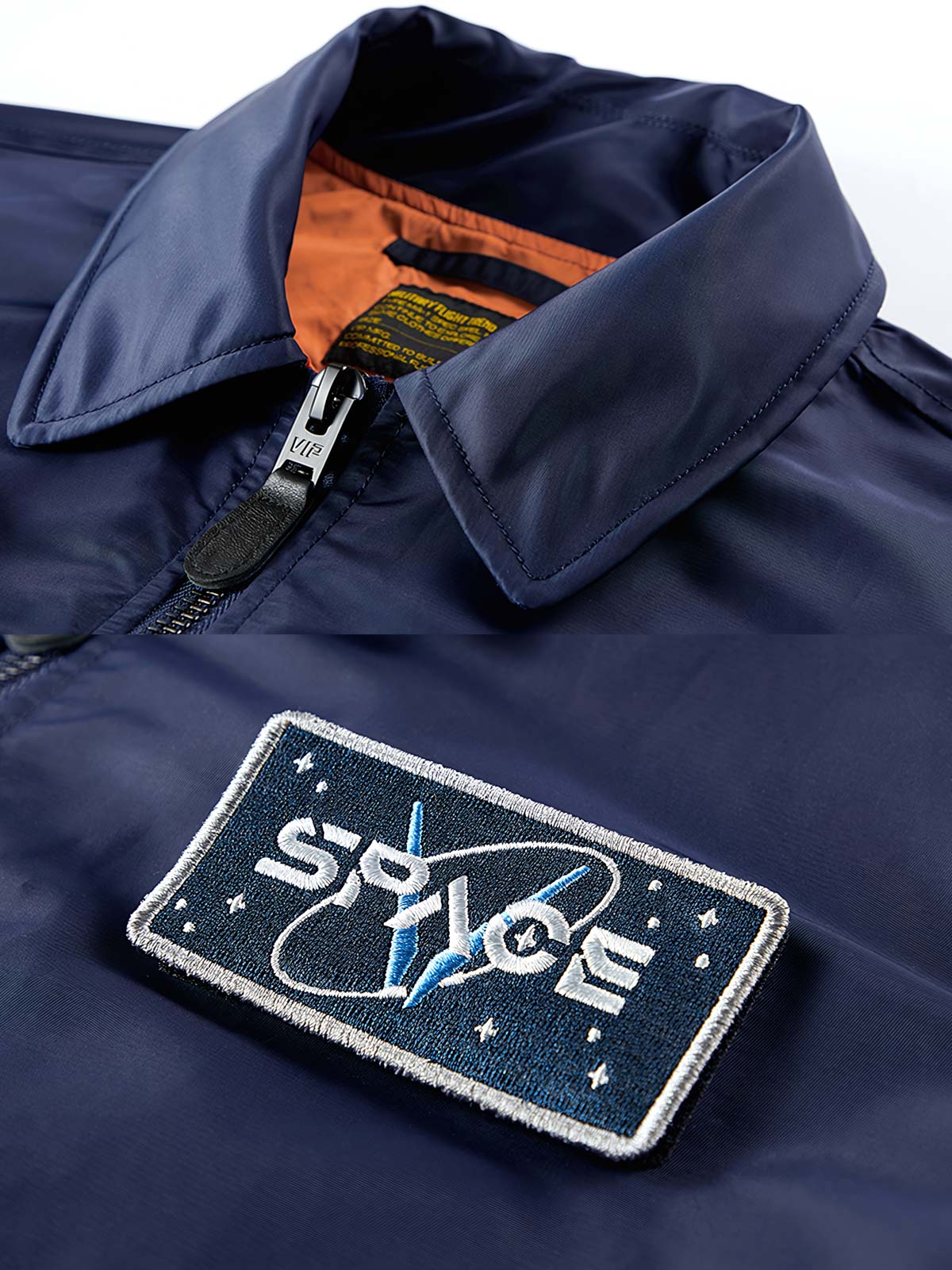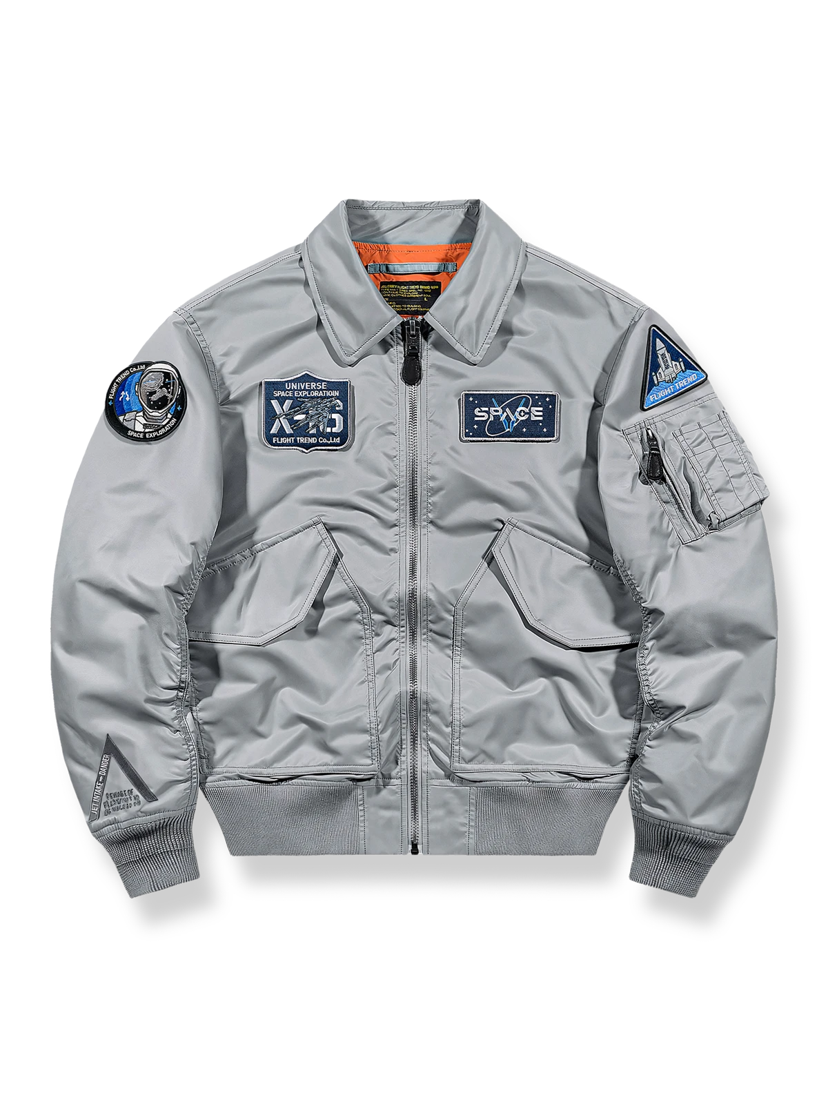 このパイロットジャケットは、スペースエクスプロレーションをテーマにしており、星間巡航や宇宙バッジの装飾が施されていて、現代の冒険精神に満ちています。20世紀初頭のパイロット装備から発展し、その実用性と耐久性からクラシックな服装となっzシルエット