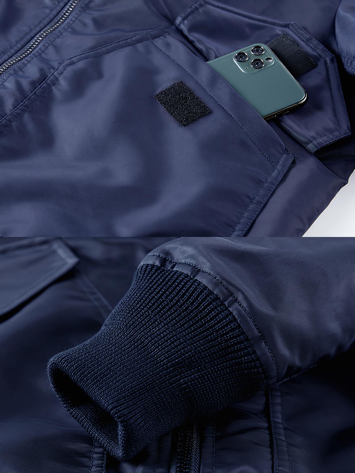 標準的なフライトジャケットのカットで、伸縮性のあるリブウエストバンドと袖口を備え、快適でフィット感のある着心地を保証します。