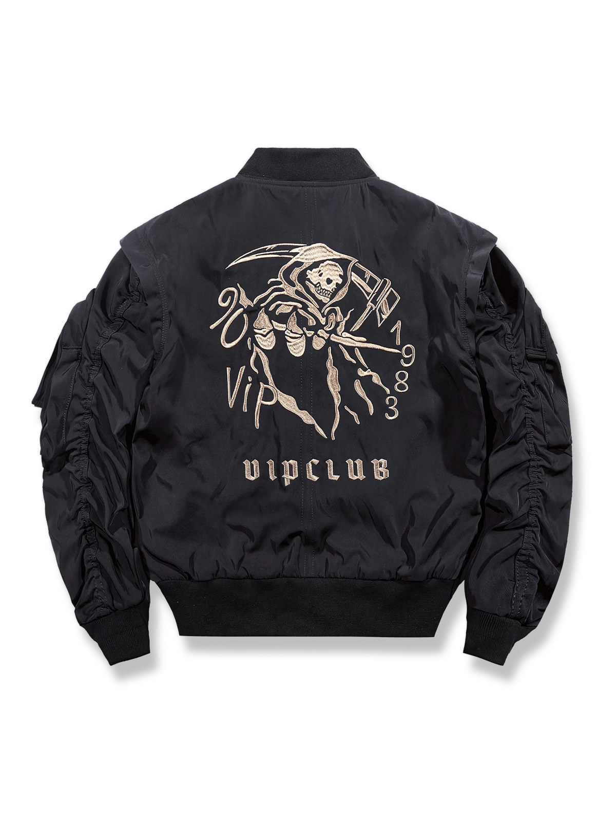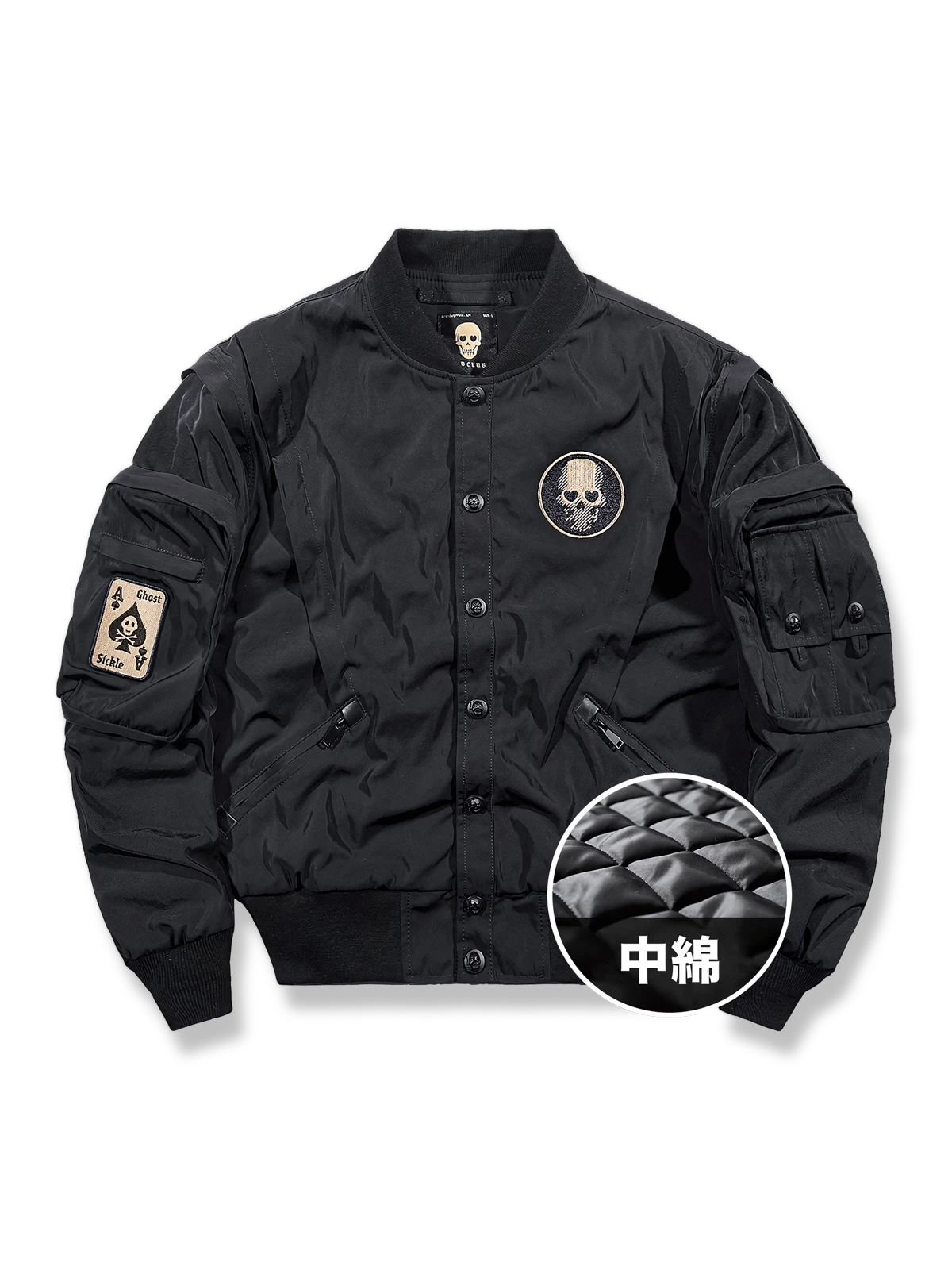 軍用およびワークスタイルにインスピレーションを得たこのジャケットは、実用性とストリートカルチャーの要素を融合しています。目立つスカルバッジなどのディテールは、現代ファッションにおける個性表現への強調を反映しています。伸縮性のある袖口と裾は、優れた保温性とフィット感を提供します。