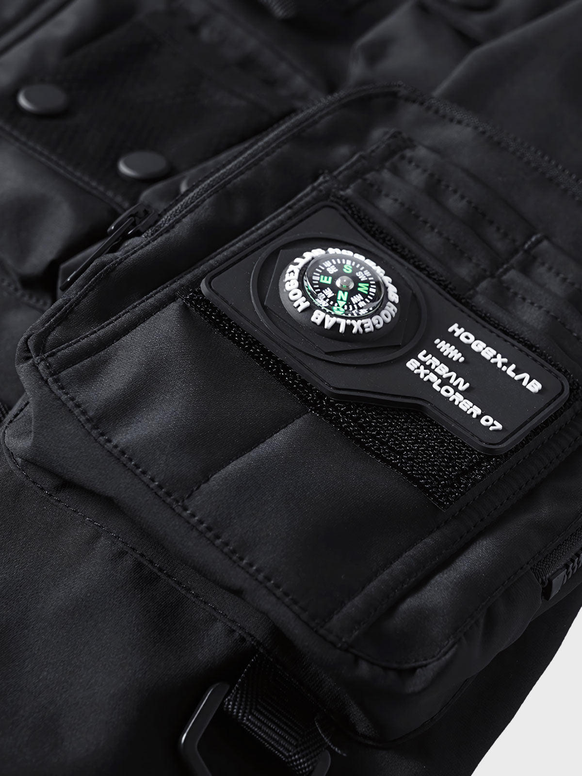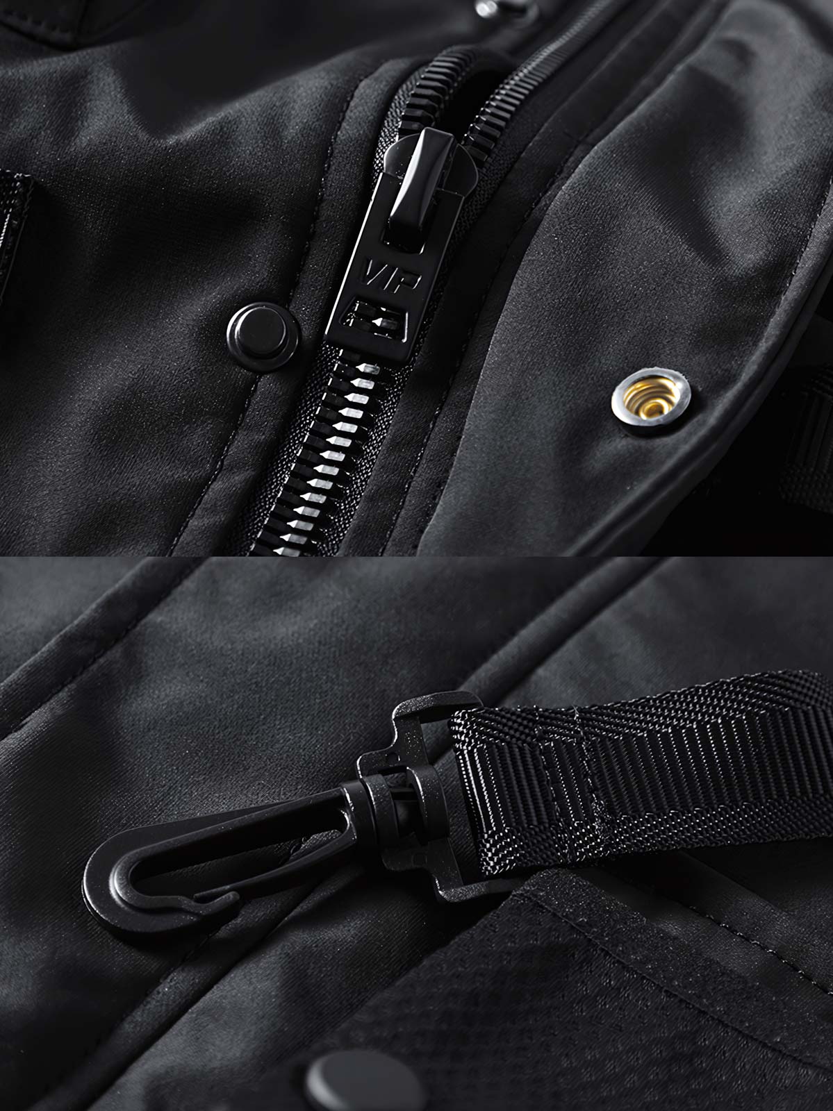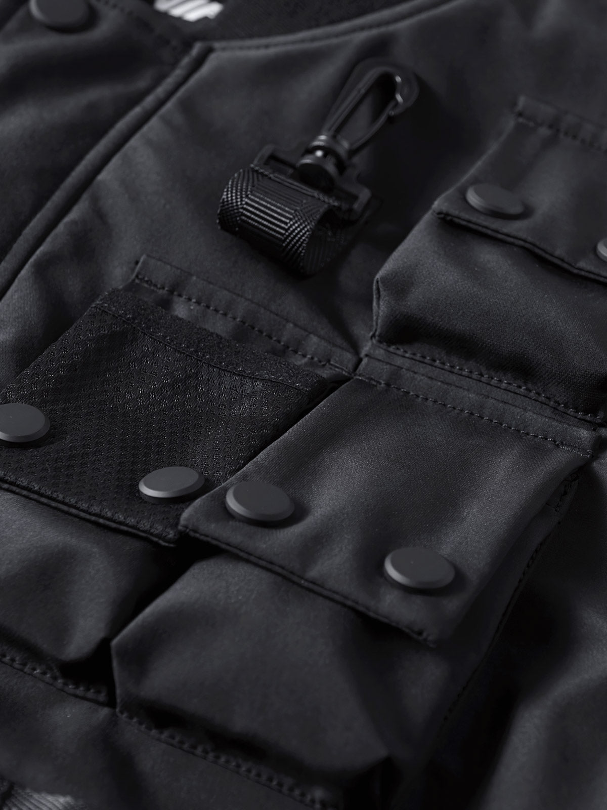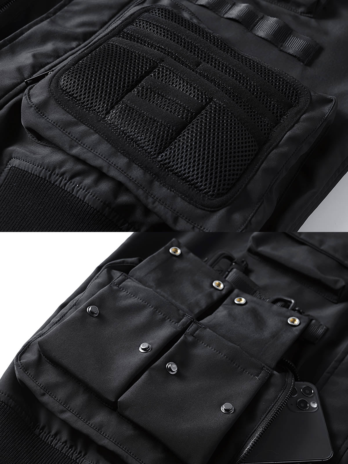 外装素材は堅牢で耐久性があり、表面処理には防水性や防風性がある可能性があります。様々なサイズや形状のポケットや、バックルやジッパーなどの調節ディテールは、ジャケットの機能性を強化し、未来的な感じを加えています。