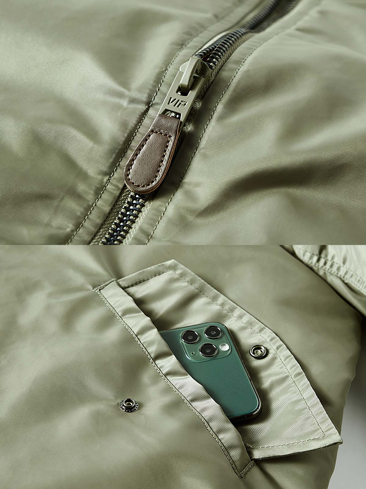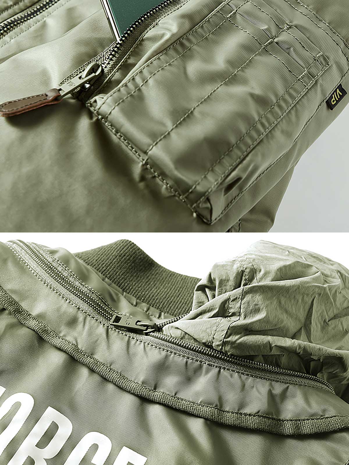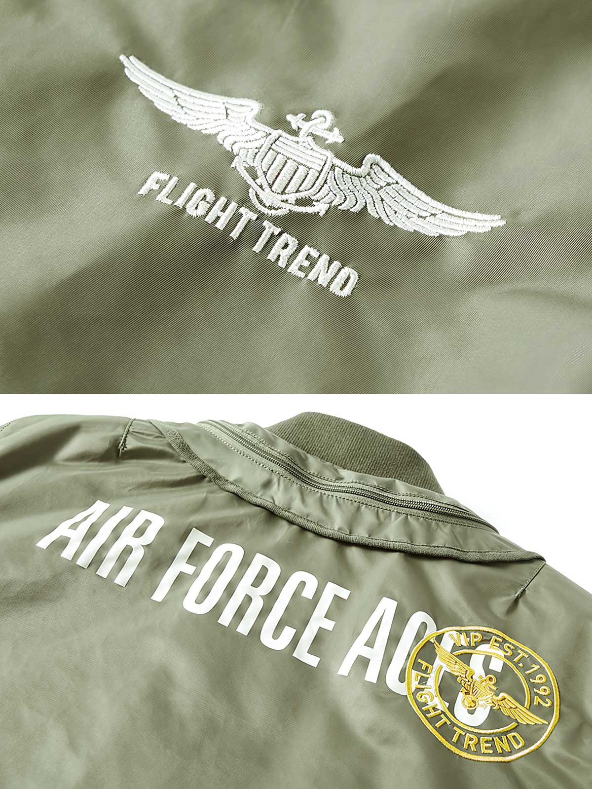 このジャケットは、クラシックなパイロットジャケットのデザイン要素と現代のファッションが融合しています。採用されているオリーブグリーンは、軍事装備の伝統的な色彩に由来し、実用性とスタイルの多機能性を象徴しています。ジャケットの前面にある刺繍されたバッジや背面の空軍プリントは、飛行服の豊かな歴史と文化的な意味合いを表現しております。内側には鮮やかなオレンジ色を採用し、視認性を高めるとともに、着用者に予想外の色彩の衝撃を与えます。