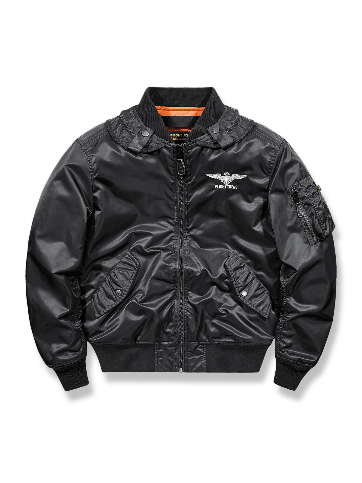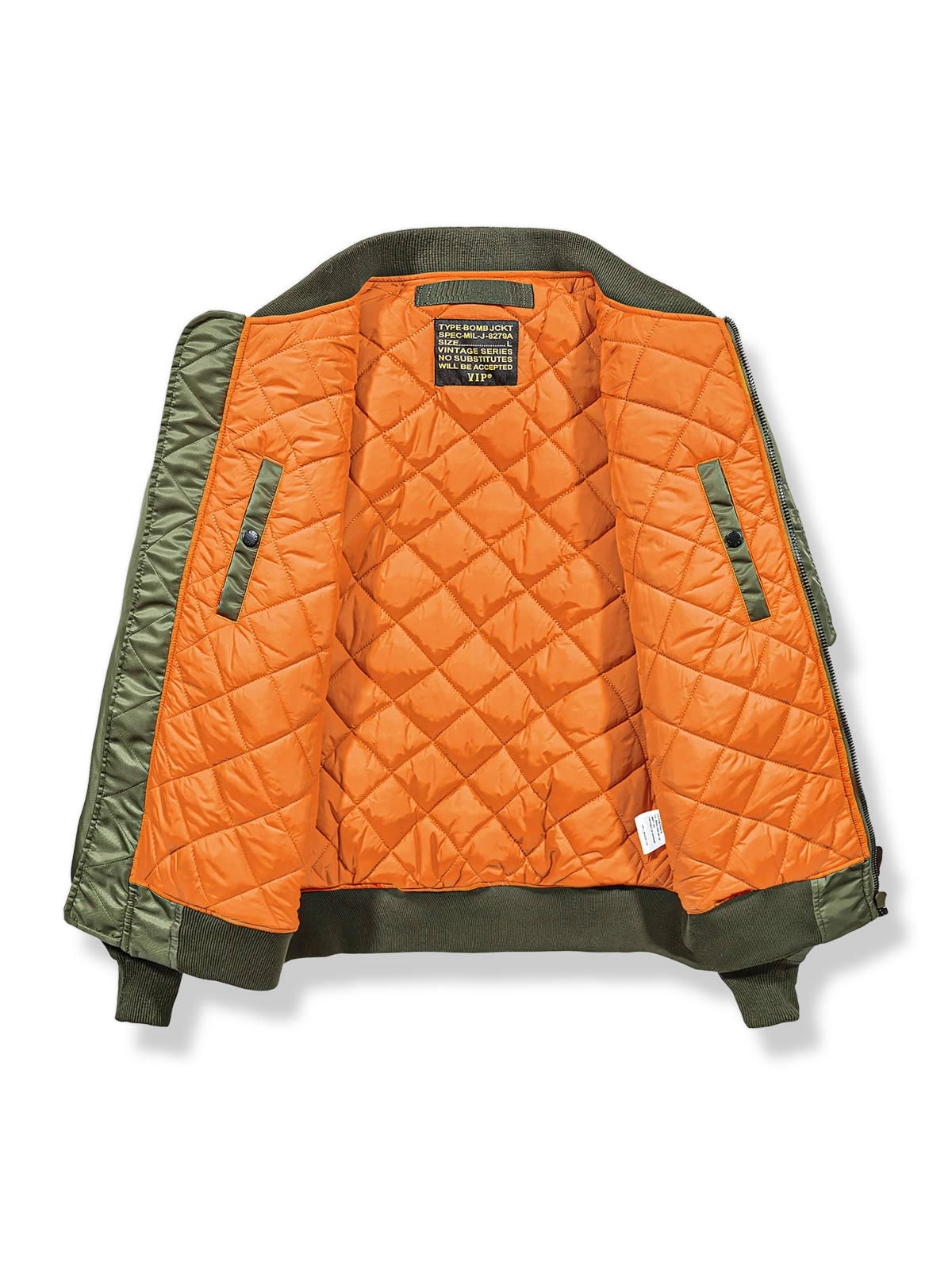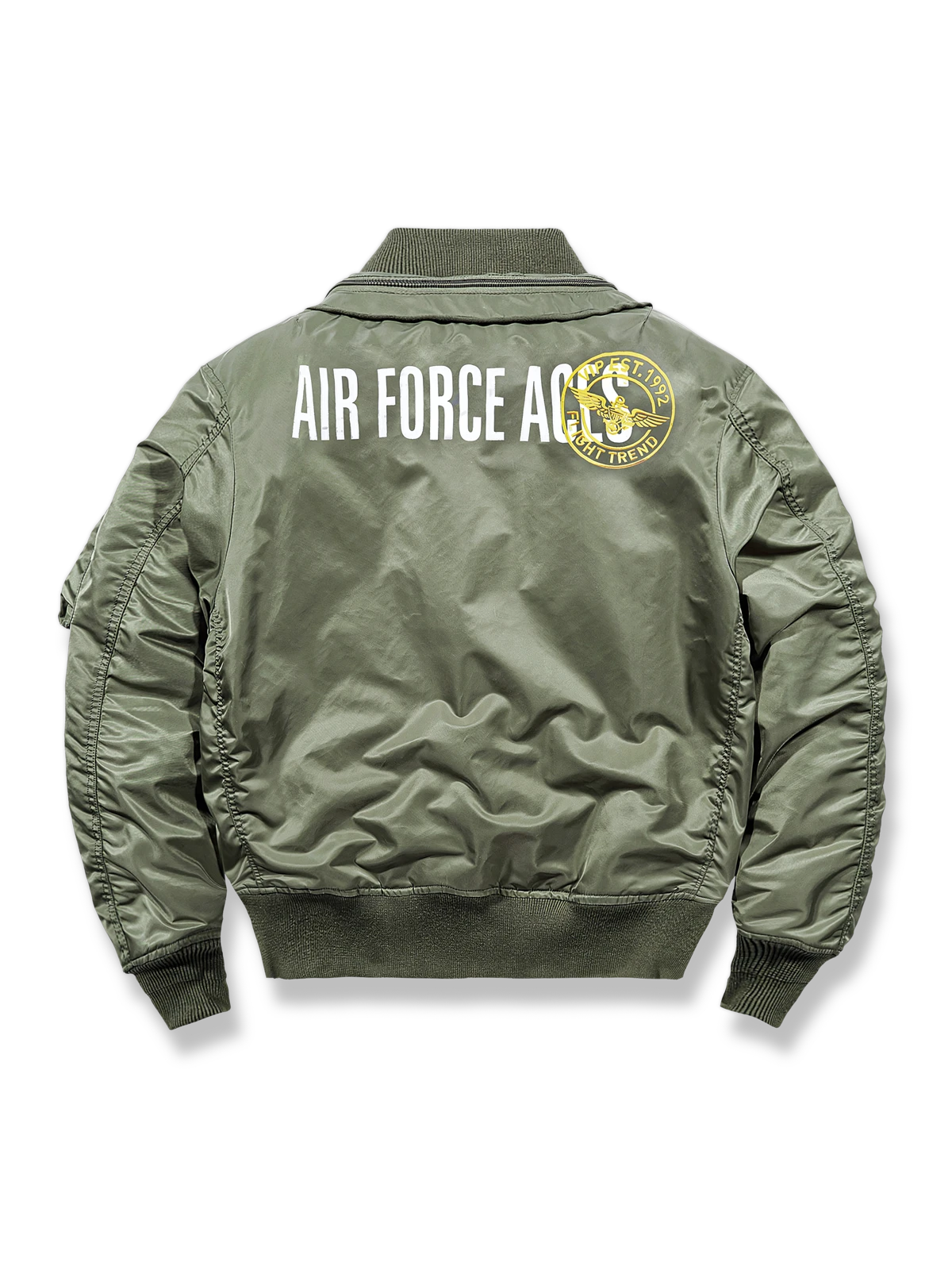 このジャケットは、クラシックなパイロットジャケットのデザイン要素と現代のファッションが融合しています。採用されているオリーブグリーンは、軍事装備の伝統的な色彩に由来し、実用性とスタイルの多機能性を象徴しています。ジャケットの前面にある刺繍されたバッジや背面の空軍プリントは、飛行服の豊かな歴史と文化的な意味合いを表現しております。内側には鮮やかなオレンジ色を採用し、視認性を高めるとともに、着用者に予想外の色彩の衝撃を与えます。