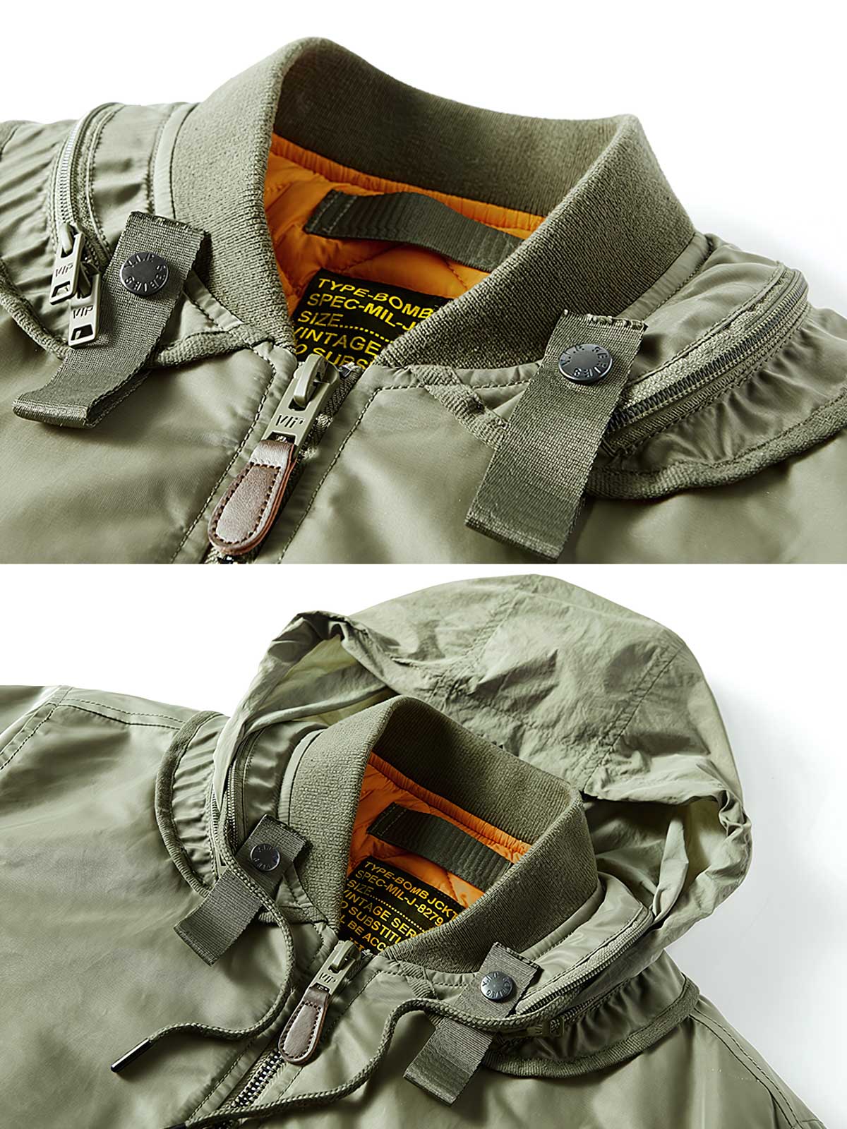 ジャケットは厚手のデザインで、秋冬の季節に適しています。クラシックなパイロットジャケットのシルエットを呈し、十分な動きやすさと整然としたラインを保持しています。フード付きのデザインで、追加の保護機能を提供すると同時に、個人の好みに応じて調整可能で、様々な着用ニーズに対応します。