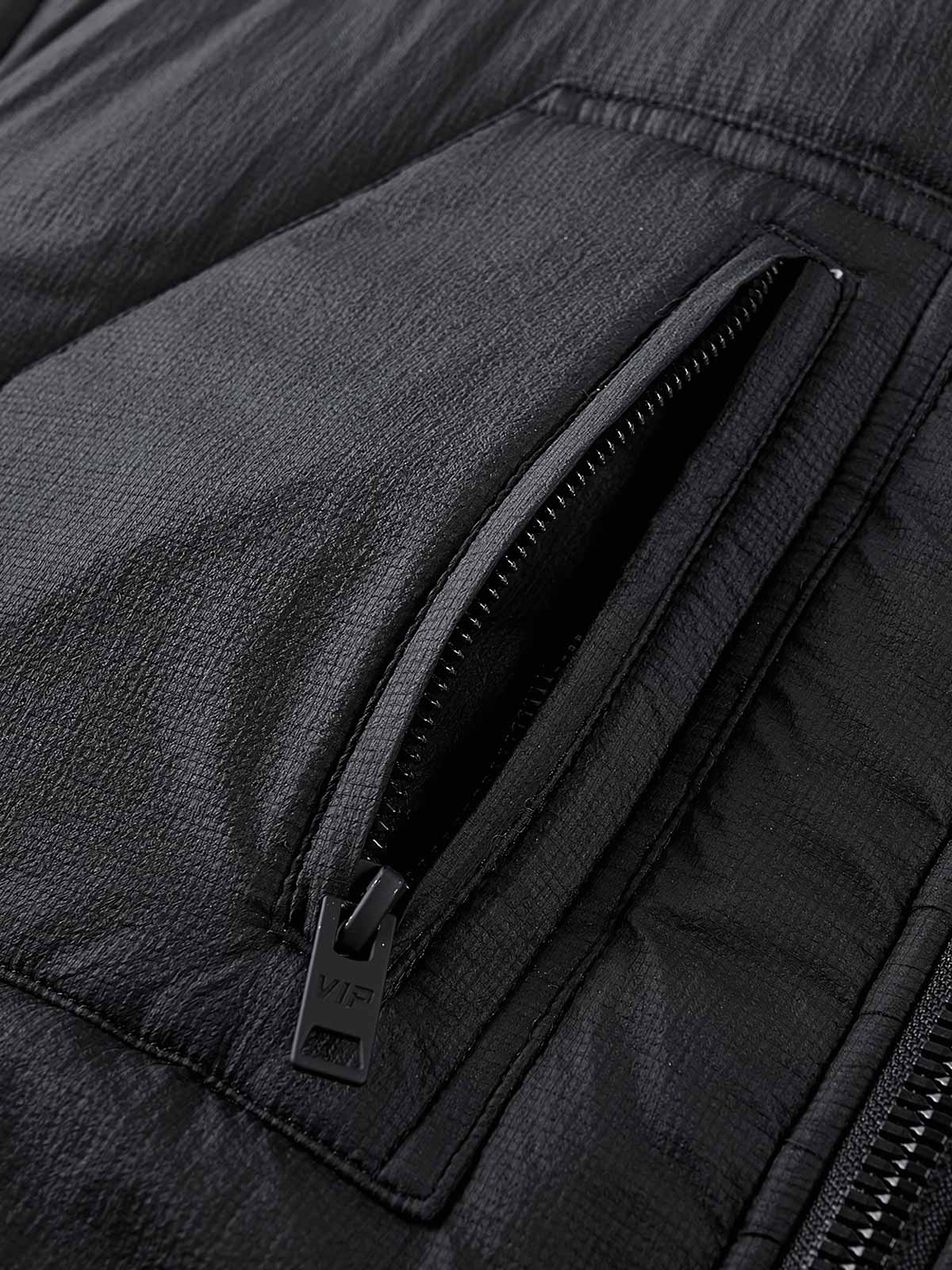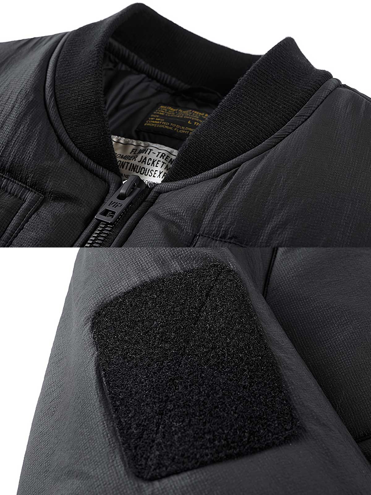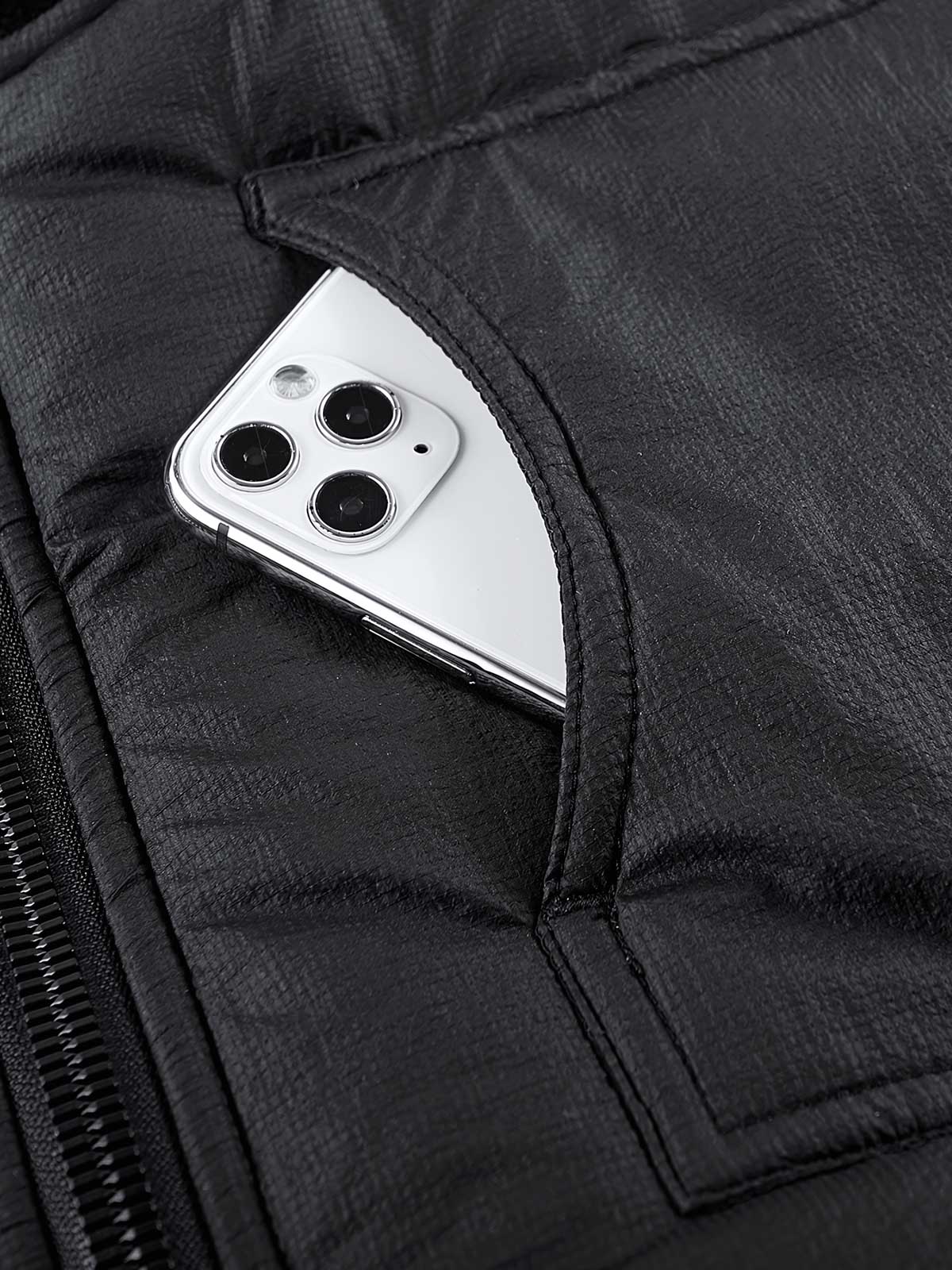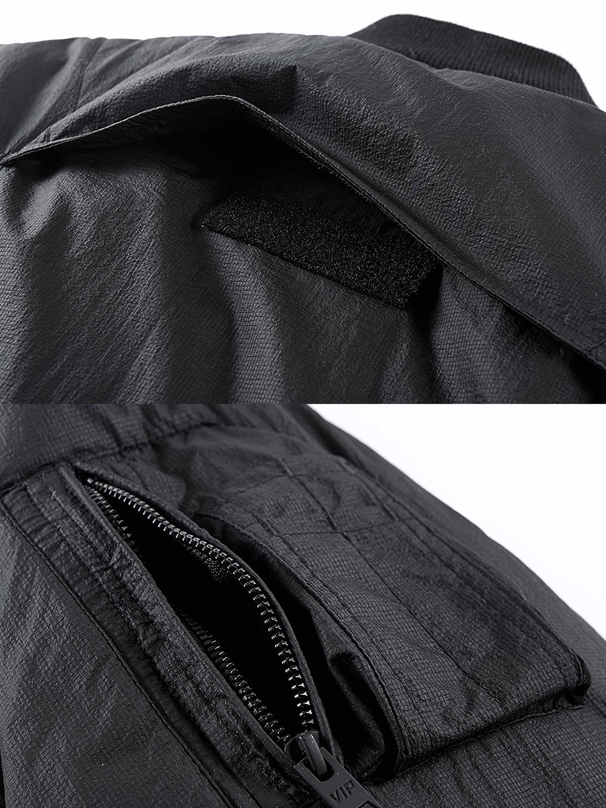 防水加工ナイロン生地は摩耗に強く風を防ぐ性能を持っており、優れた保温性を提供します。この生地はジャケットの快適さと耐久性を確保し、さまざまな場面で着用するのに適しています。
