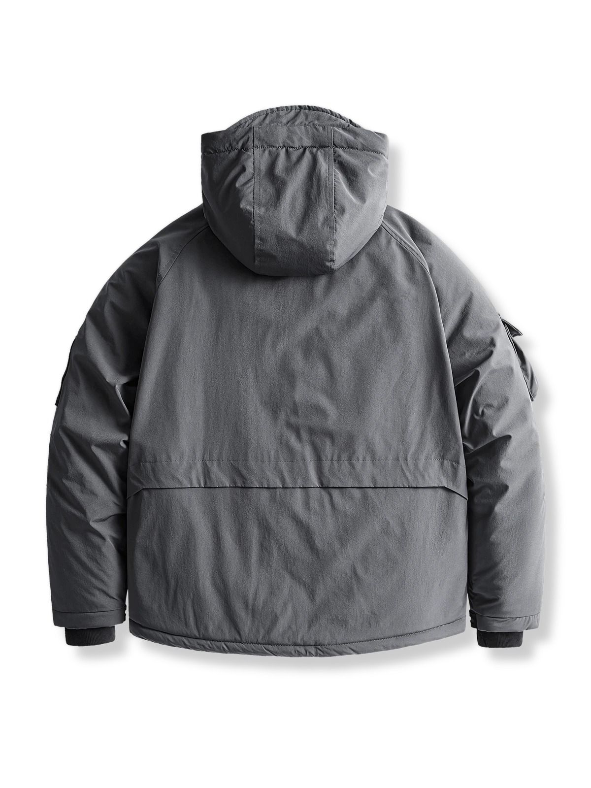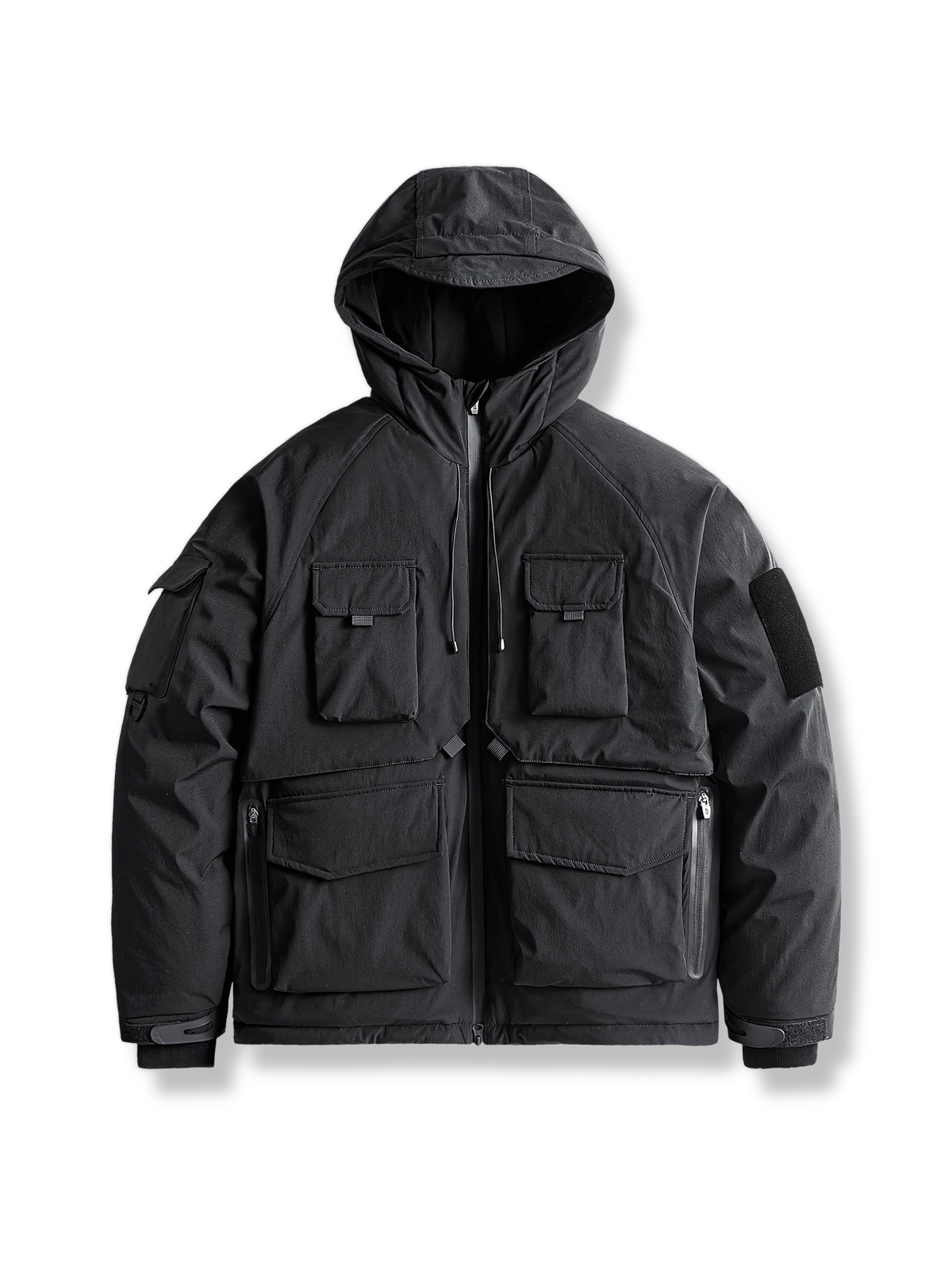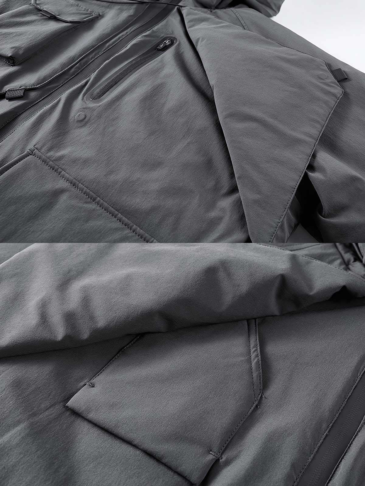 この中綿ジャケットは、現代のアウトドアウェアの実用的な機能とワークウェアスタイルのデザイン要素を組み合わせています。マルチポケットデザインは、軍事装備やワークウェアから派生し、効率的なアイテム収納能力を提供することを目的としています。フードのデザインは、保温性と多様な天候に対応する柔軟性を追加しています。