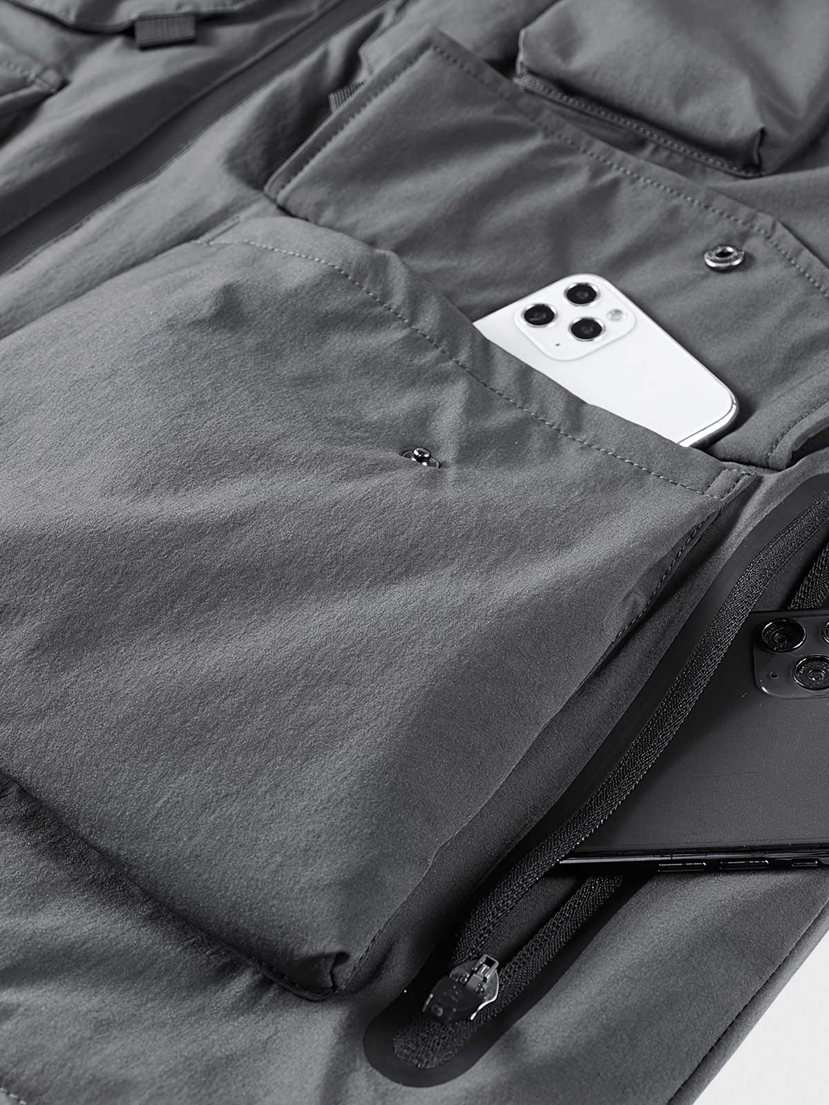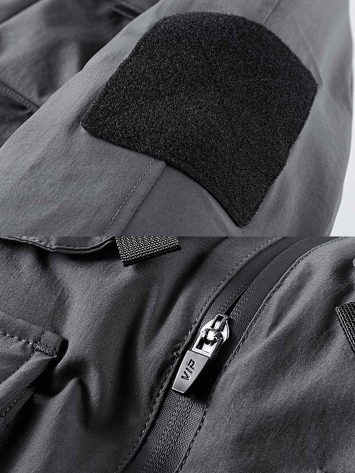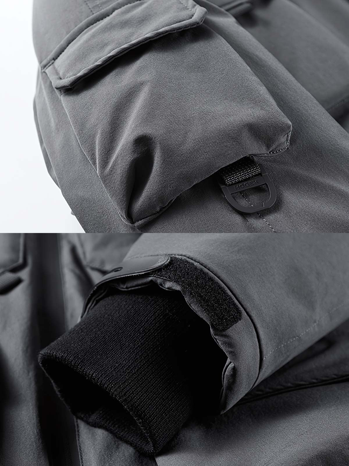 耐久性のある生地で作られたこのジャケットは、厳しい天候に耐えつつ、着用者の快適さを維持します。様々なポケットは便利で実用的であり、この服のデザインのハイライトでもあります。袖部分の補強素材と調節可能な袖口は耐久性を高めています。