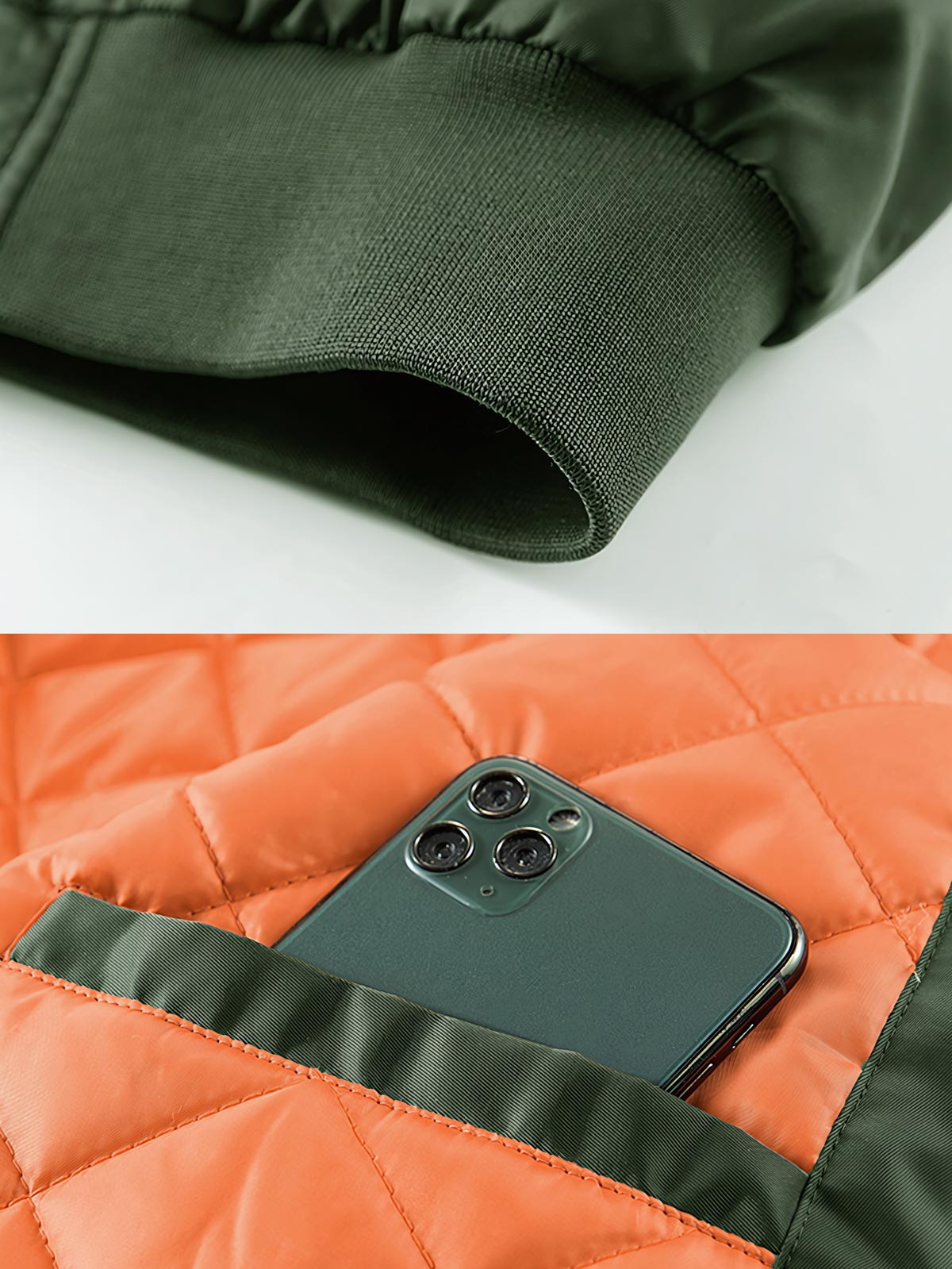 外側には耐摩耗性素材を使用し、厳しい天候に耐えつつ軽量さを保持しています。内部のオレンジ色の裏地はキルティングデザインを採用し、保温効果を高めるとともに、全体的な外観に視覚的な層を加えています。多ポケットデザインは実用性を強調し、十分な収納スペースを提供します。