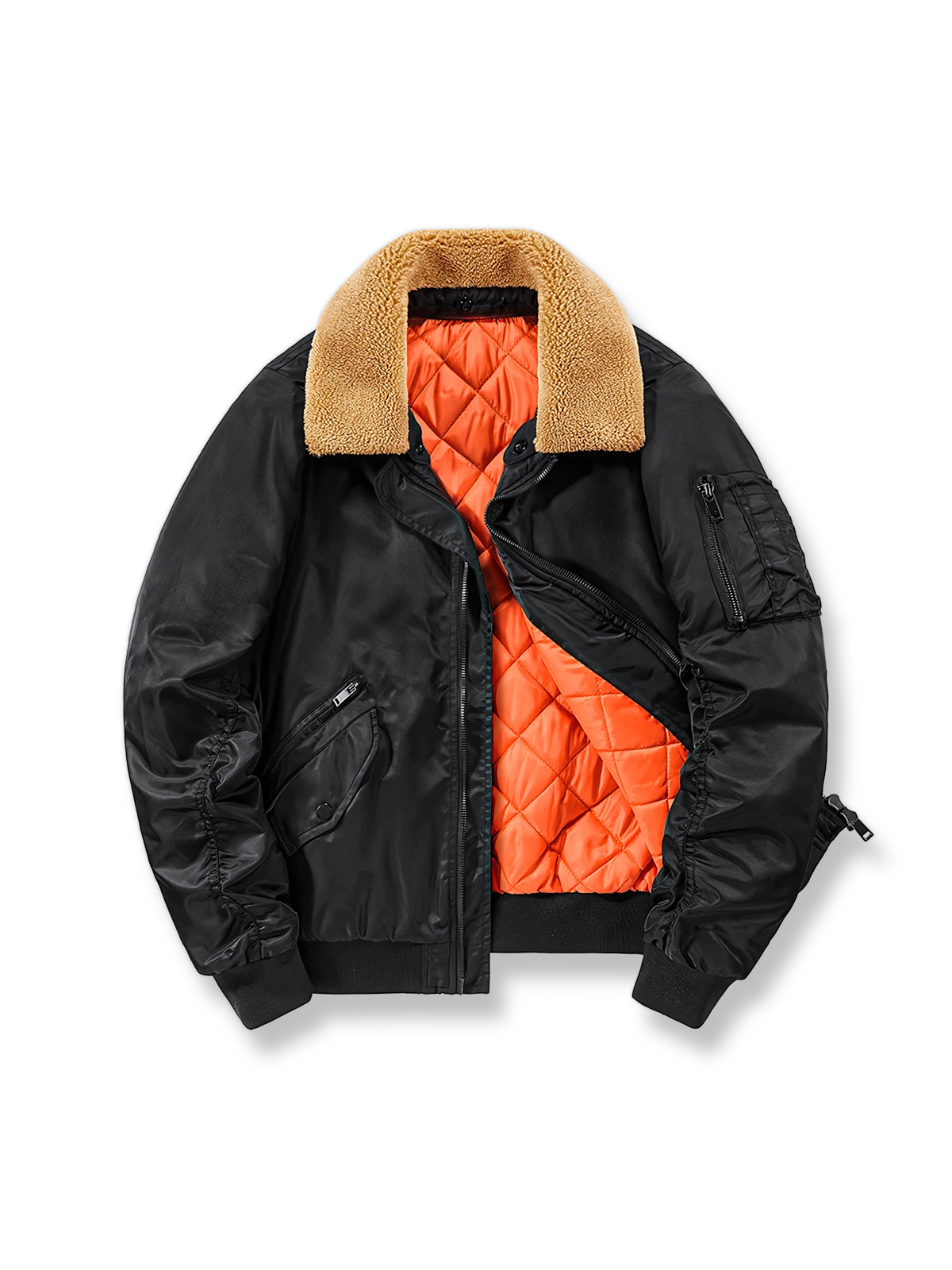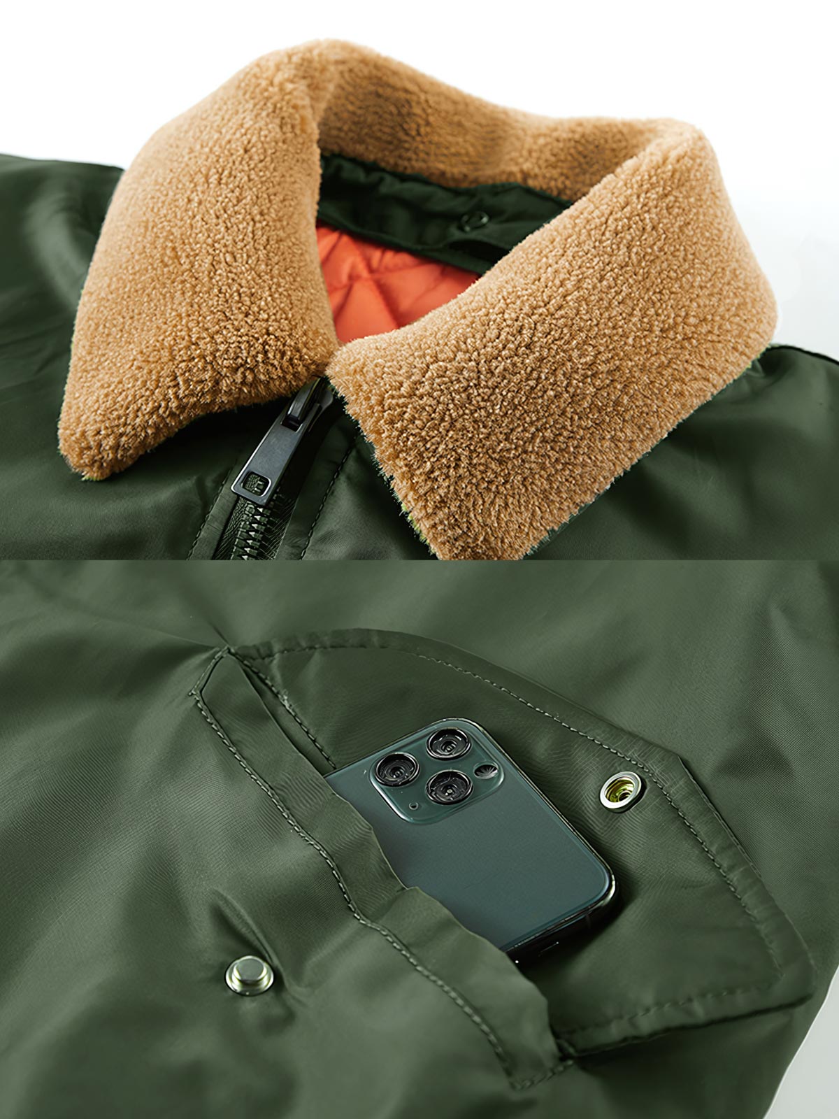 このフライトジャケットは、クラシックなバイカーウェアの要素を取り入れ、鮮やかなオレンジの裏地を組み合わせて、レトロでありながら現代的な感覚を与えています。