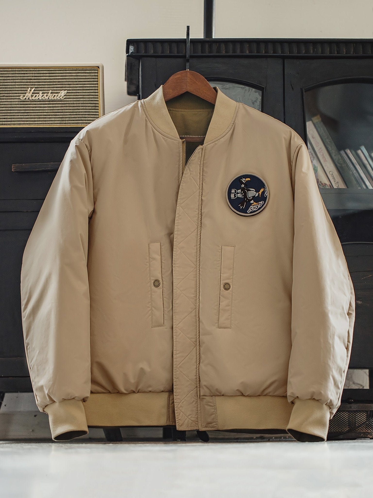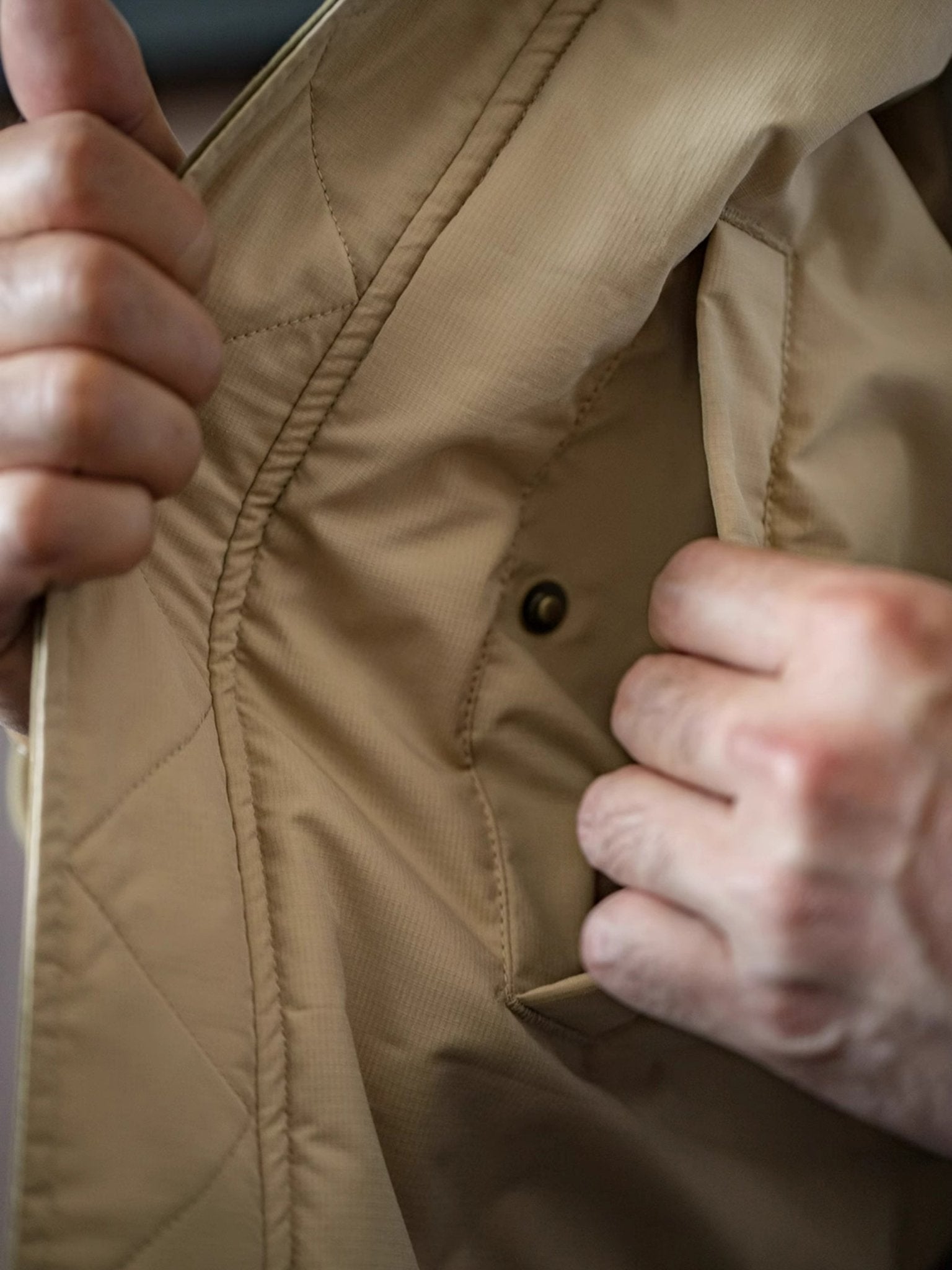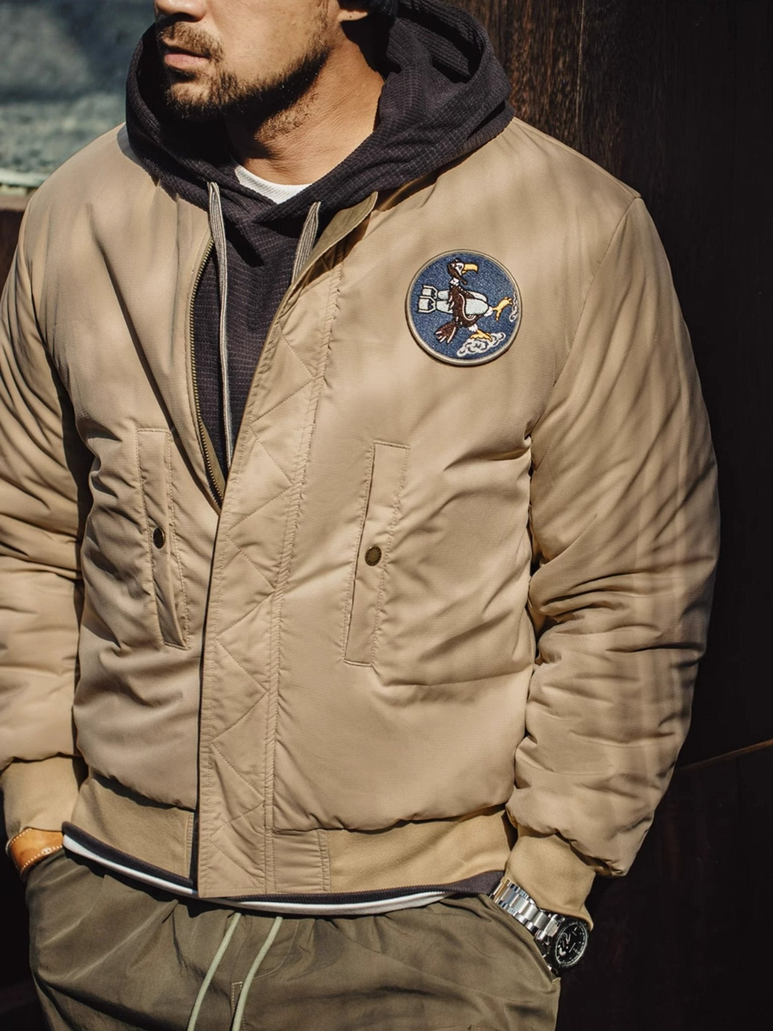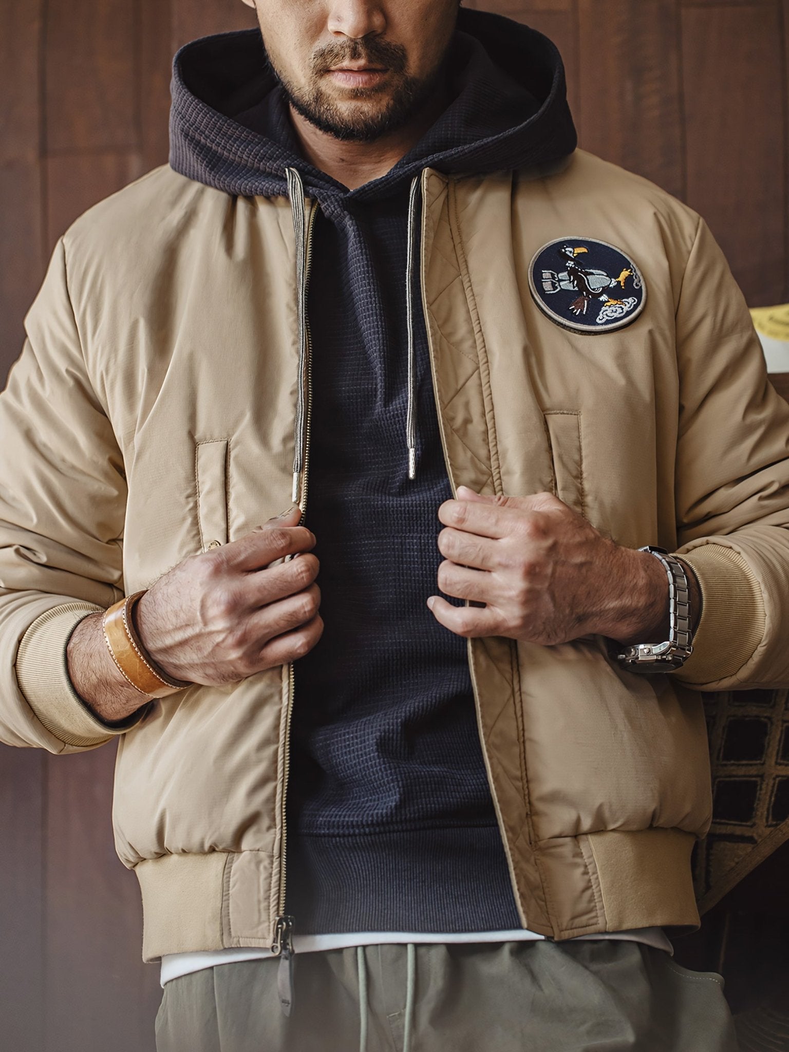 ポリエステル生地は程よい光沢感と高級感があり、武骨で耐久性があり、実用的な機能美が際立っています。中綿入りなので、ふんわりとした質感で保温性が優れ、冬のアクセントとして最適です。