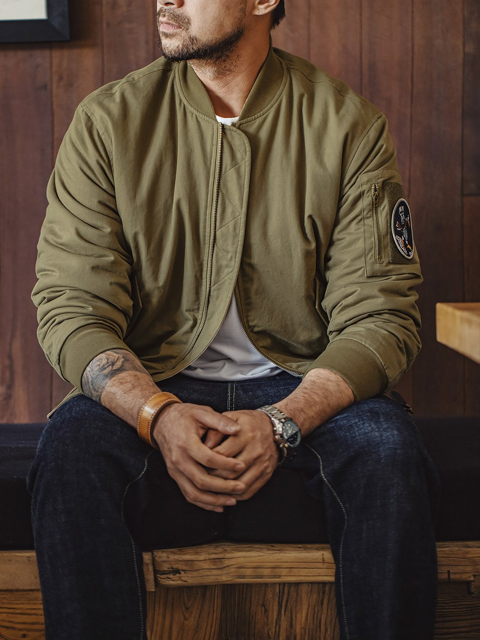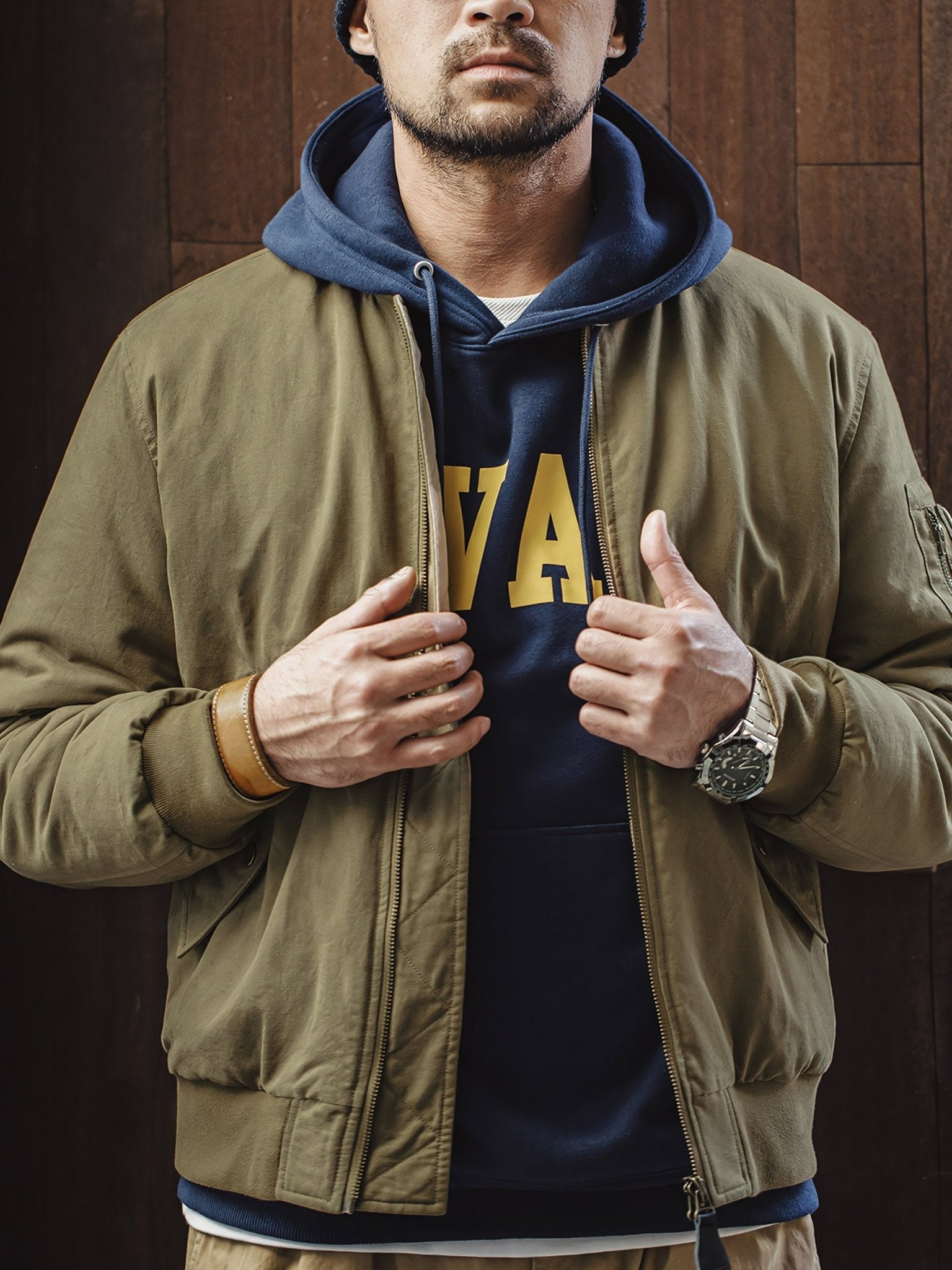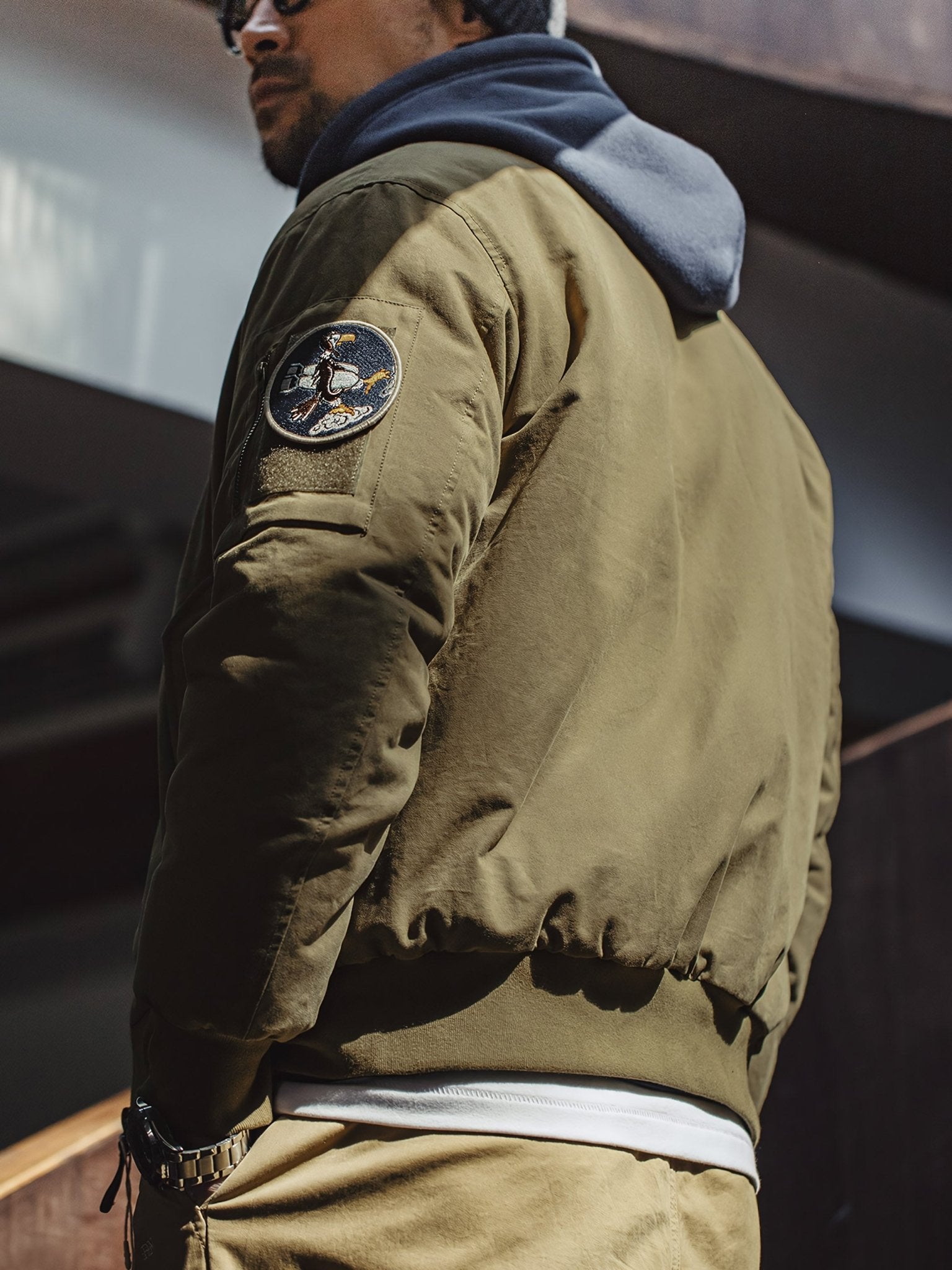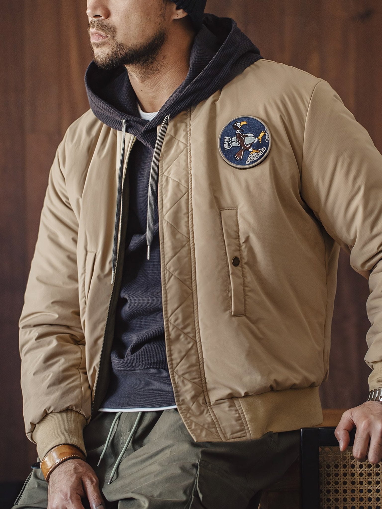 ポリエステル生地は程よい光沢感と高級感があり、武骨で耐久性があり、実用的な機能美が際立っています。中綿入りなので、ふんわりとした質感で保温性が優れ、冬のアクセントとして最適です。