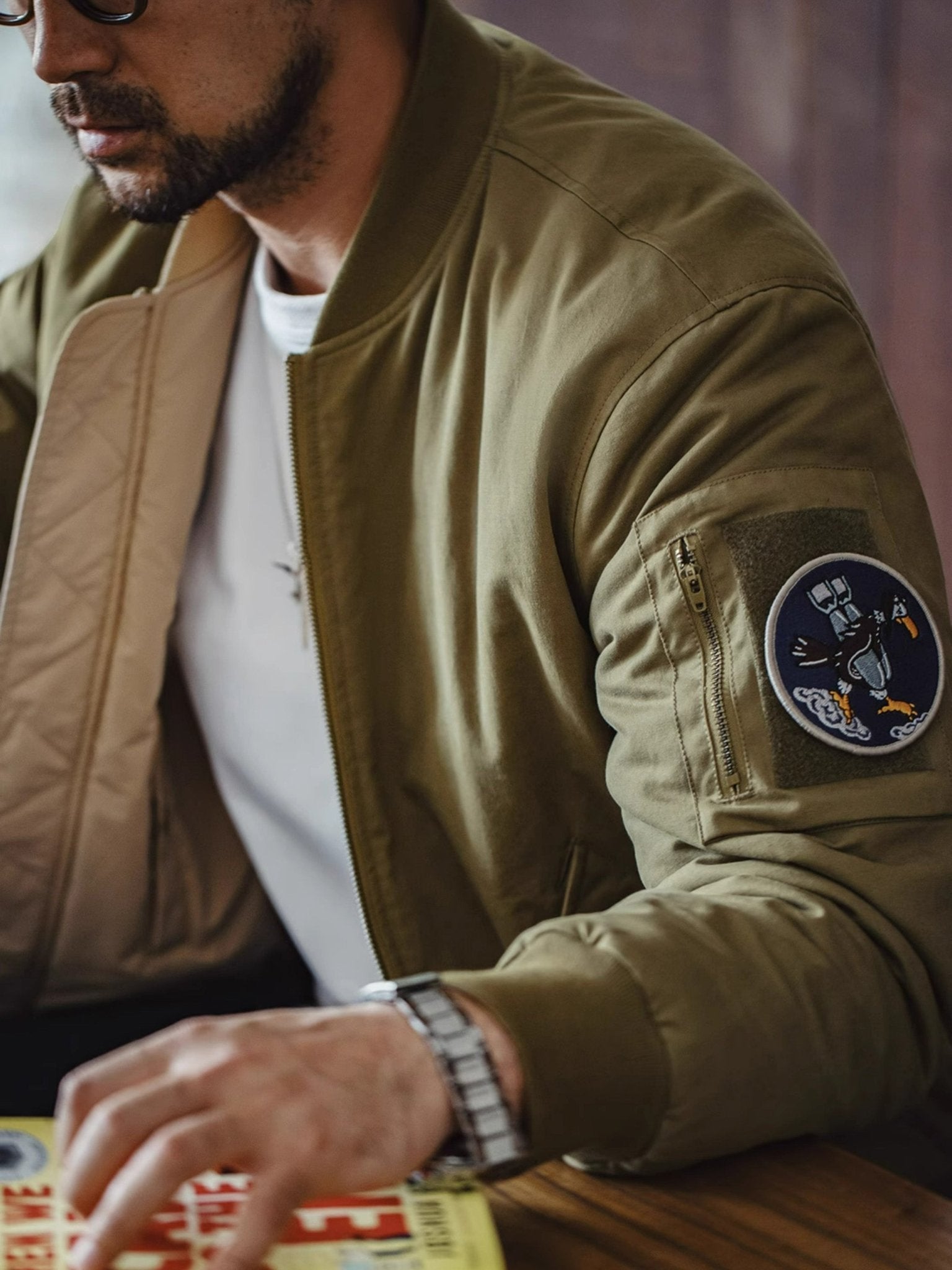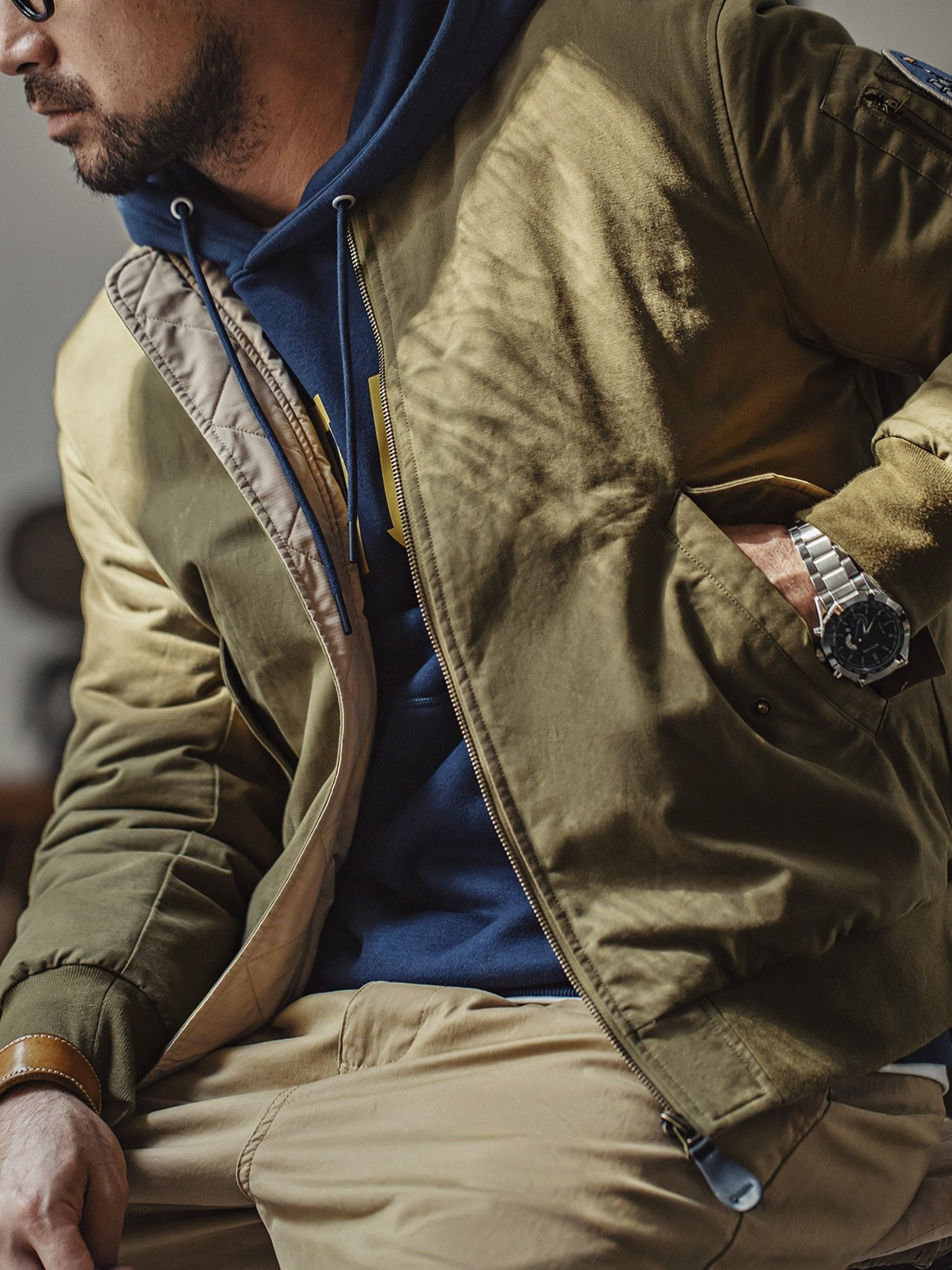リバーシブルな仕様で、A面はアーミーグリーンで、深い緑色が軍用のような雰囲気を醸し出し、B面はカーキで、淡い茶色やオリーブ色を基調とし、よりカジュアルなスタイルが特徴です。胸元や袖にはDIY可能なマジックテープが付いており、パッチやワッペンの取り付け、ポケットの追加など、カスタマイズが可能です。
