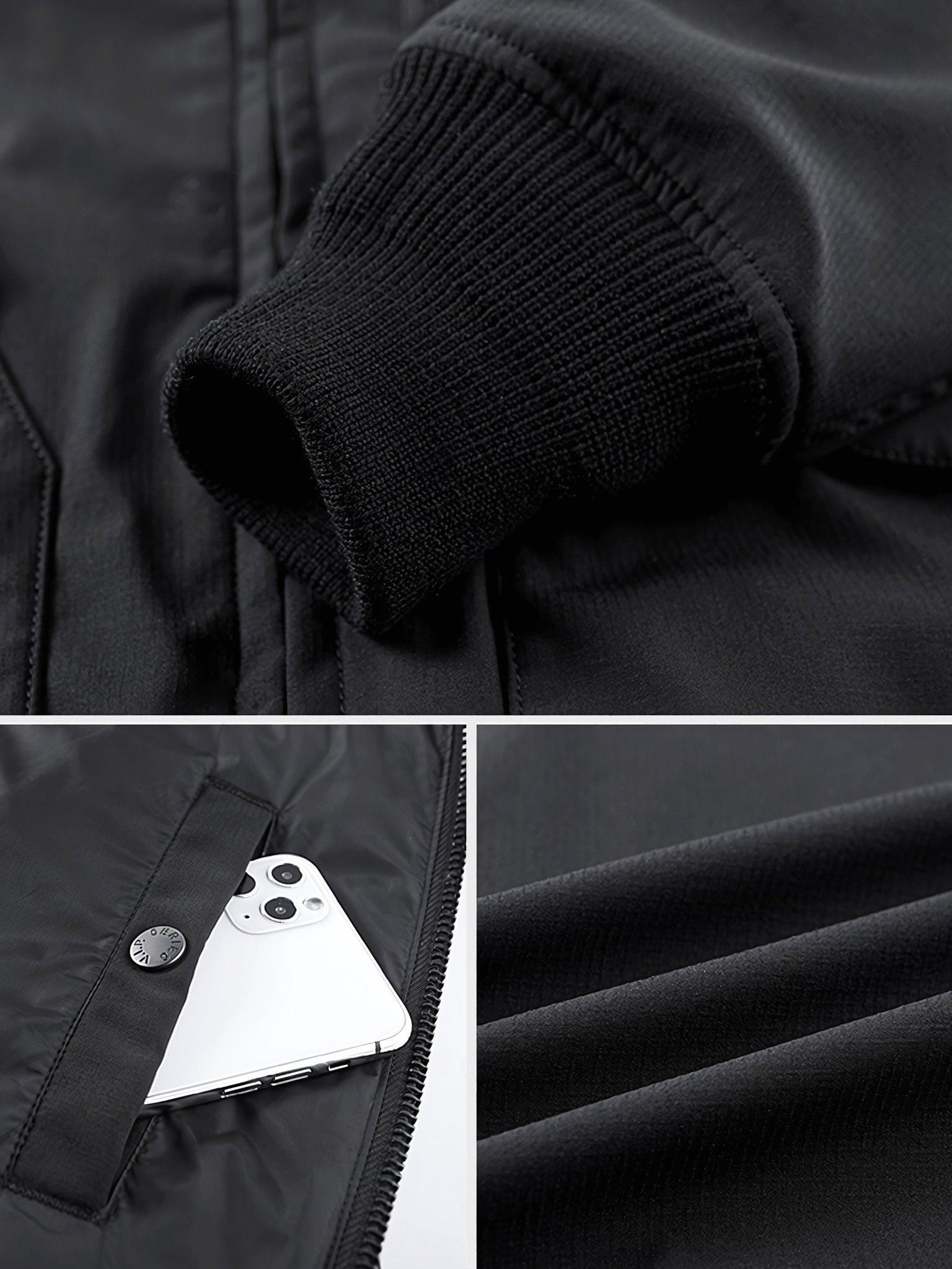 防水加工ナイロン生地は摩耗に強く風を防ぐ性能を持っており、優れた保温性を提供します。この生地はジャケットの快適さと耐久性を確保し、さまざまな場面で着用するのに適しています。