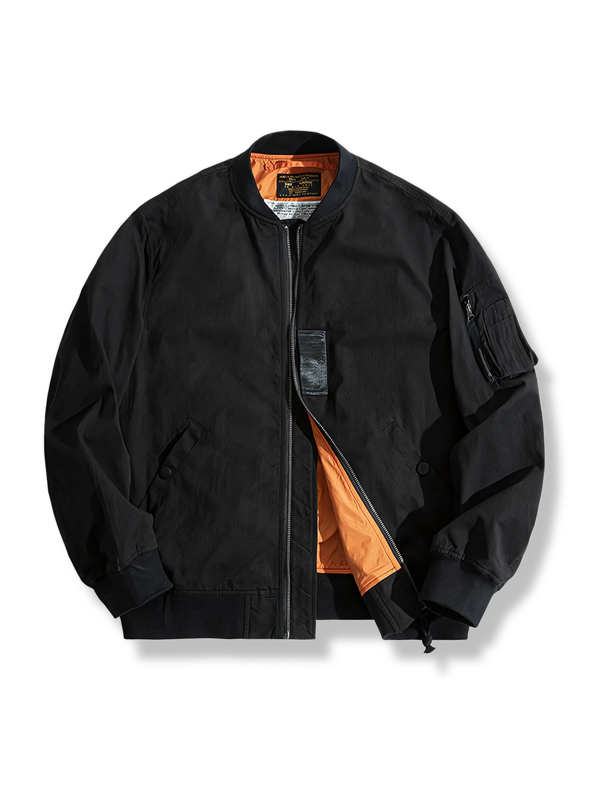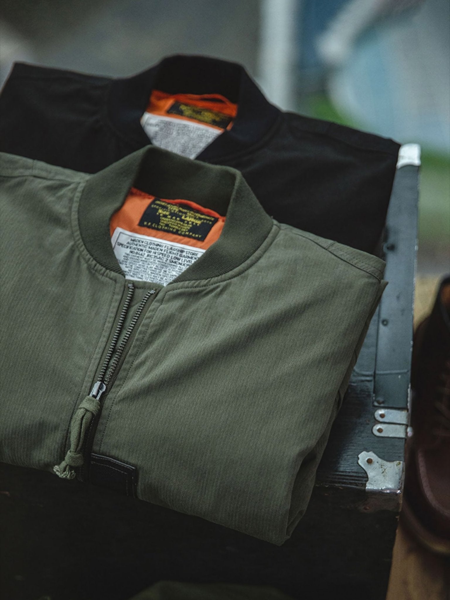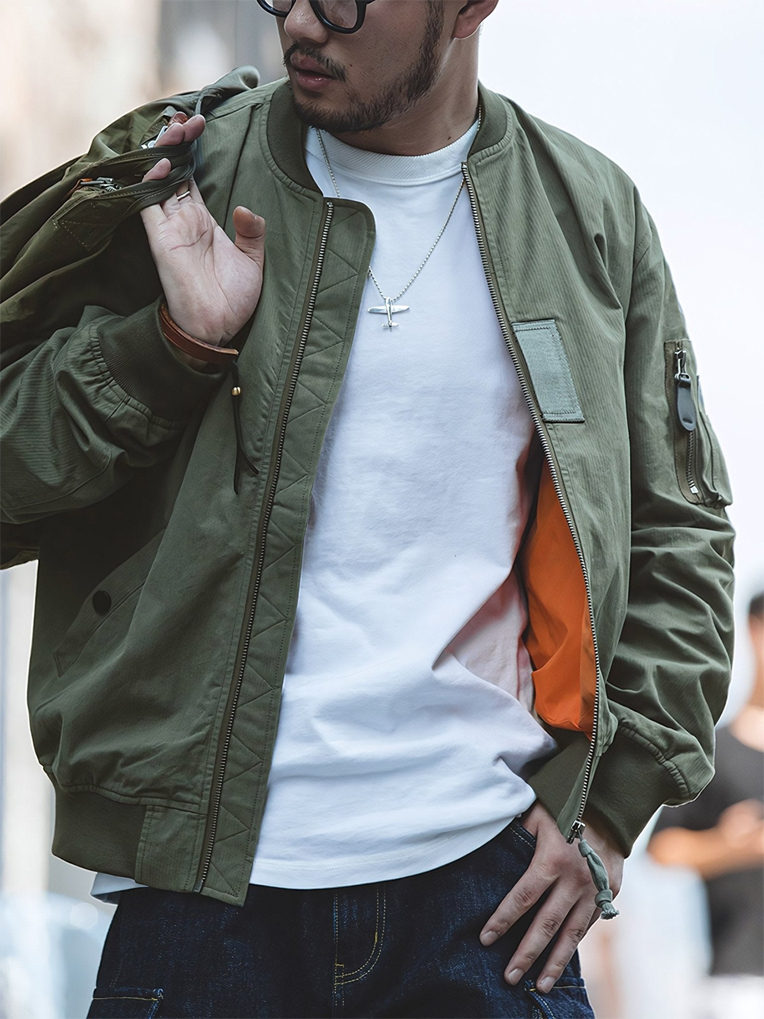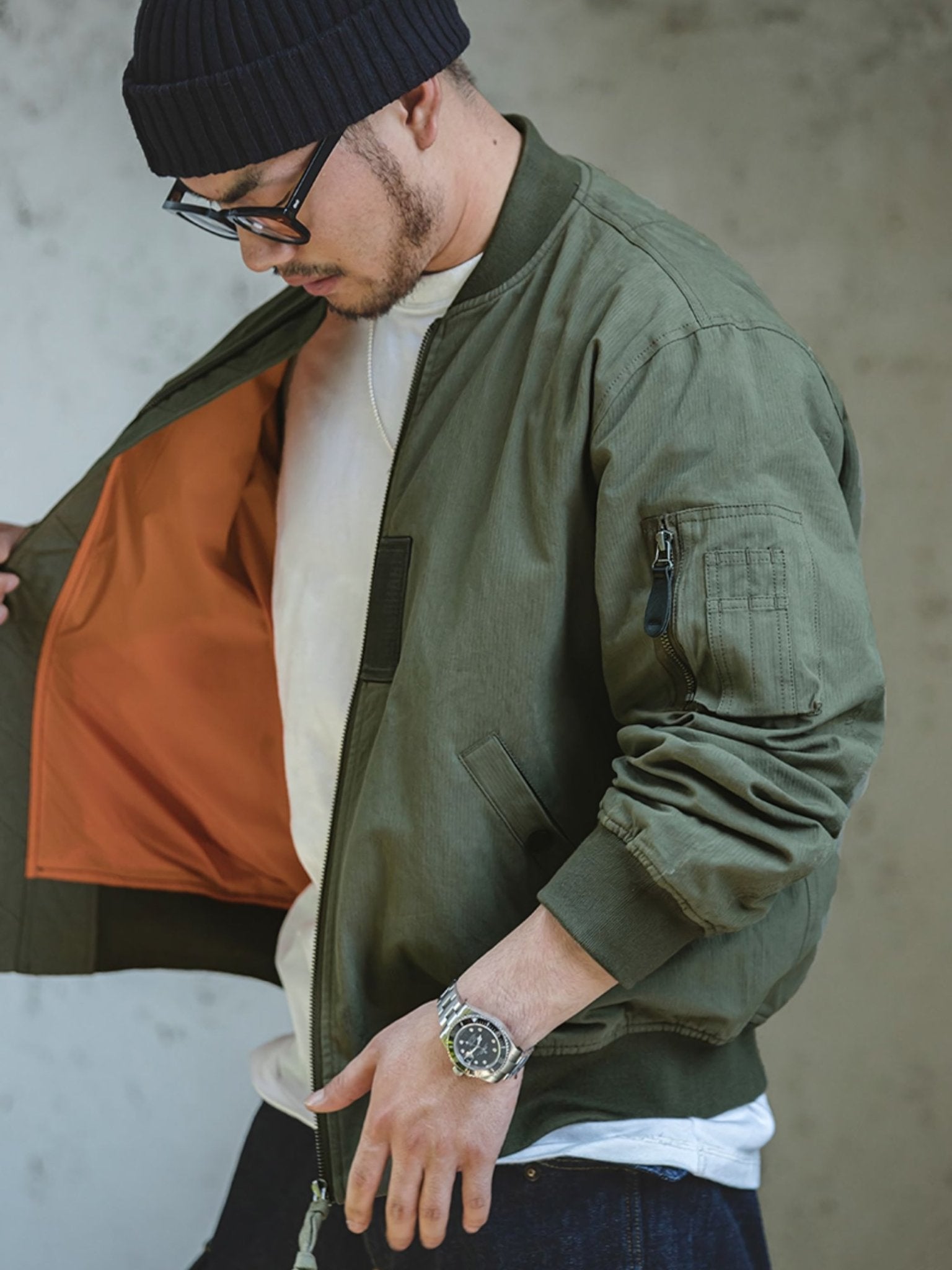 耐久性があり、実用的な機能美が魅力のアウターです。このMA-1フライトジャケットの裏地は、レスキューオレンジの色合いをしています。袖口にはポケットが付いており、美しさに加え機能性も備えています。