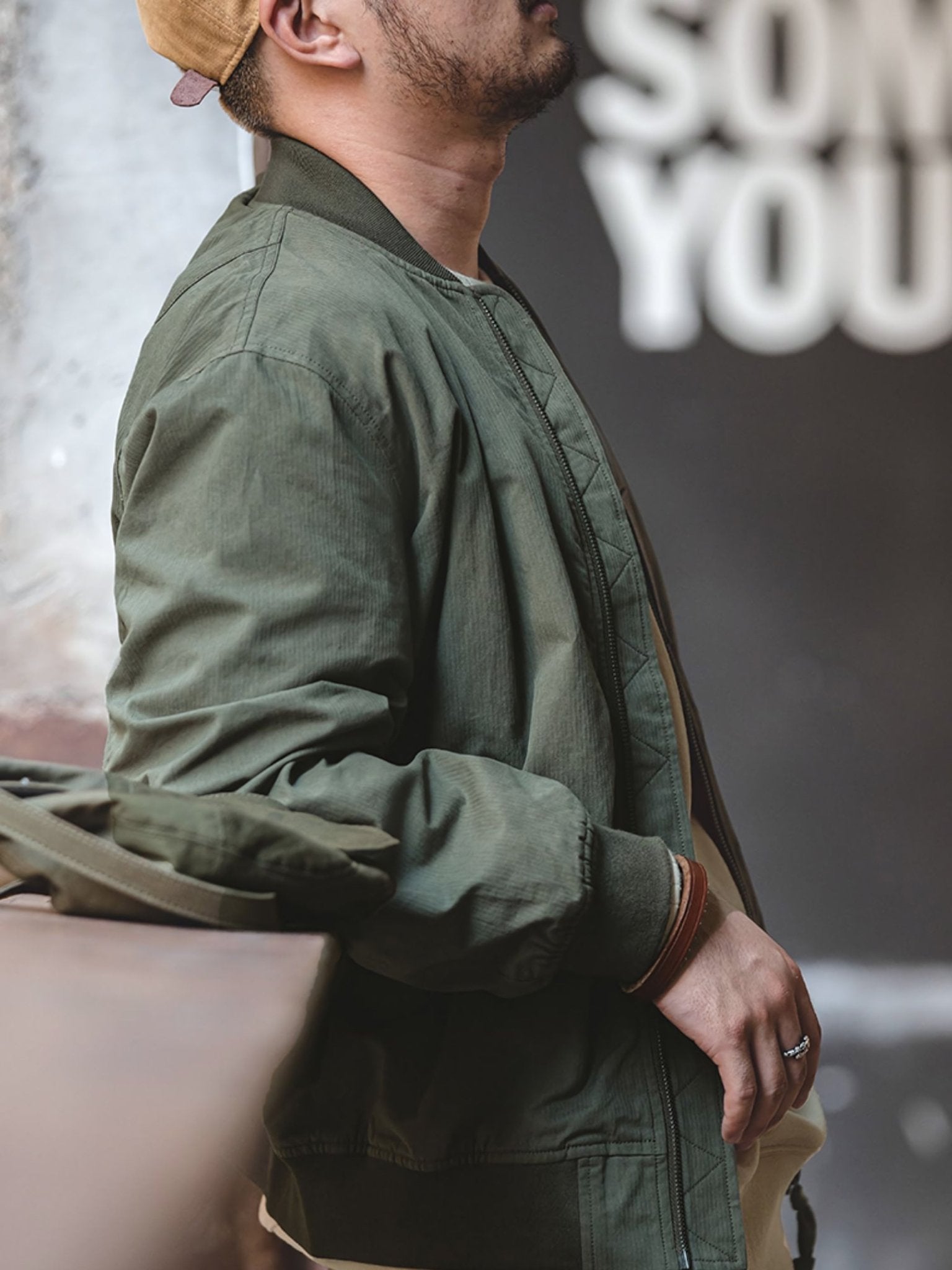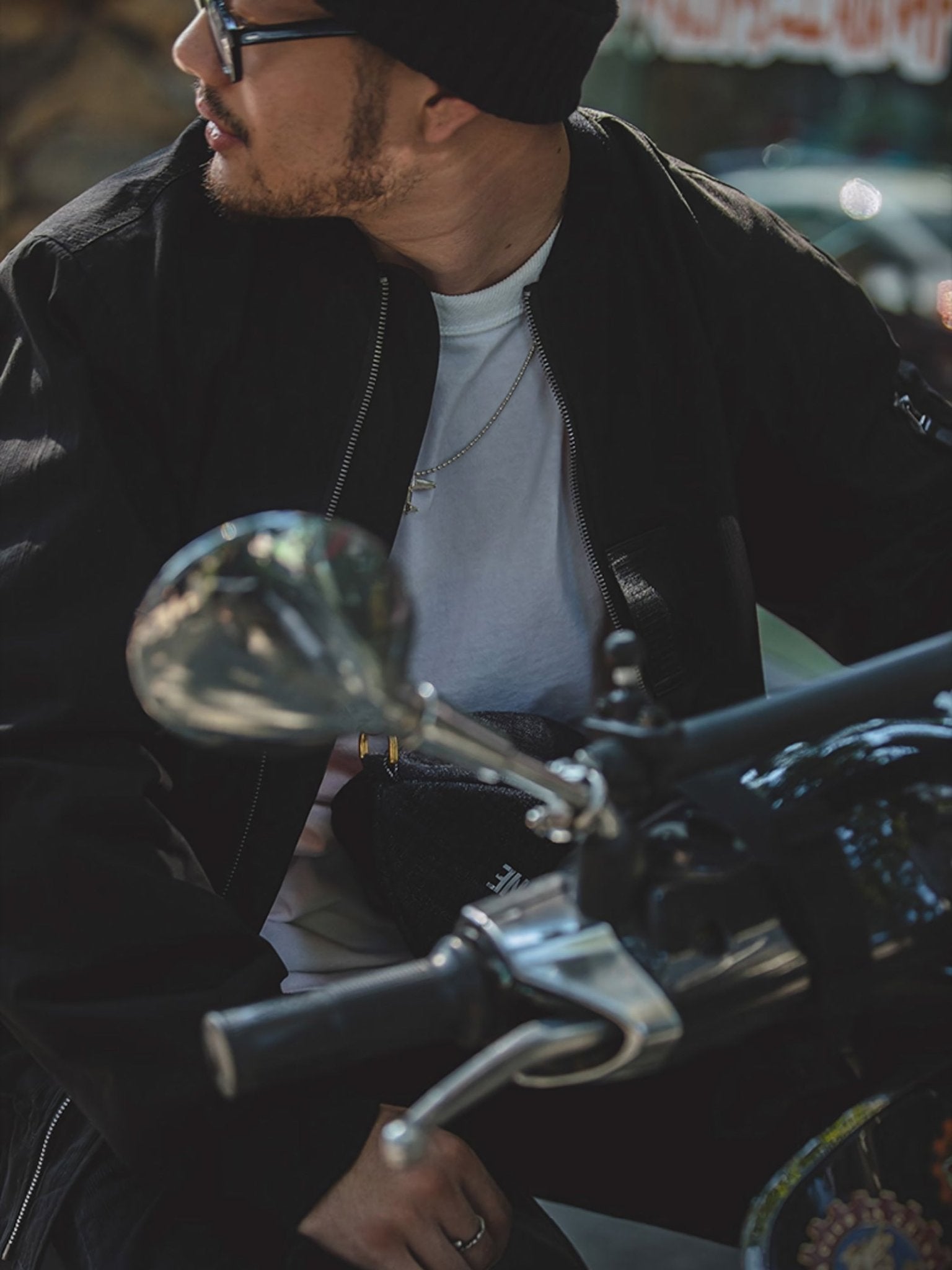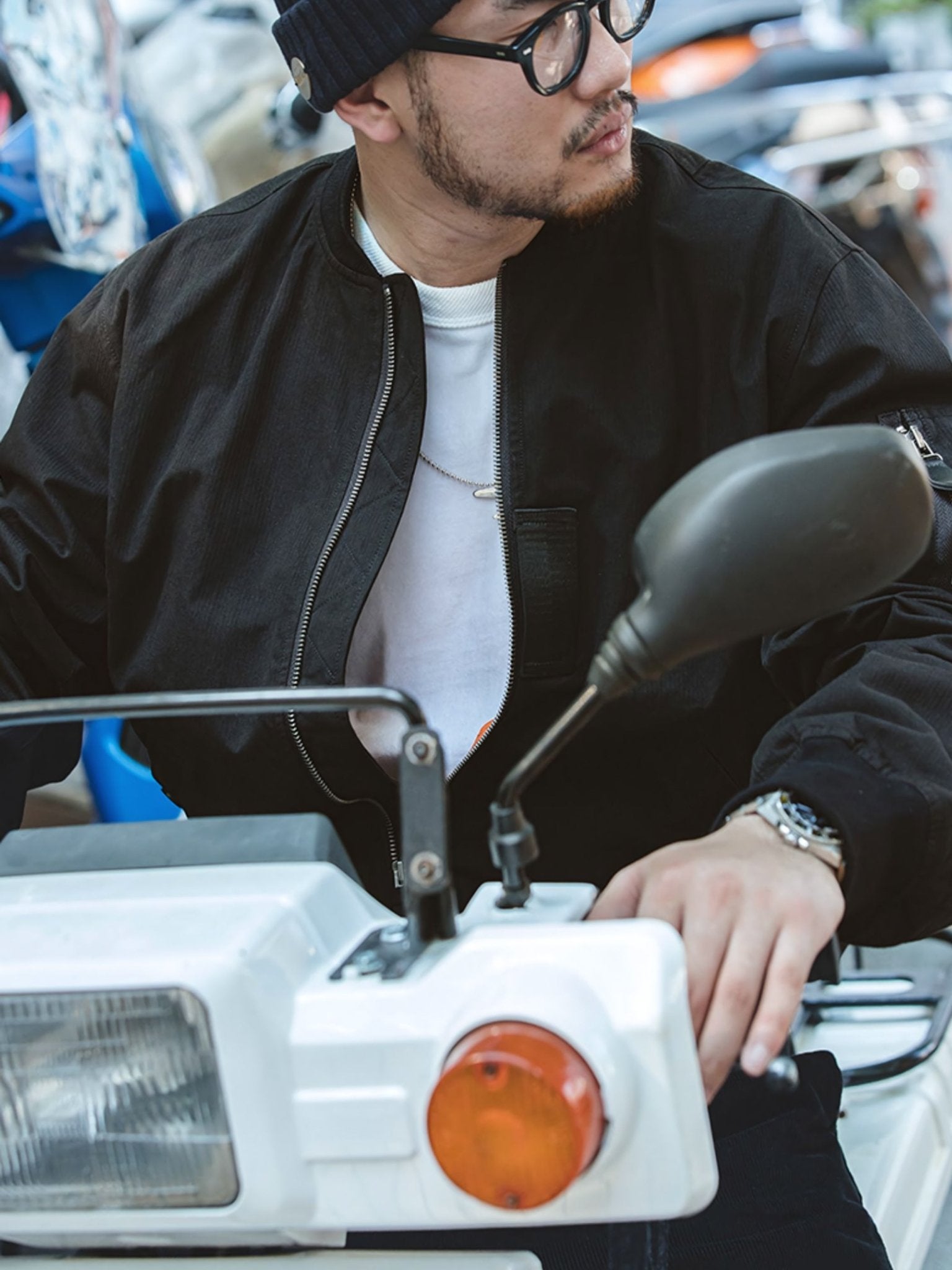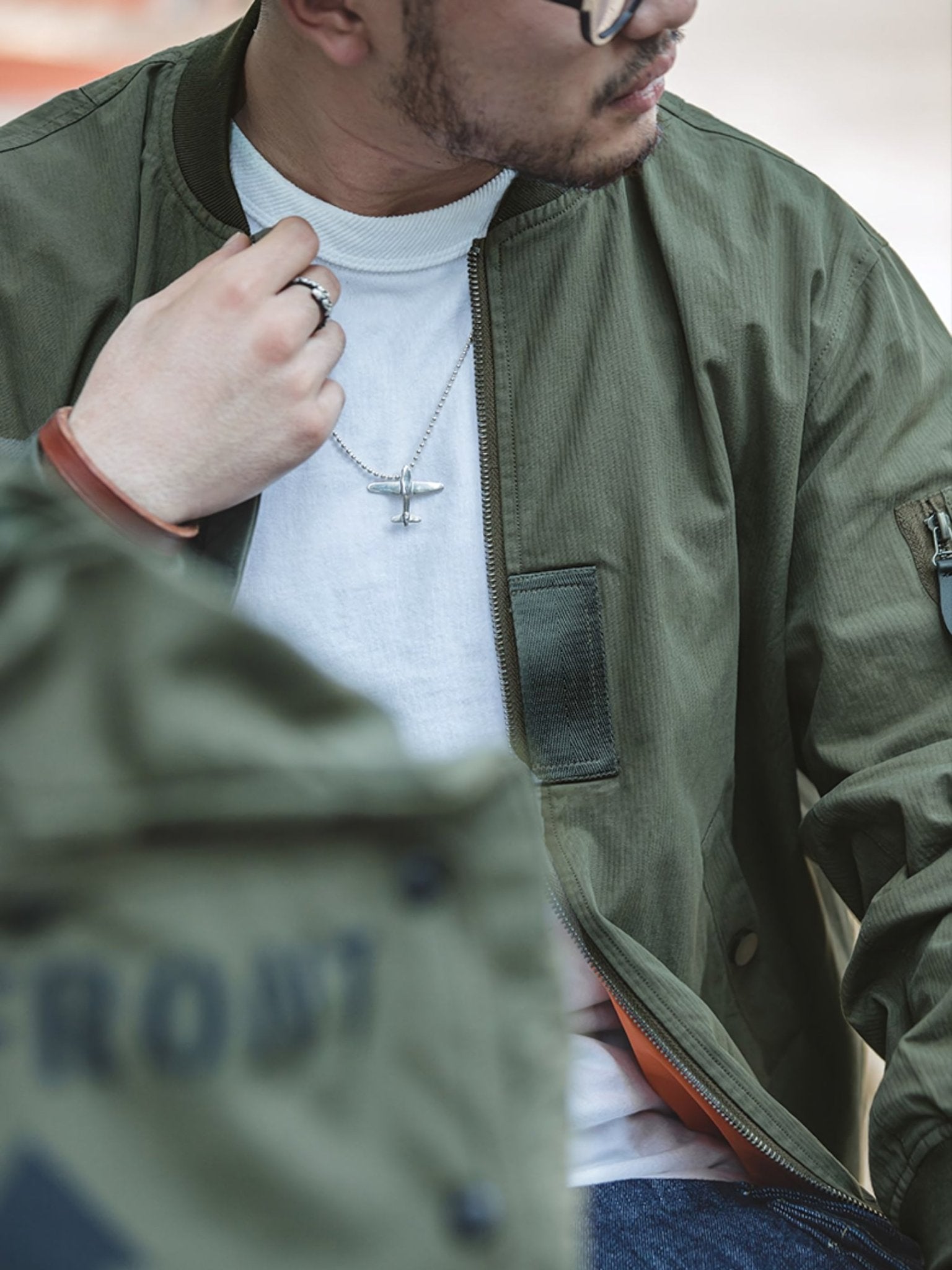 耐久性があり、実用的な機能美が魅力のアウターです。このMA-1フライトジャケットの裏地は、レスキューオレンジの色合いをしています。袖口にはポケットが付いており、美しさに加え機能性も備えています。