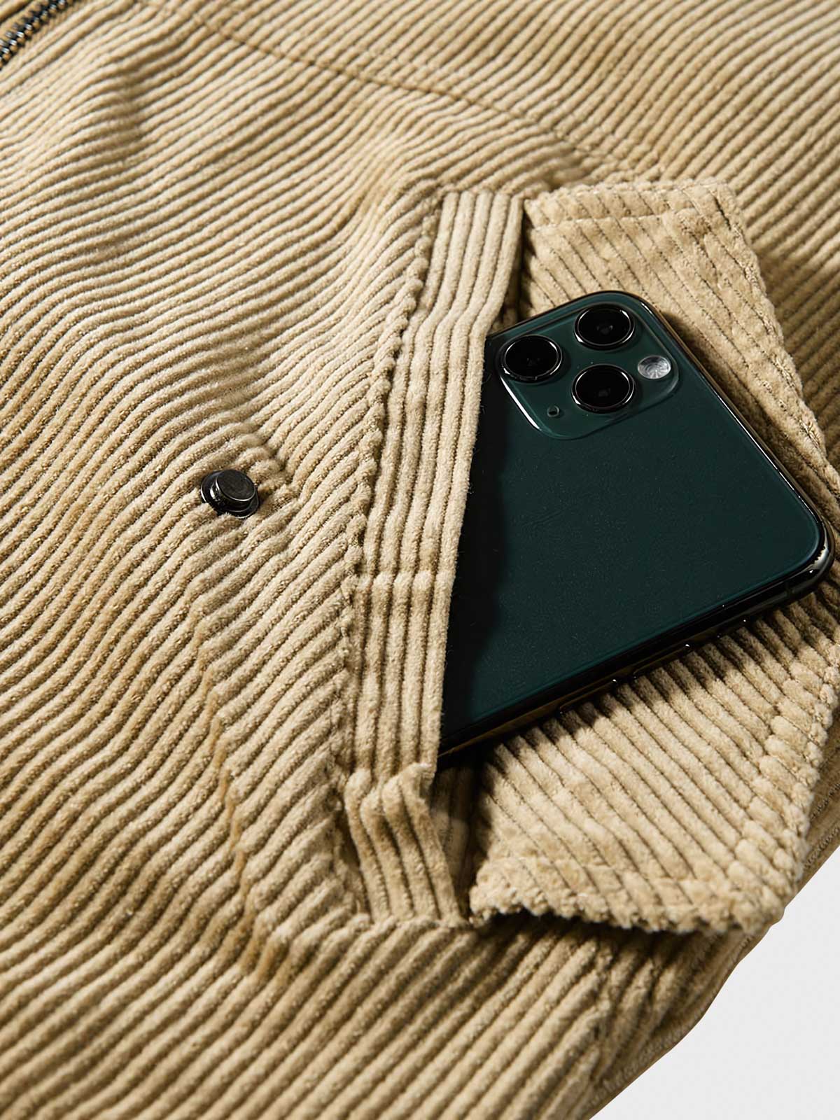 襟、袖や裾にはリブを配置し、フラップ同様、外からの風を防ぎジャケット内をあたたかく保つ。また、組み合わされたアームポケットは、ジャケット全体に上品な雰囲気を与え、このジャケットをよりユニークでおしゃれなものにしています。コーデュロイ素材がカジュアルな雰囲気を加え、日常着に適しています。